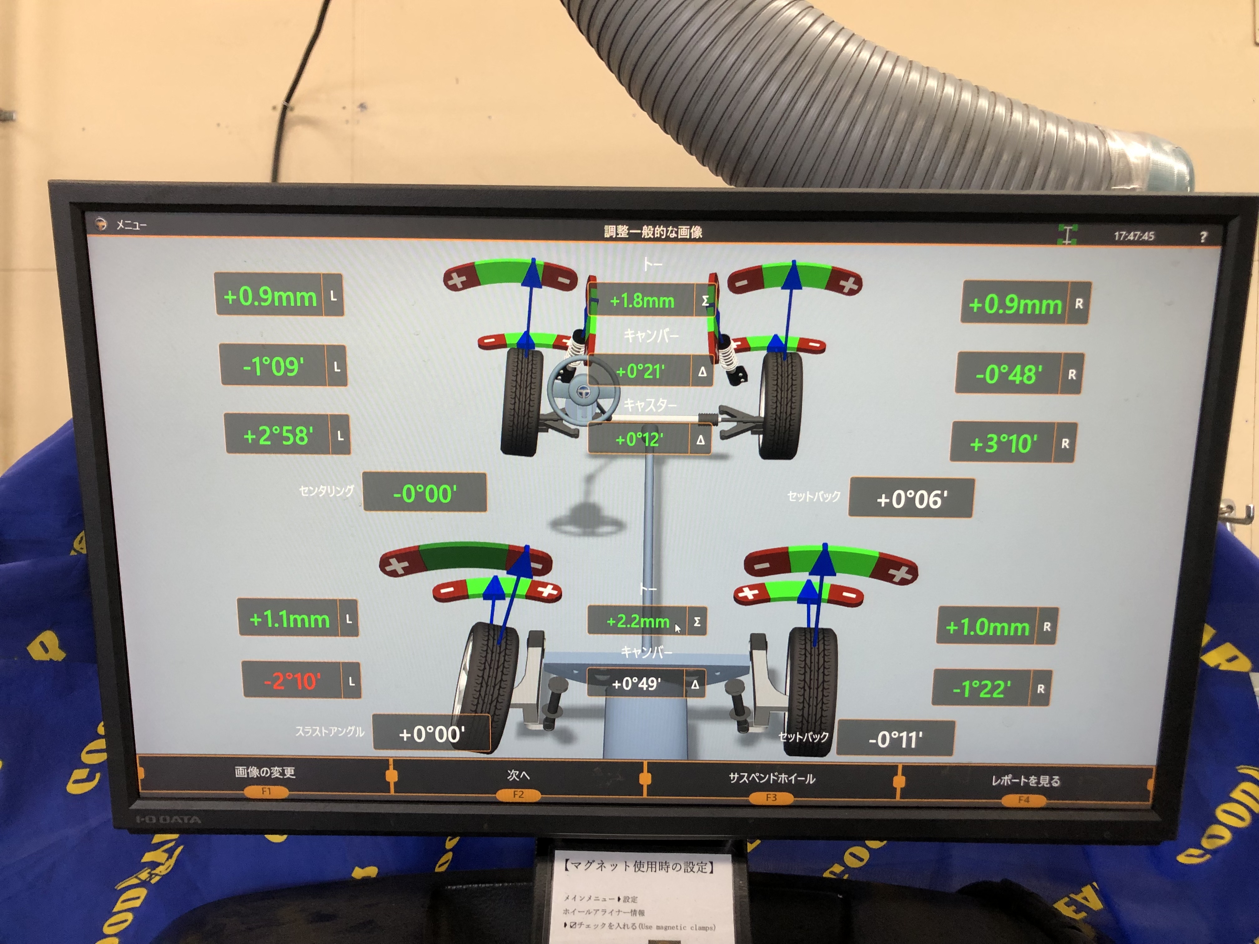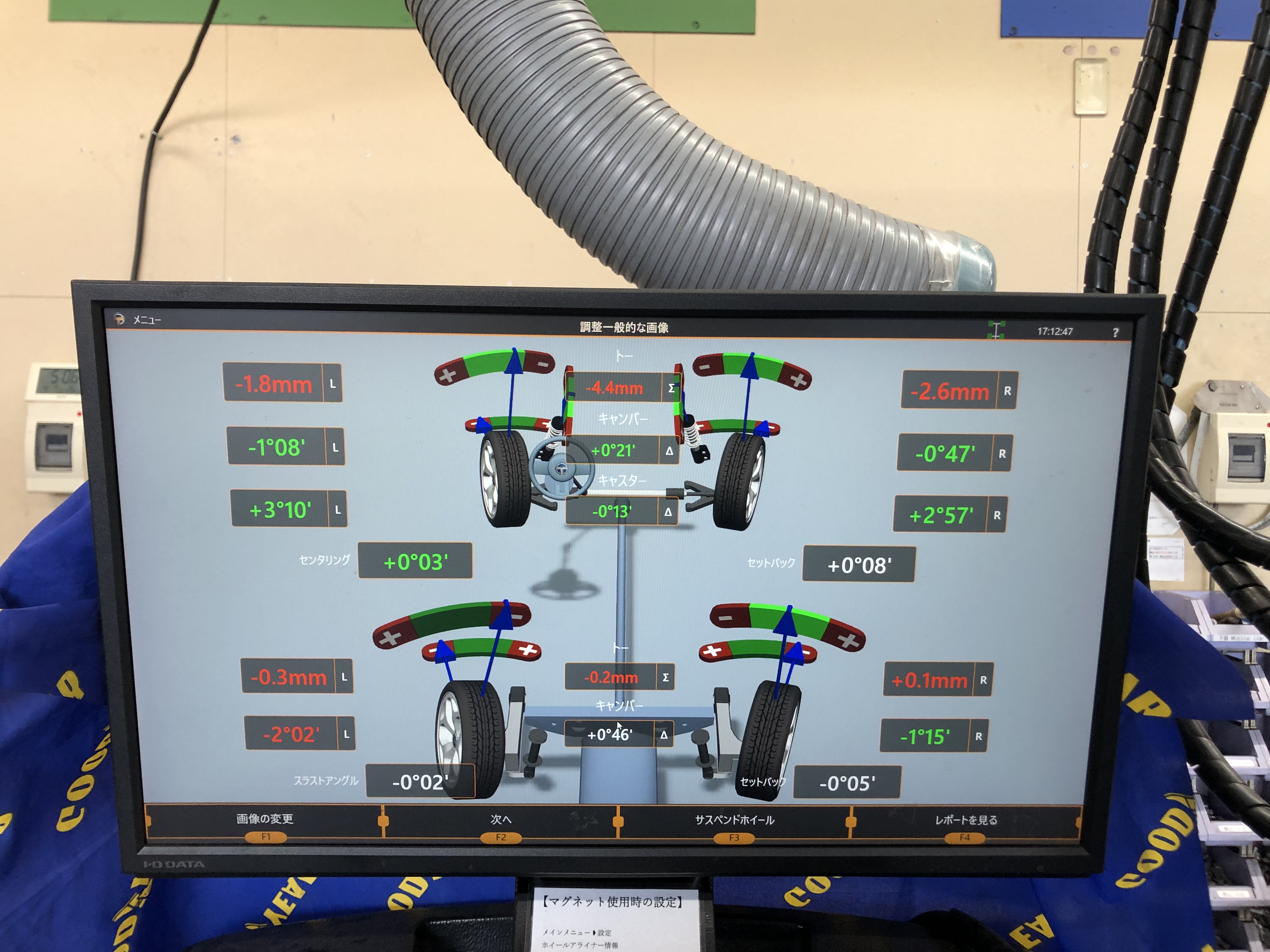 予想通り、トーアウト!前輪を見ていただくとタイヤが外側に向いていますね。基準値に比べて上から見て内側に向いているか外側に向いているかを示すトー角がかなり-になってしまっています。