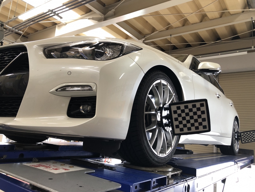 V37スカイラインのお客様にアライメント調整をご依頼いただきました。足回りを変更されたとのことです。