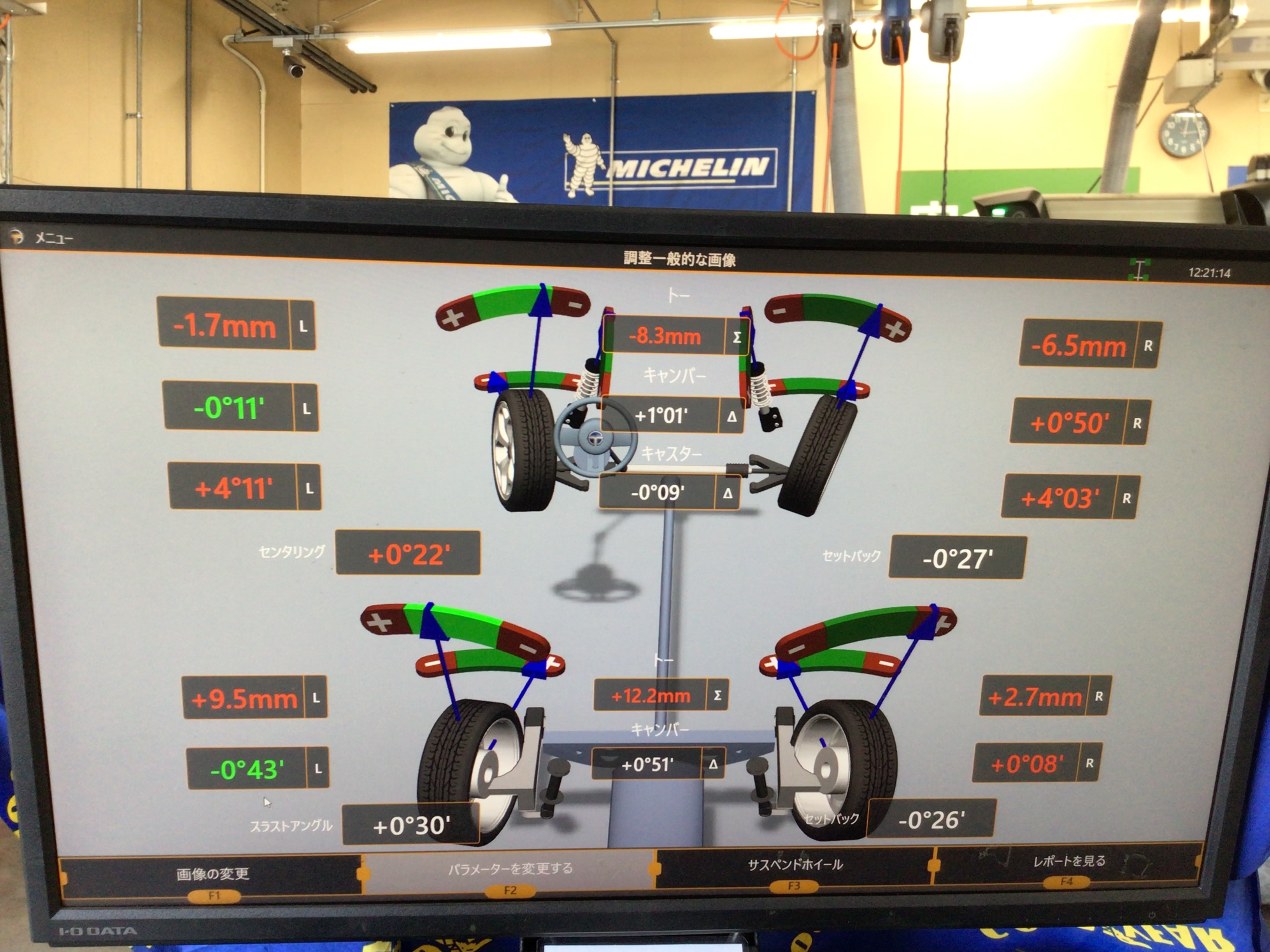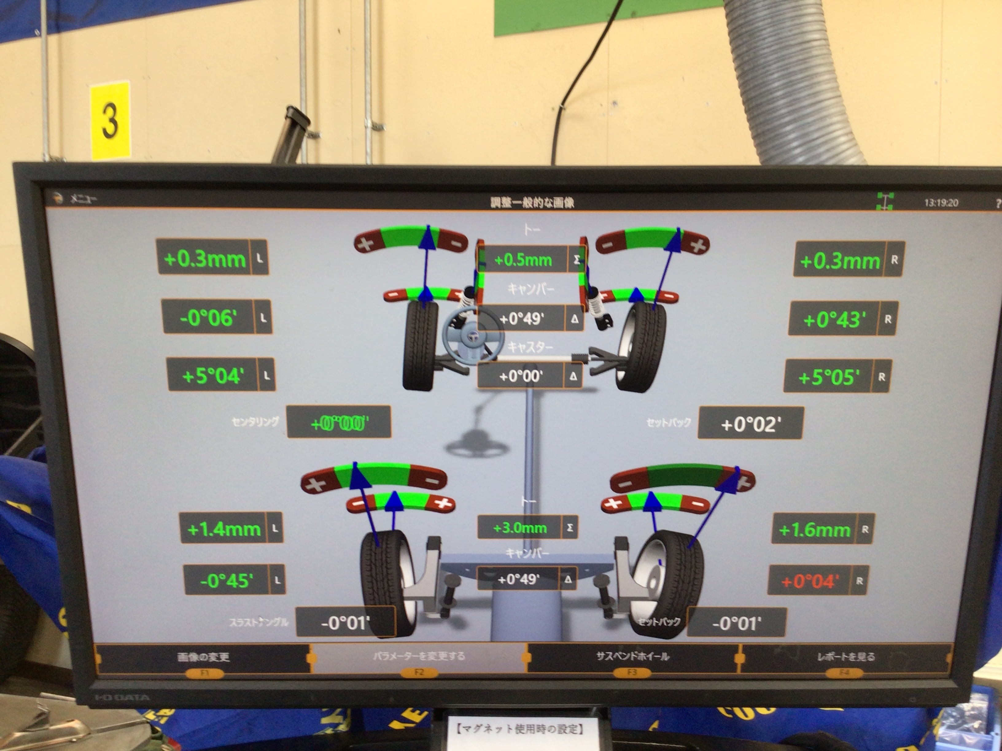足回りのブッシュ類など交換をされたということと年数が経っている車の為、アライメント調整をしておきたいということでした。