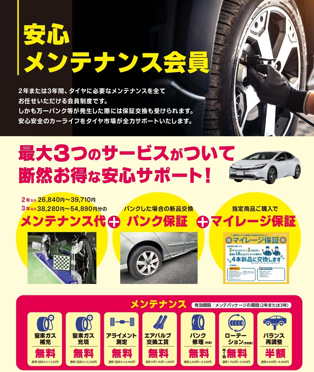 当店でタイヤご購入時に安心メンテナンス会員になっていただくと、2年間のメンテナンス+パンク保証がセットになった安心サポートを受けていただけます(`・ω・´)✨