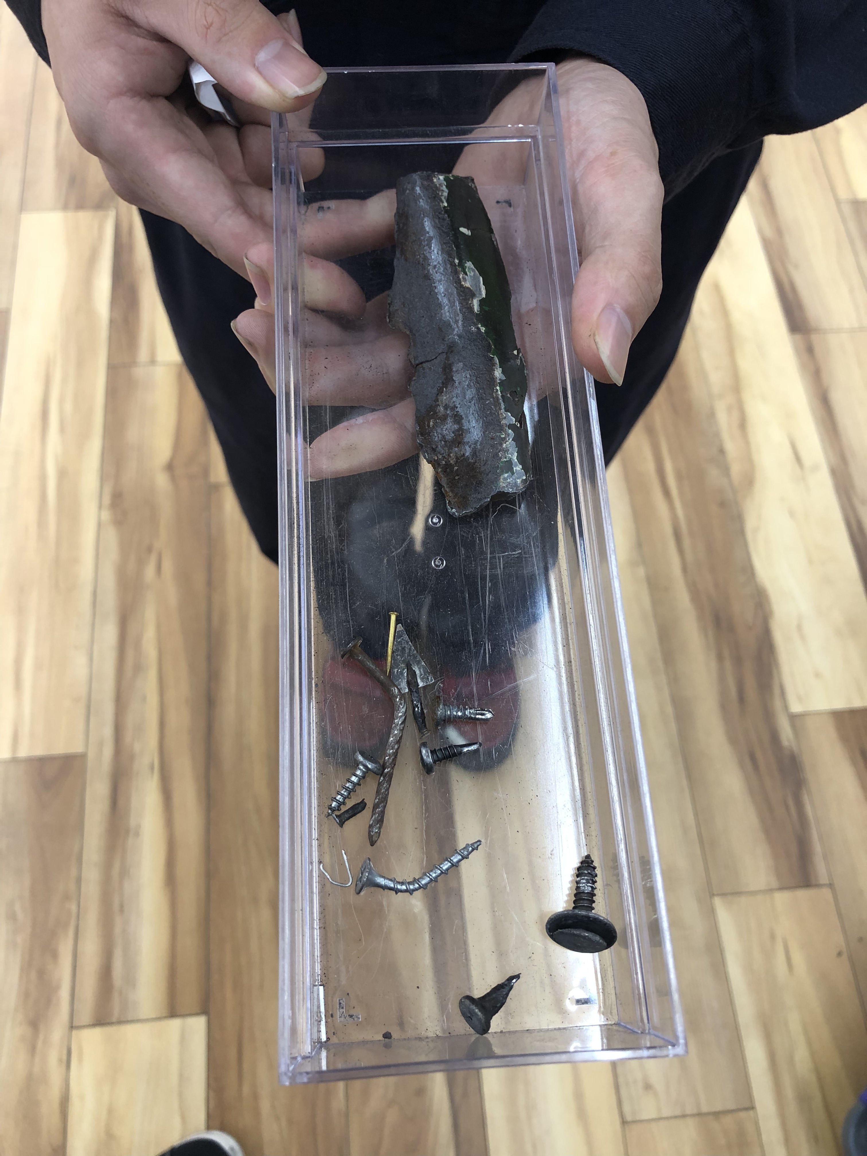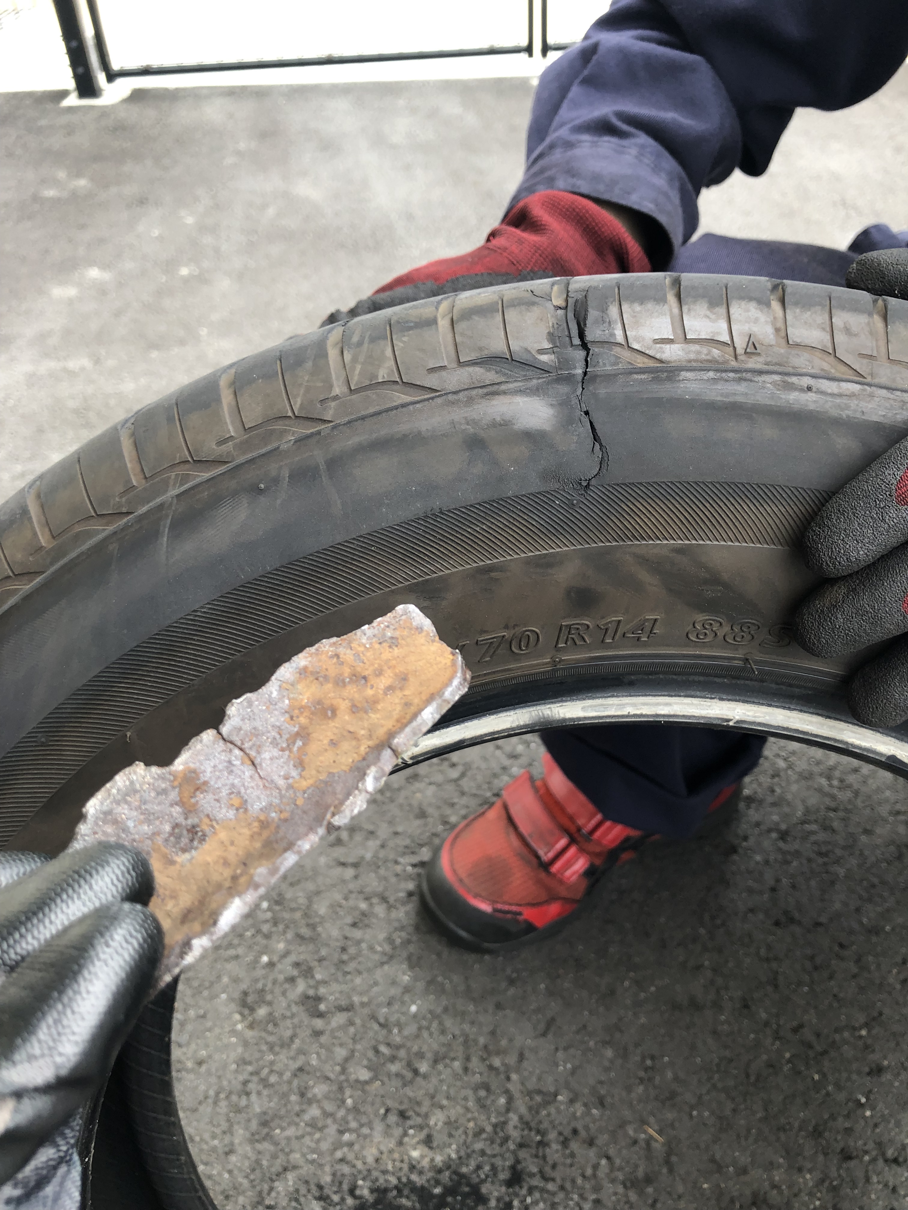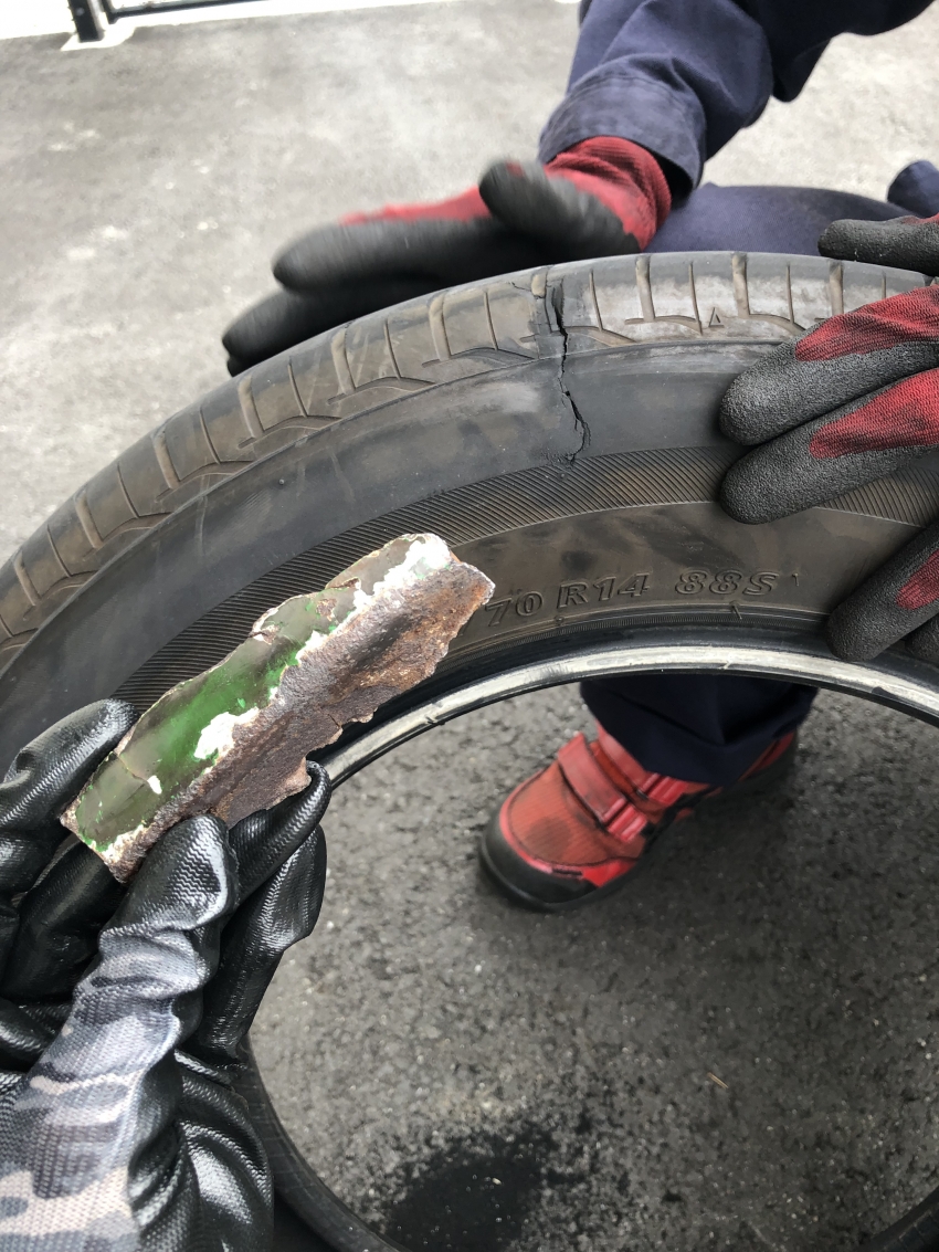 作業完了!!かと思いきや、なんと外したタイヤの中からこんなに大きな金属片が出てきましたΣ(・ω・ノ)ノ!