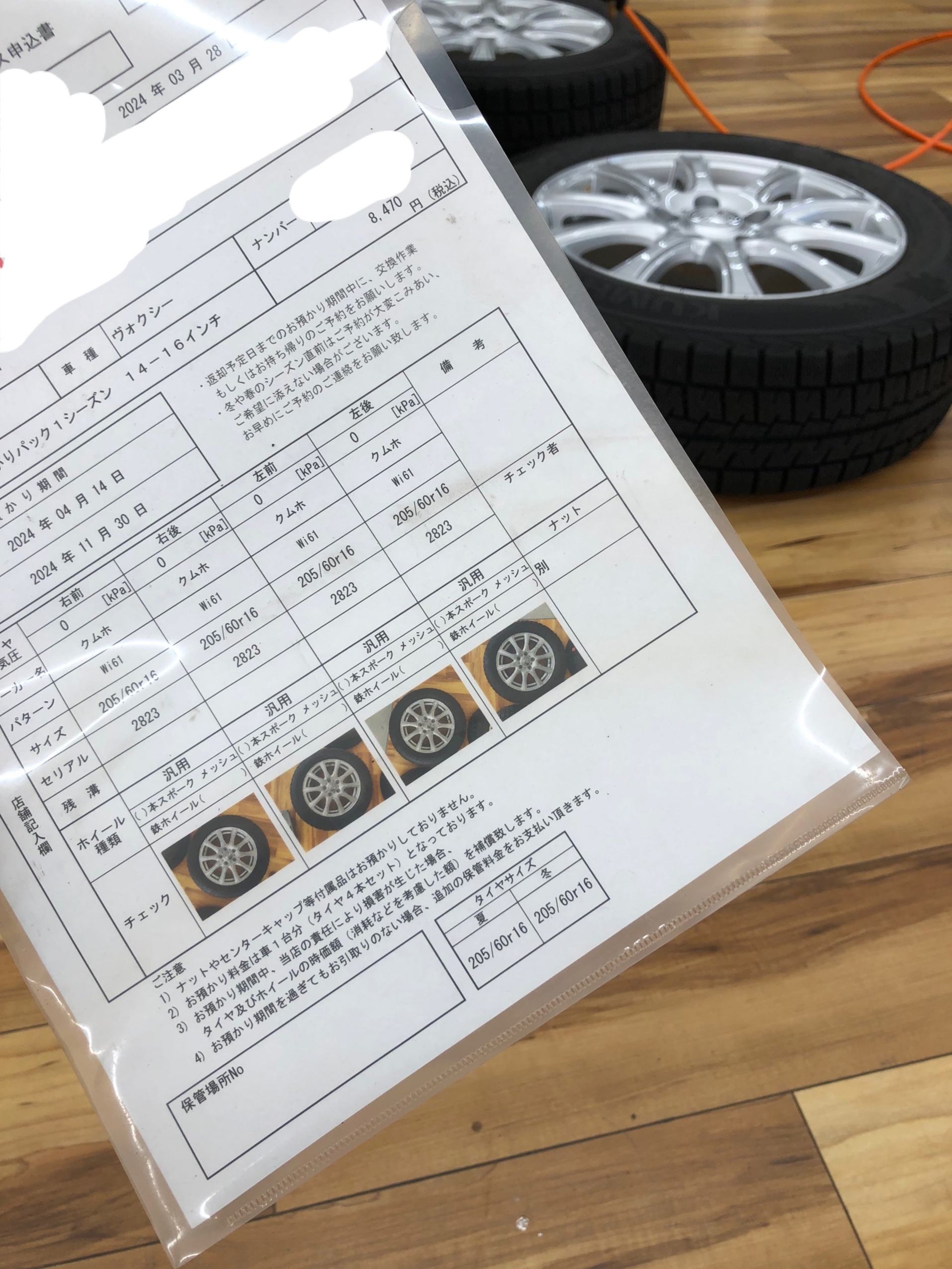 タイヤホテルご加入頂いた後、タイや保管サービス申込書とゆうこちらの用紙を作成し、タイヤ1本ずつの写真を添付し、タイヤの状態を保管・管理致します。