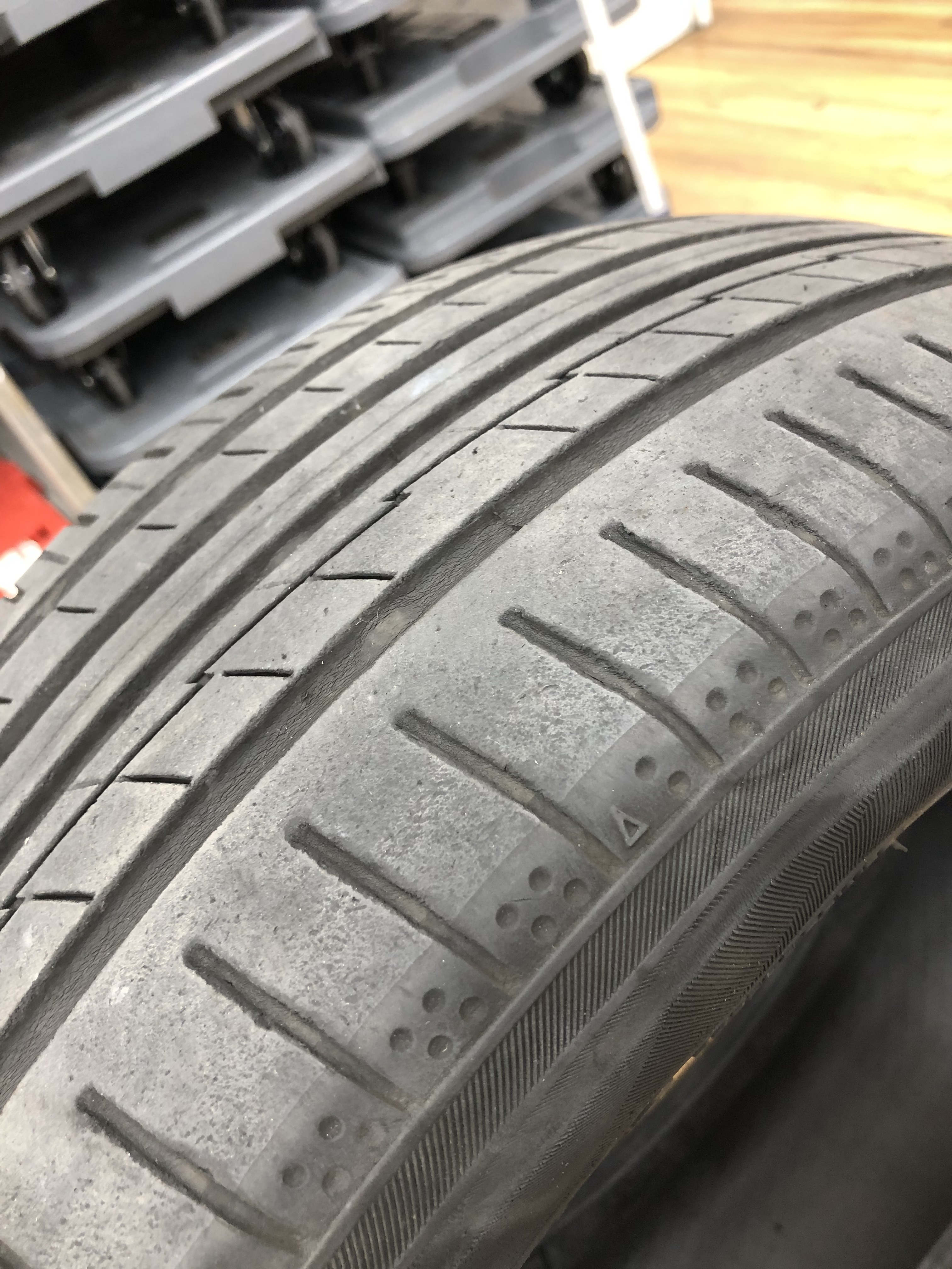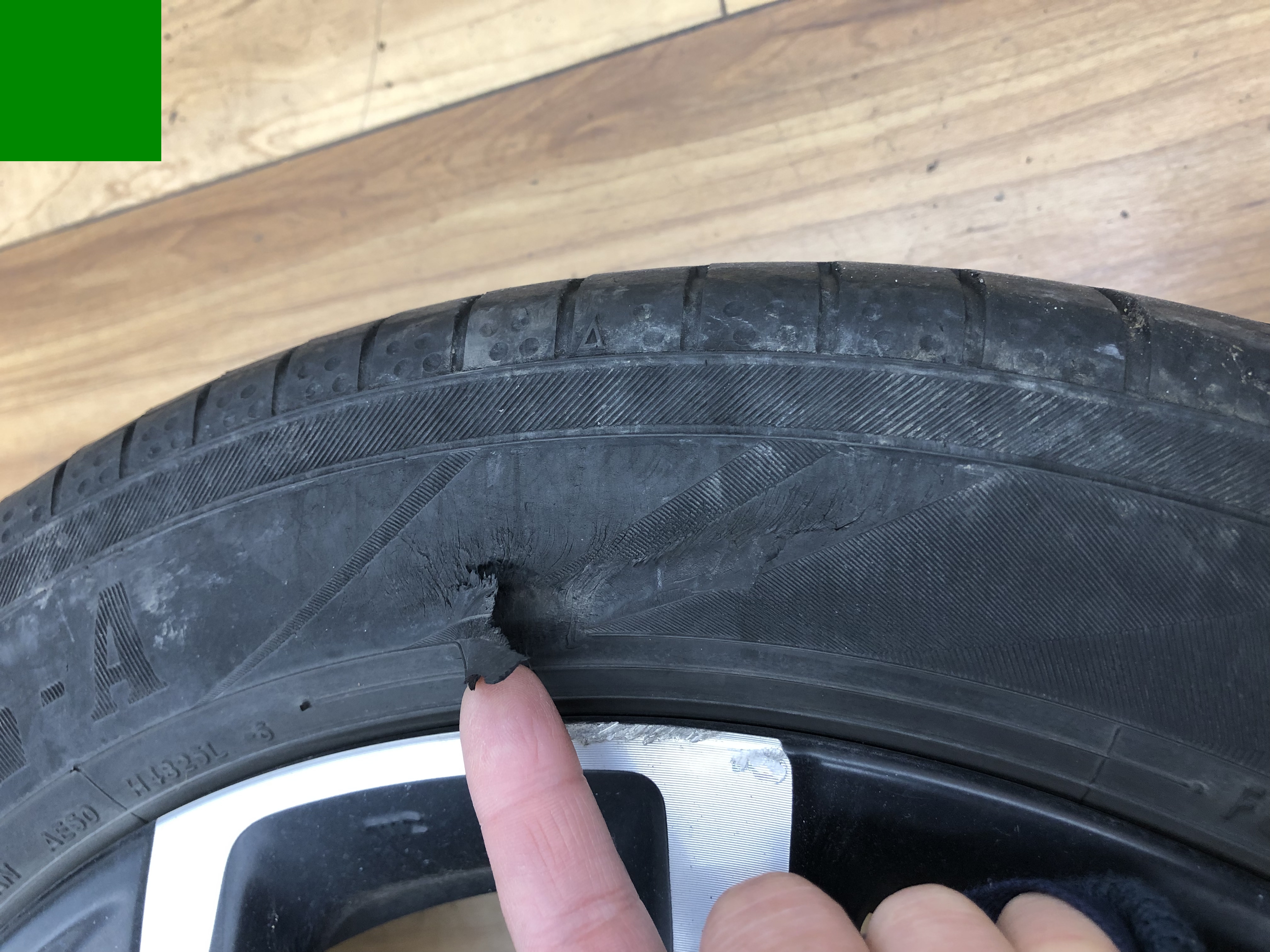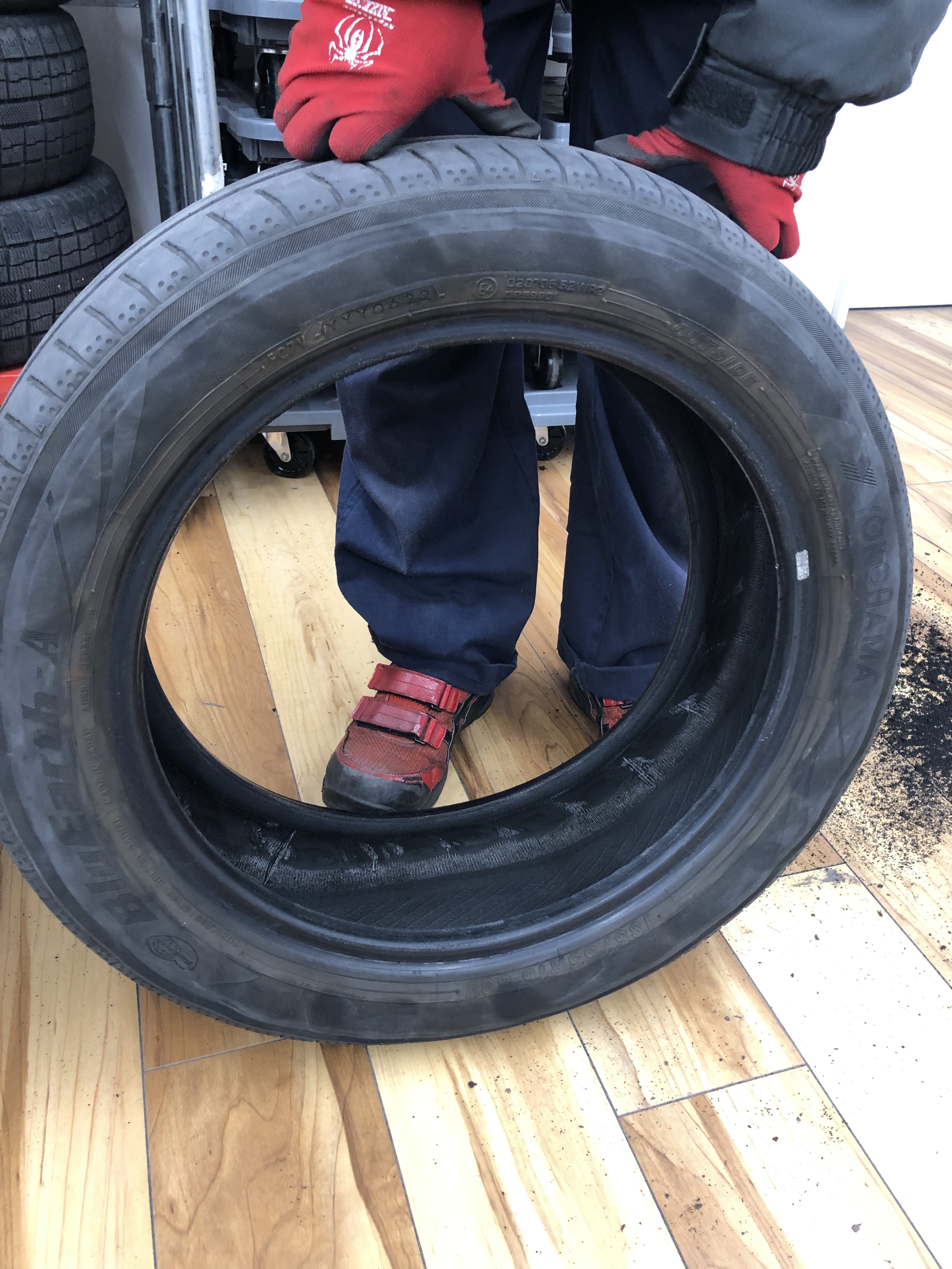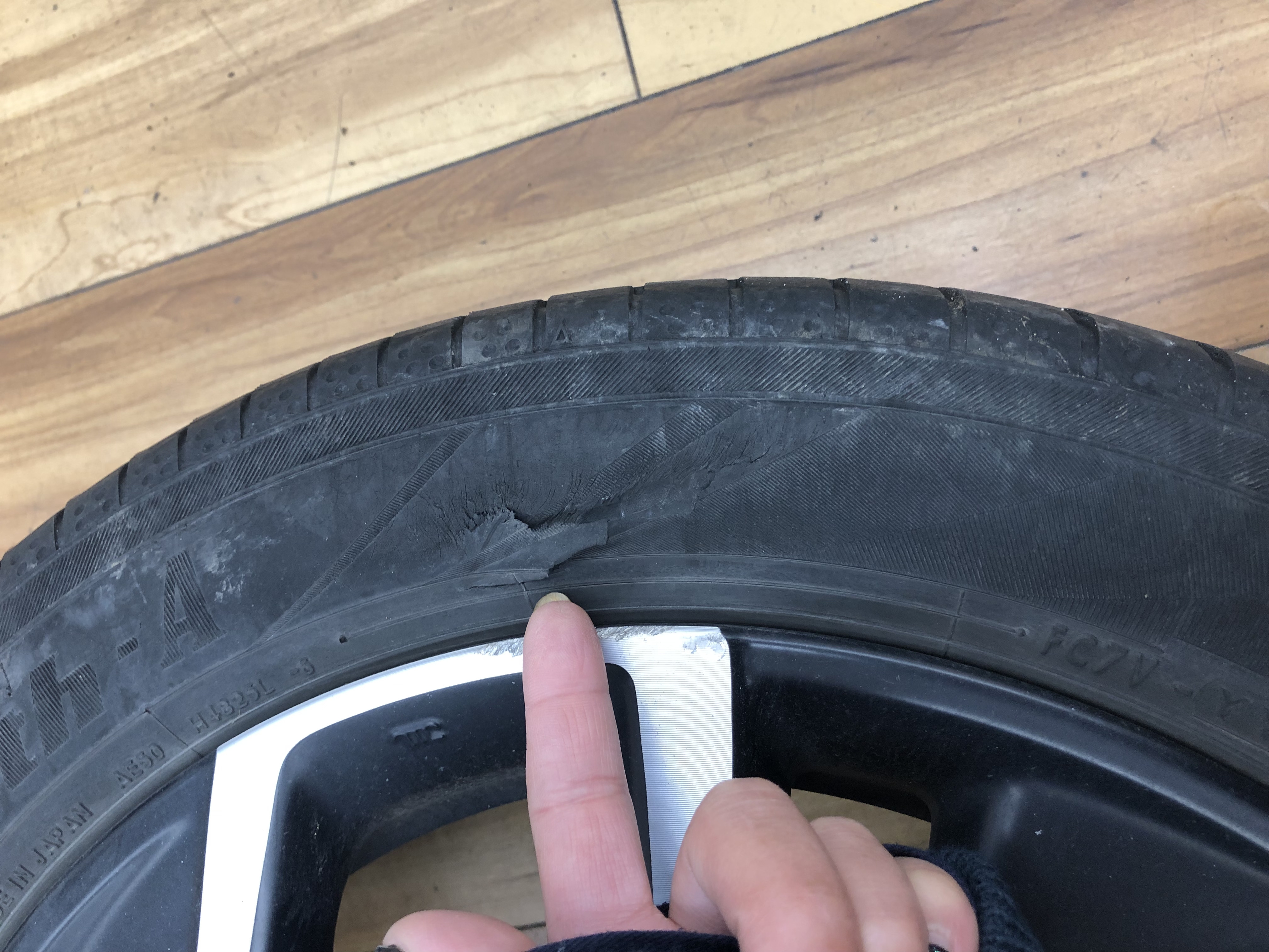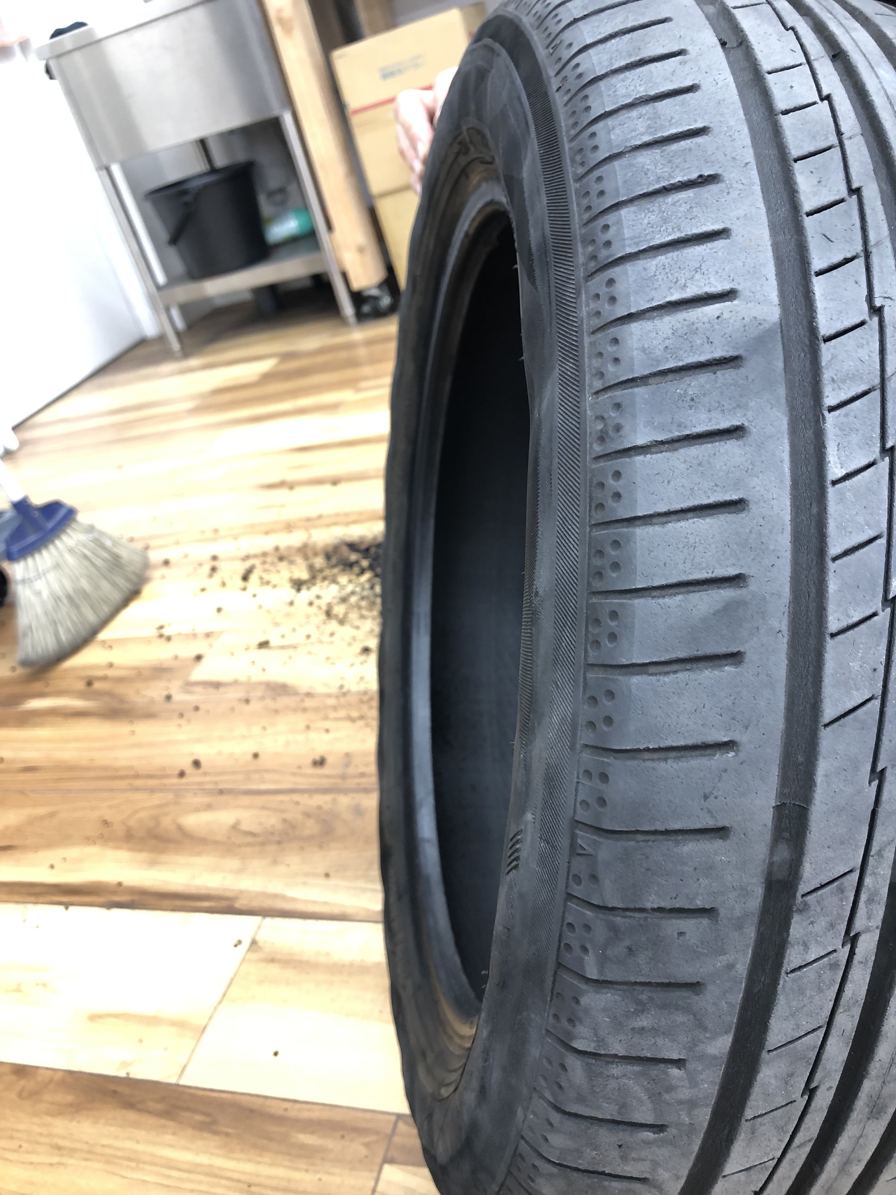 タイヤを見せて頂いたところ全体的に溝が少なく劣化しており、右後ろのタイヤはひび割れが多く、左後ろのタイヤは、側面がこすれて破れていたため、4本交換にて対応させて頂きました。