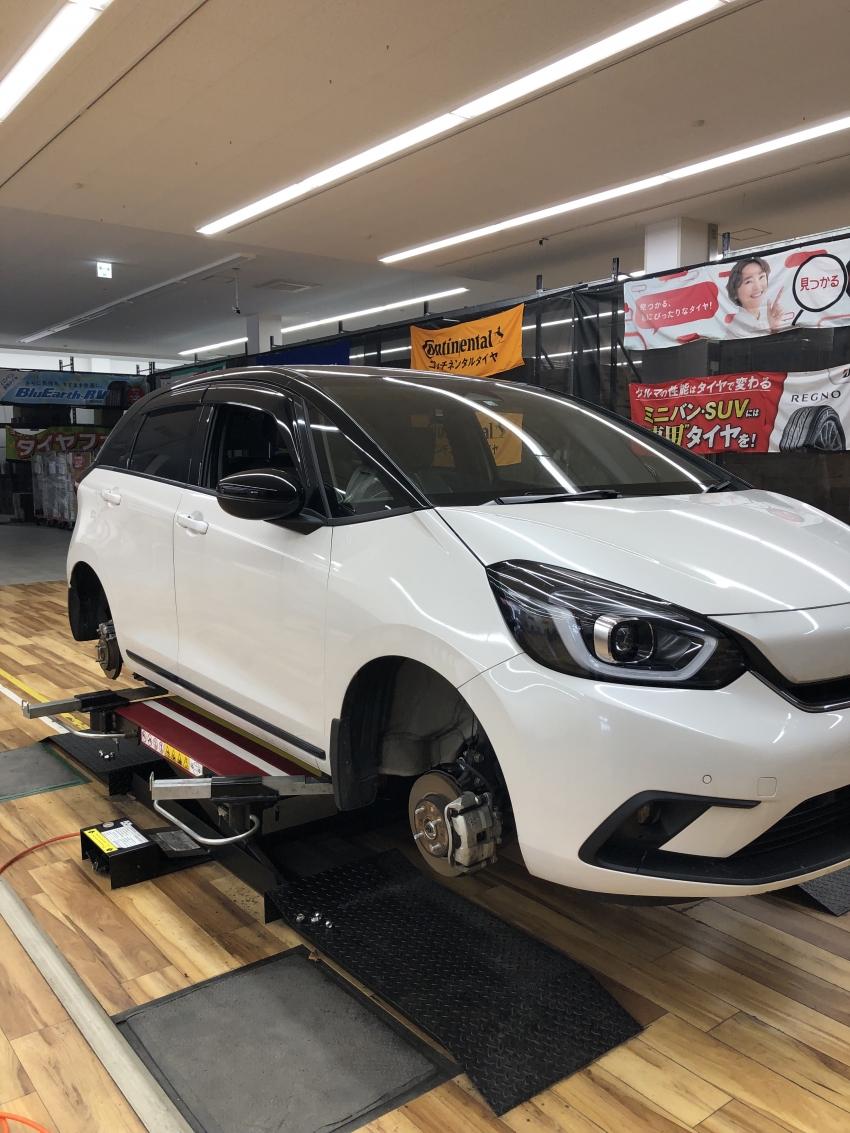 先日、右前のタイヤがパンクしていて、左前のタイヤがこすれていてご来店いただきましたホンダ フィットのお客様。
