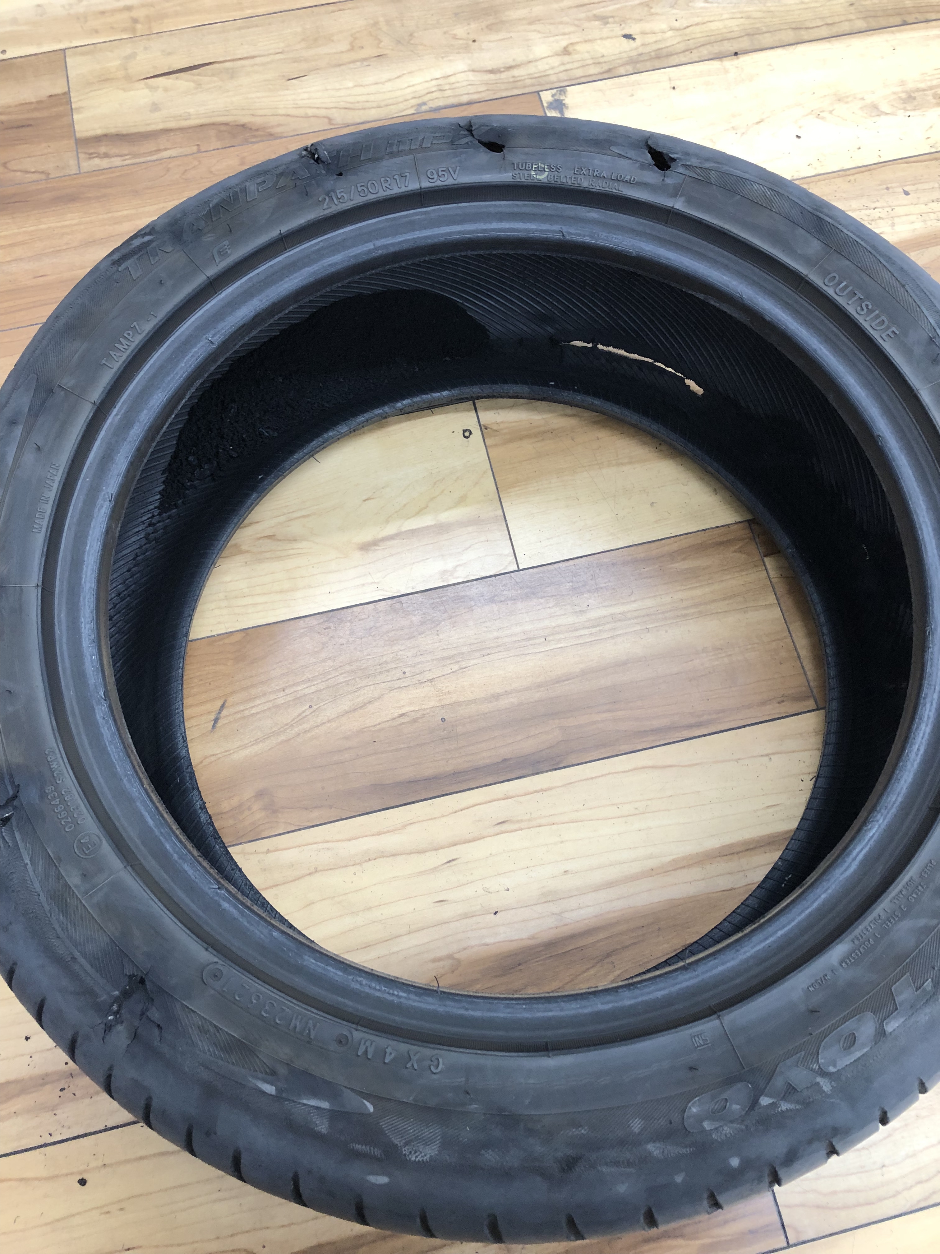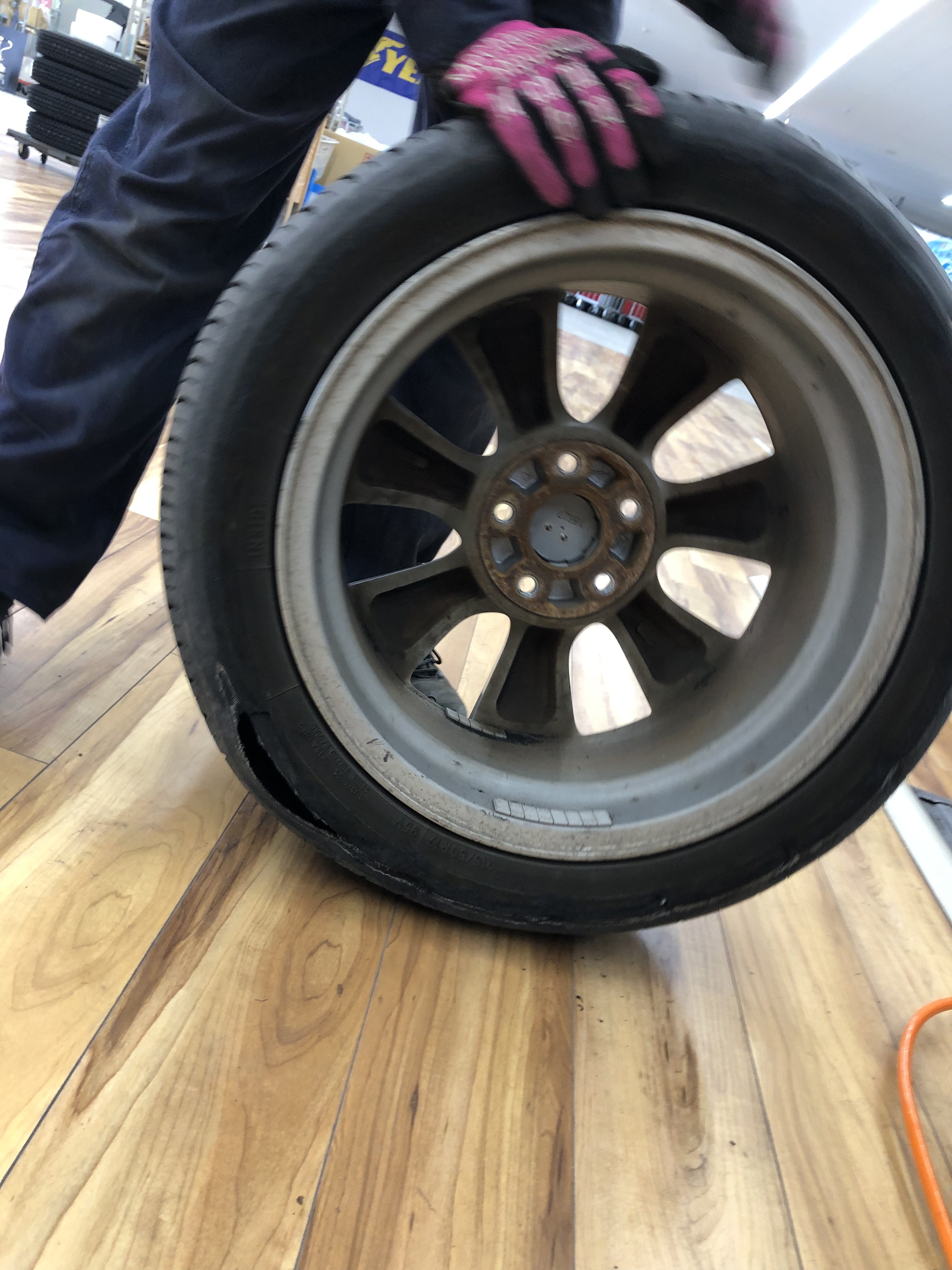 今回は、走行中にバーストしてしまい、レッカーでご来店いただきましたお客様、タイヤ1本交換対応させて頂きました。