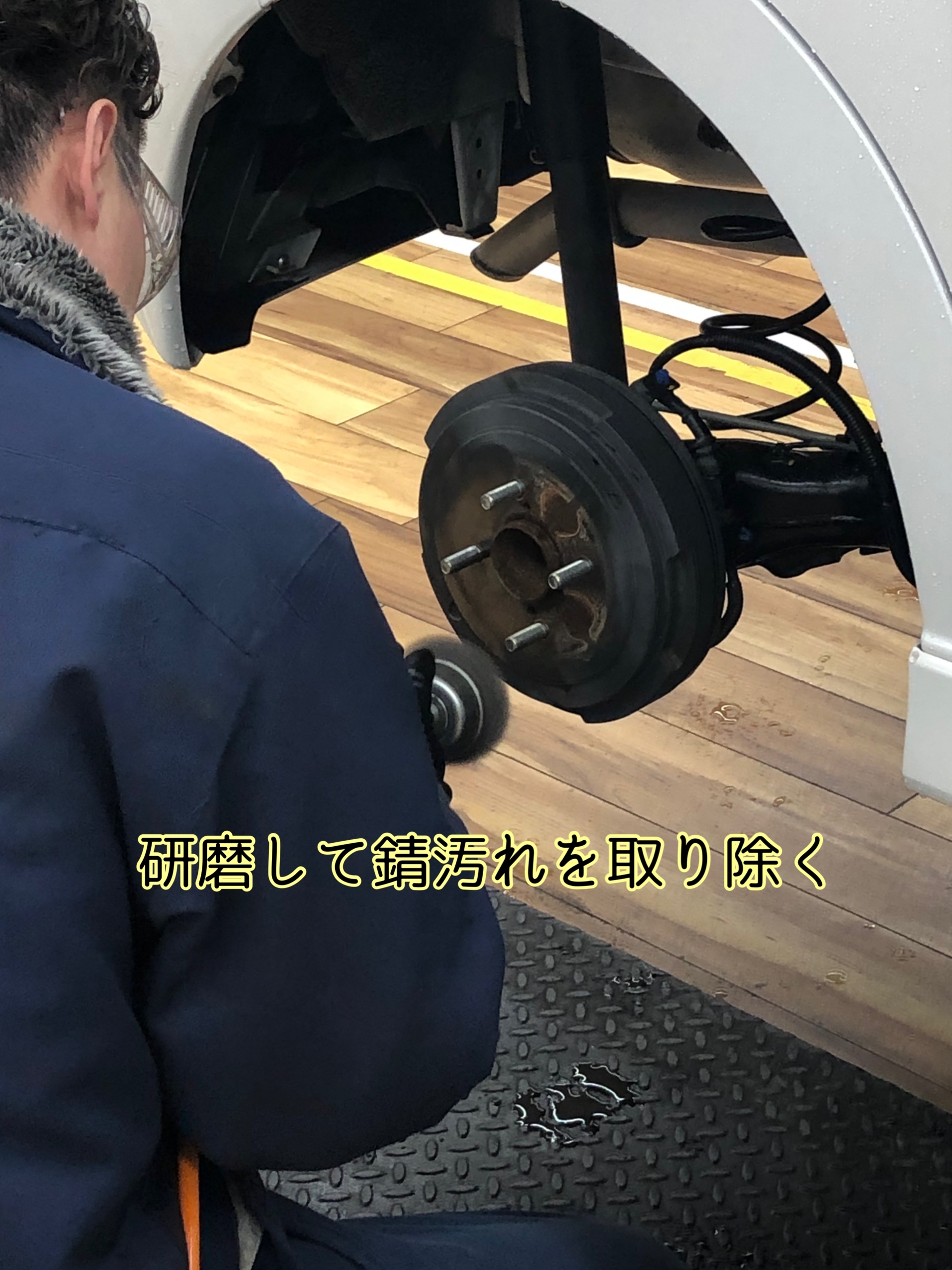 タイヤを外した際に見えるハブの部分。錆汚れがあったため、お客様に確認して頂き、ハブ防錆も同時施工させていただきました(`・ω・´)