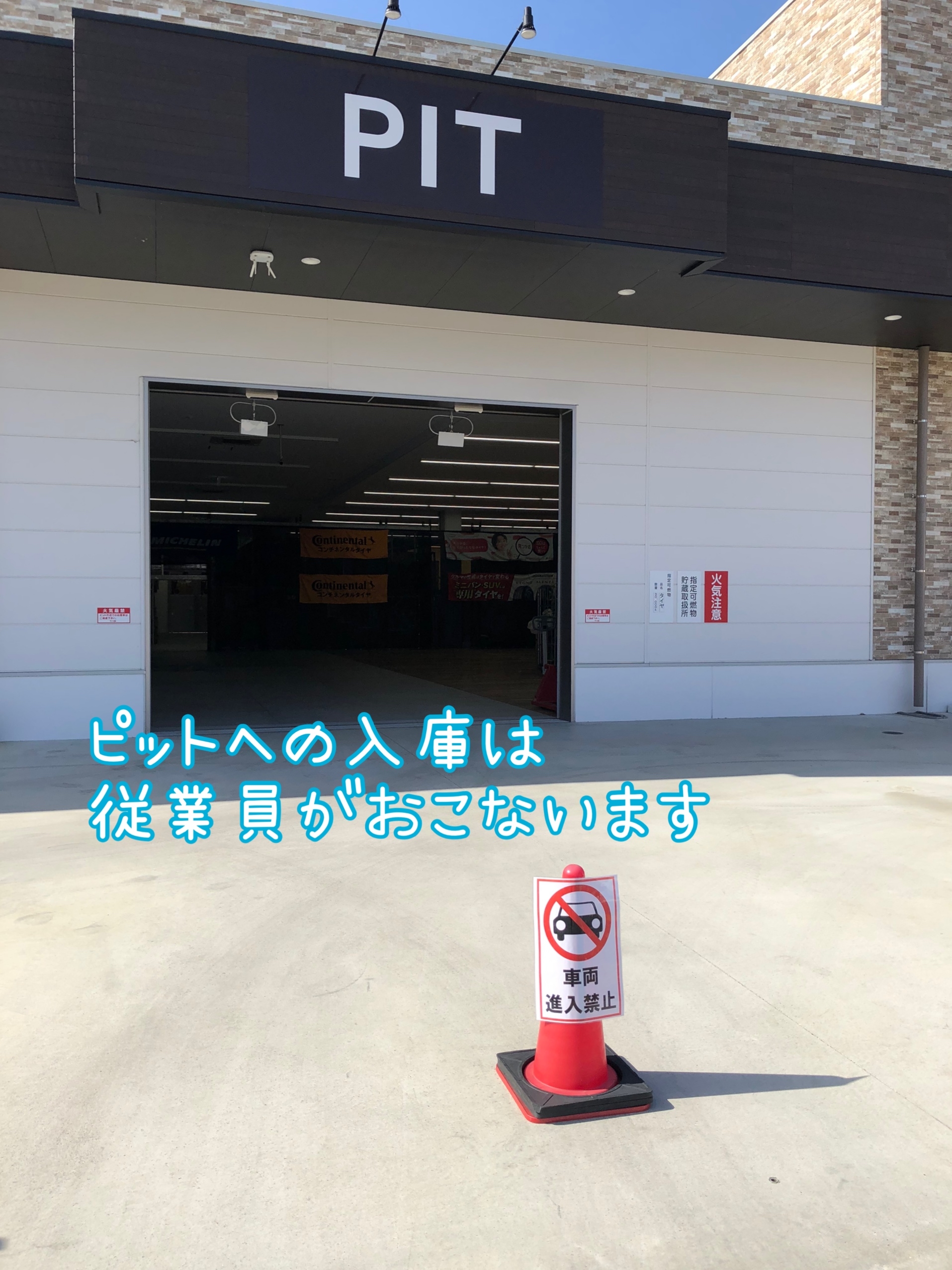 入口付近、タイヤが陳列されているところ、ピット作業場への車両進入は禁止となっております。
