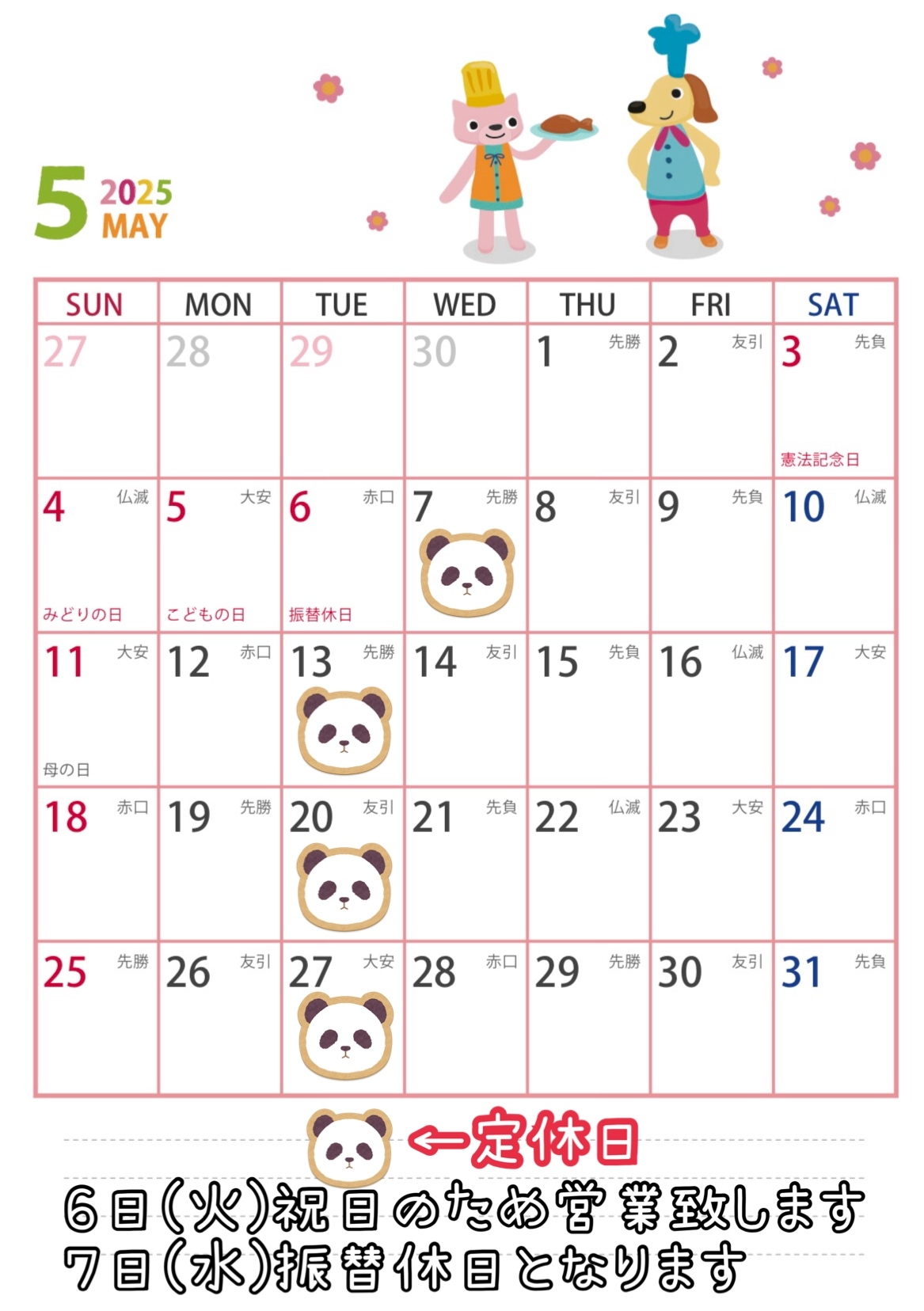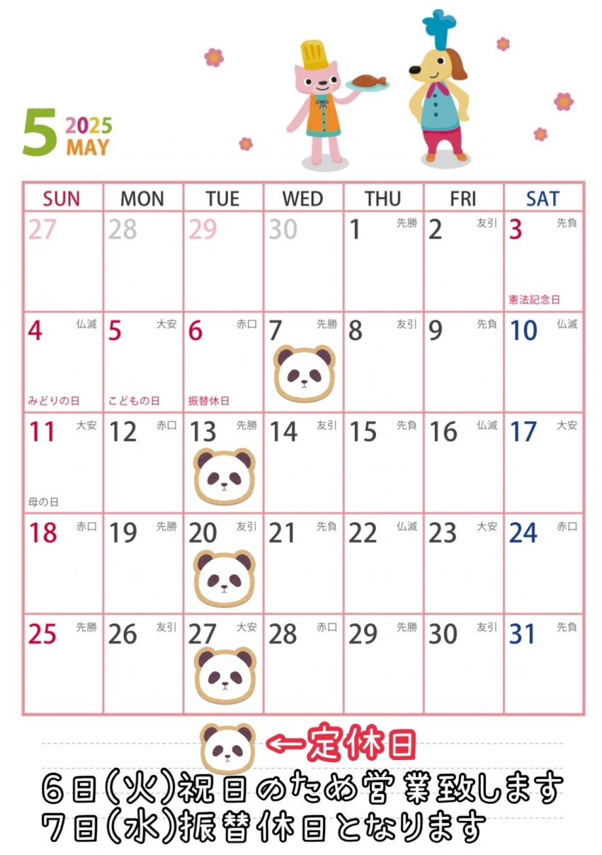 毎週火曜日定休日をいただいておりますが、5/6(火)は祝日の為、通常営業致します。5/7(水)を振替休日とさせていただきます。