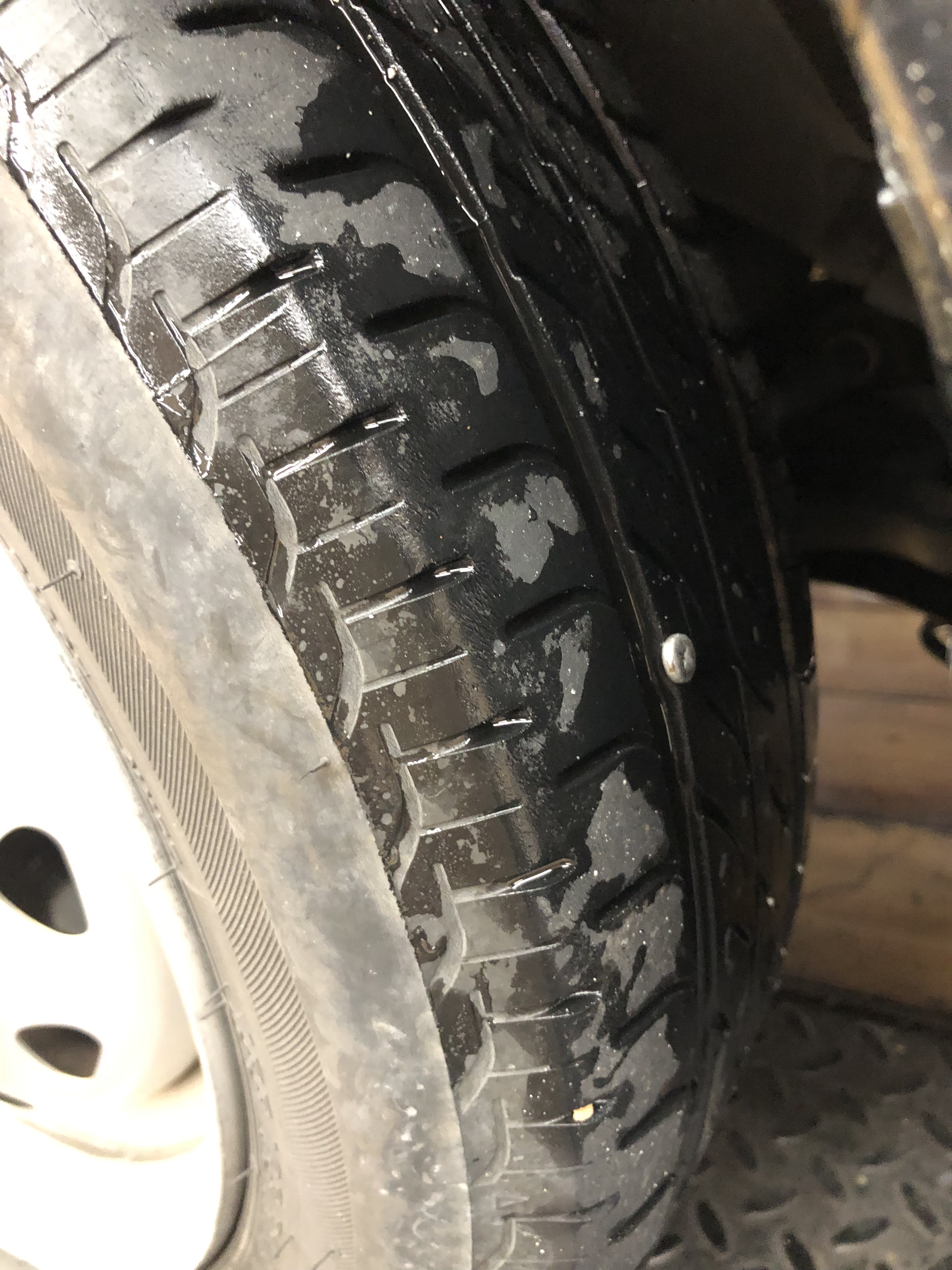 今回のケースはタイヤ外面にビスが刺さっている状態で、早めに気付けたため自走にてご来店いただきました。
