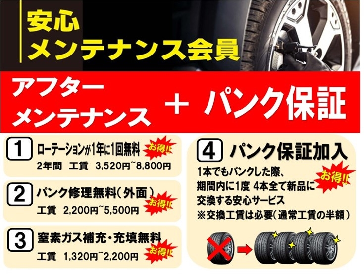 タイヤ4本ご購入時にご加入いただける2年間のアフターメンテナンス+パンク保証付き\(^o^)/