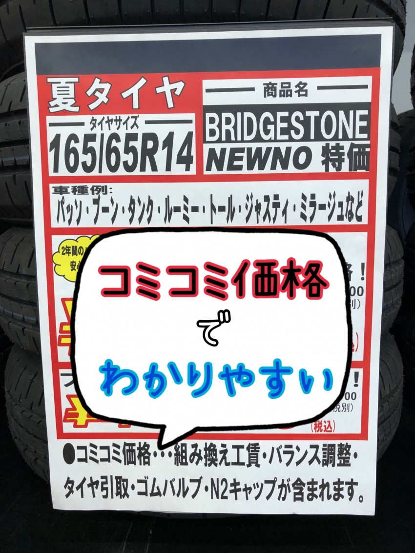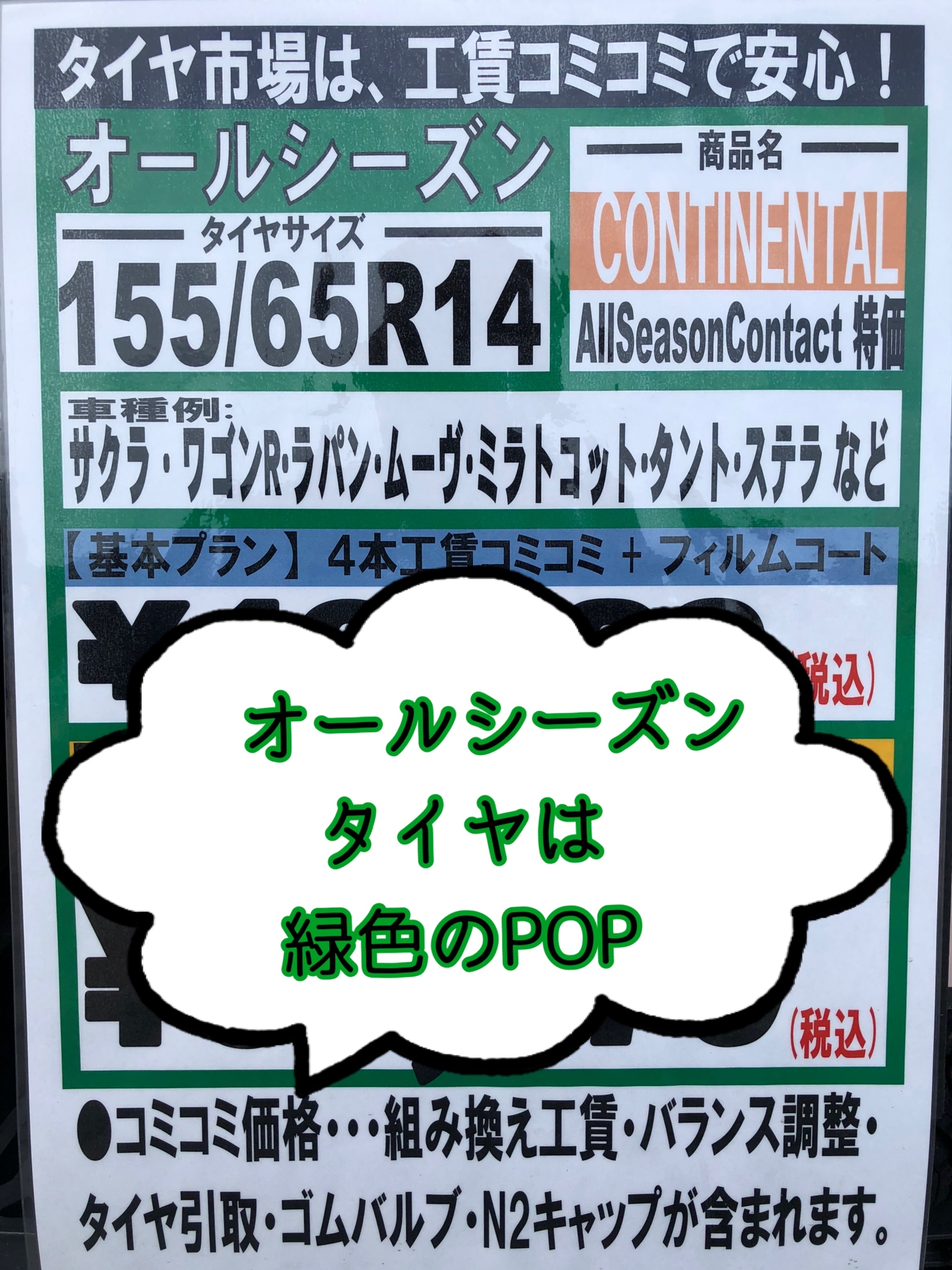 当店では、価格表示のPOPをタイヤ4本のみの価格ではなく、工賃+廃タイヤの引取処分料+ゴムバルブ付きN2キャップ+フィルムコートを含んだコミコミ価格でご案内しています。
