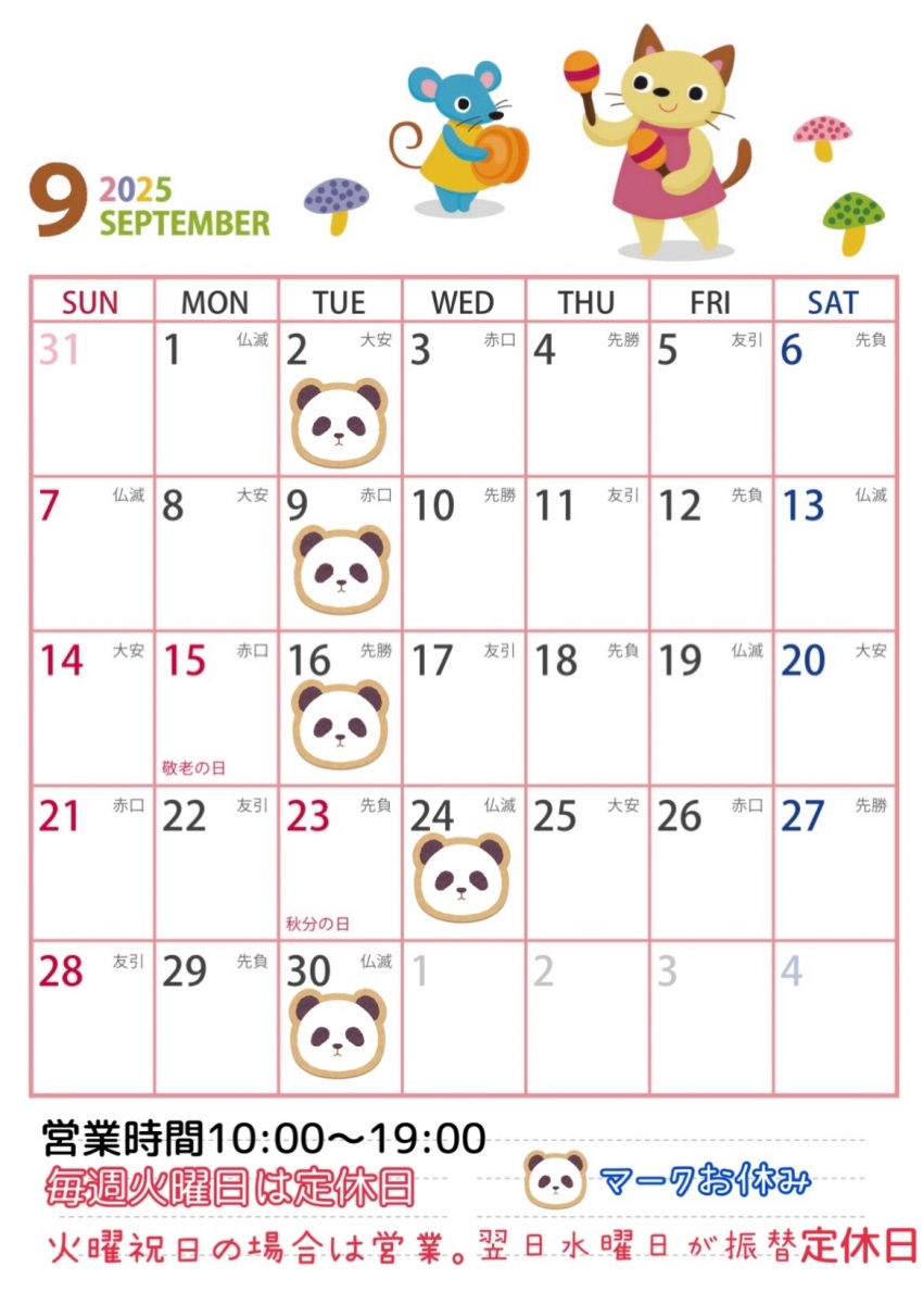 定休日は火曜日となっておりますが、9/23(火)祝日のため営業。翌日9/24(水)が振替定休日となります。ご迷惑おかけいたしますが、ご理解賜りますよう宜しくお願い致します。