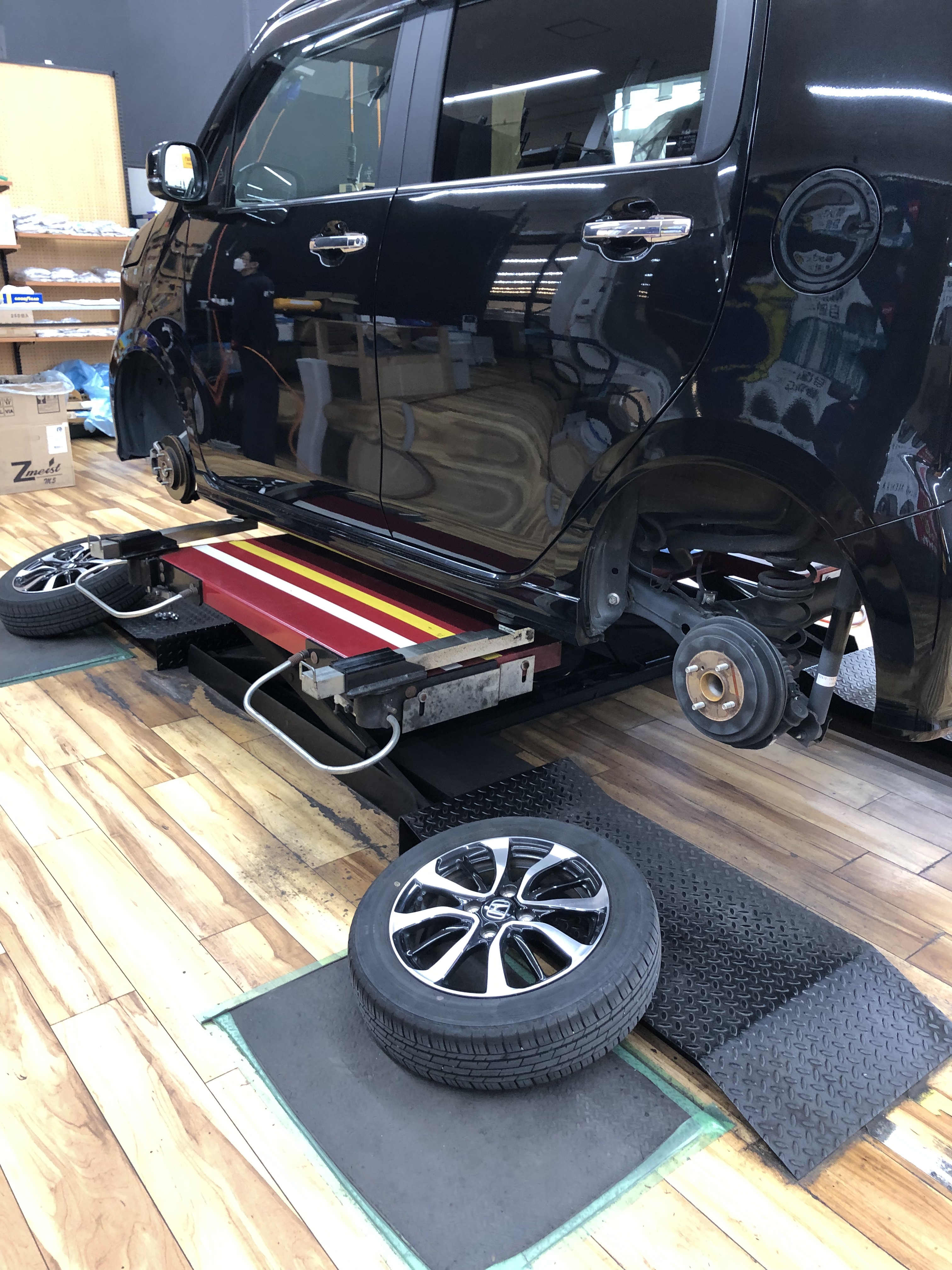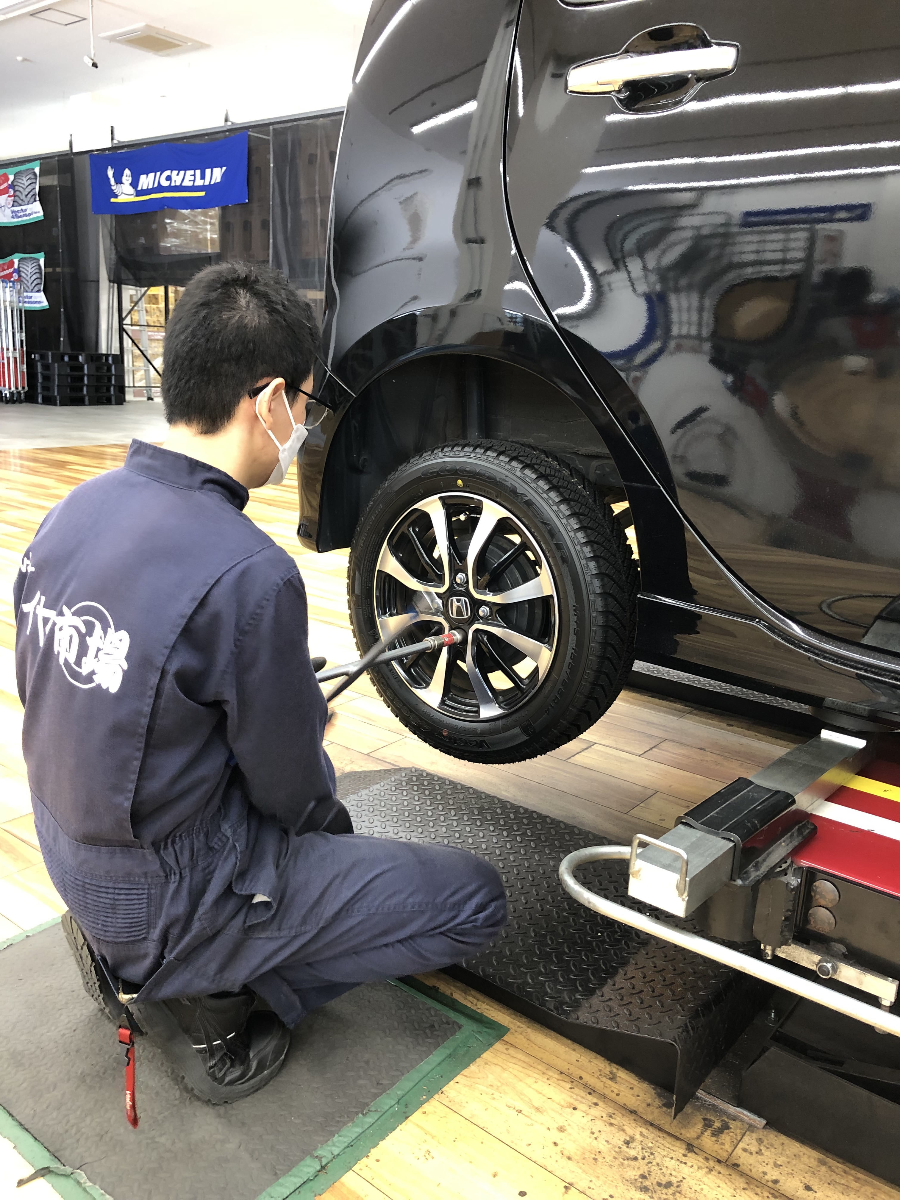 ホイールに新しいタイヤを組み込んでお車に装着します!