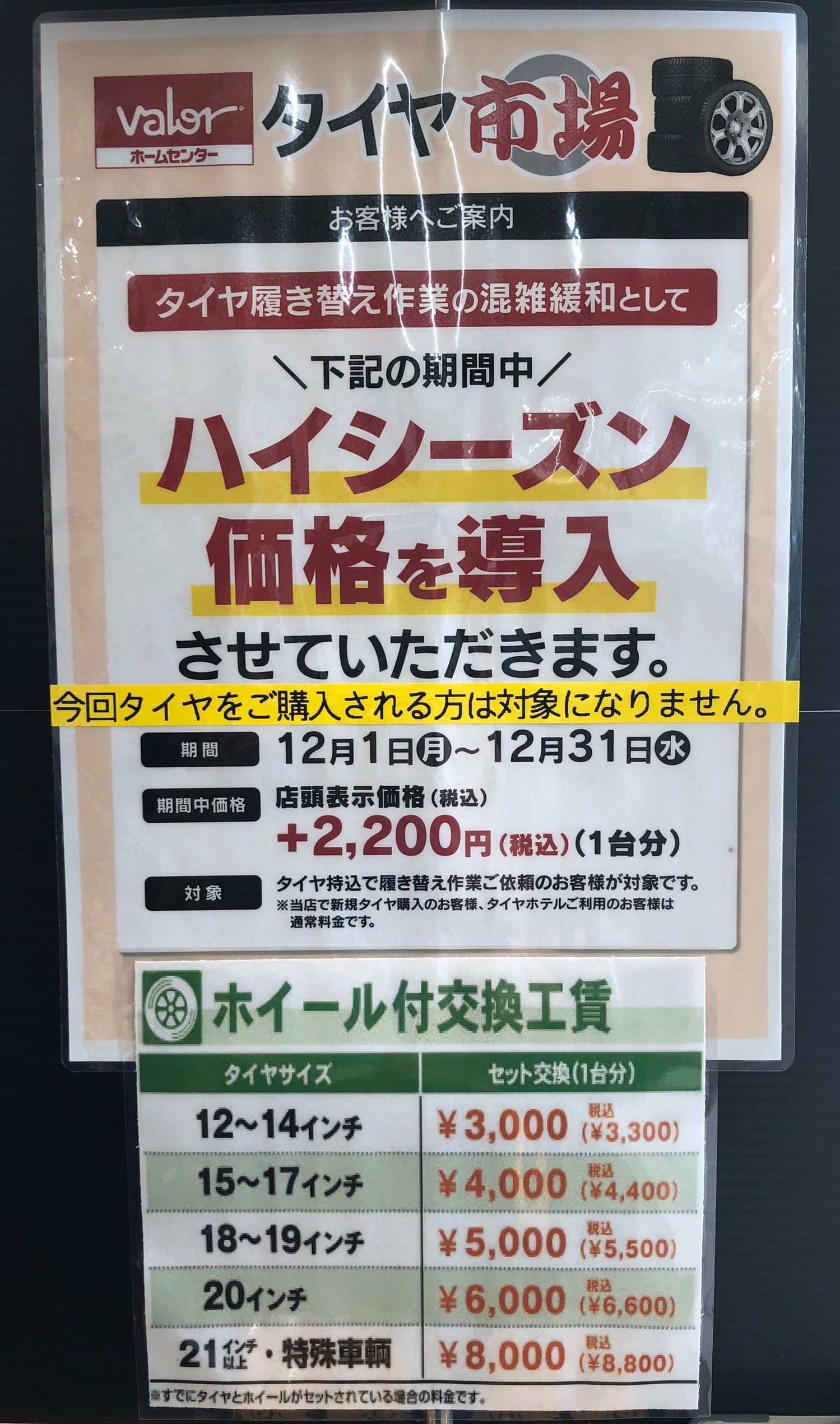 タイヤ市場では12月1日~12月31日の期間中、タイヤ履き替え混雑緩和としてハイシーズン価格を導入させて頂きます。