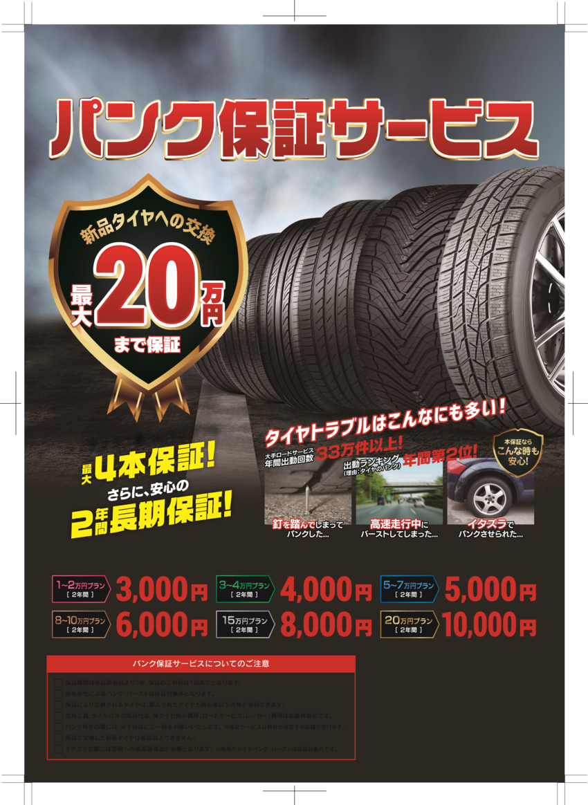 2/1~タイヤ市場では新サービスとしてパンク保証サービスを開始します!