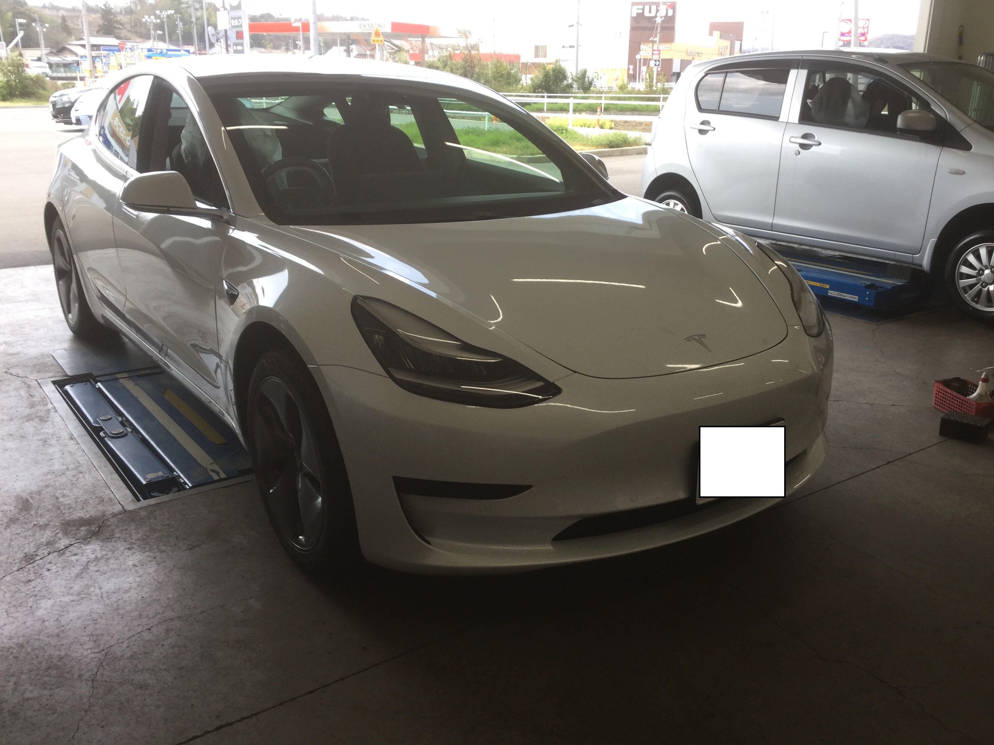 今日はエクストレイルの付替え、BMWのタイヤ交換とアライメント、珍しい車種ではテスラ モデル3も入庫!