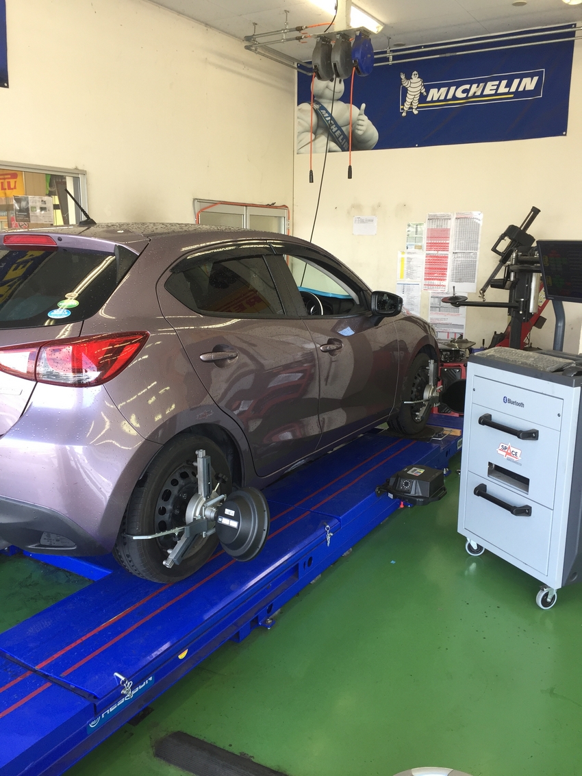 本日、冬タイヤから夏タイヤへの履き替えのお客様にホイールアライメント調整を行いました!