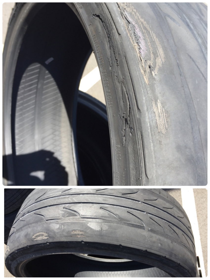 使いきったタイヤ(偏磨耗有・ワイヤー露出)
