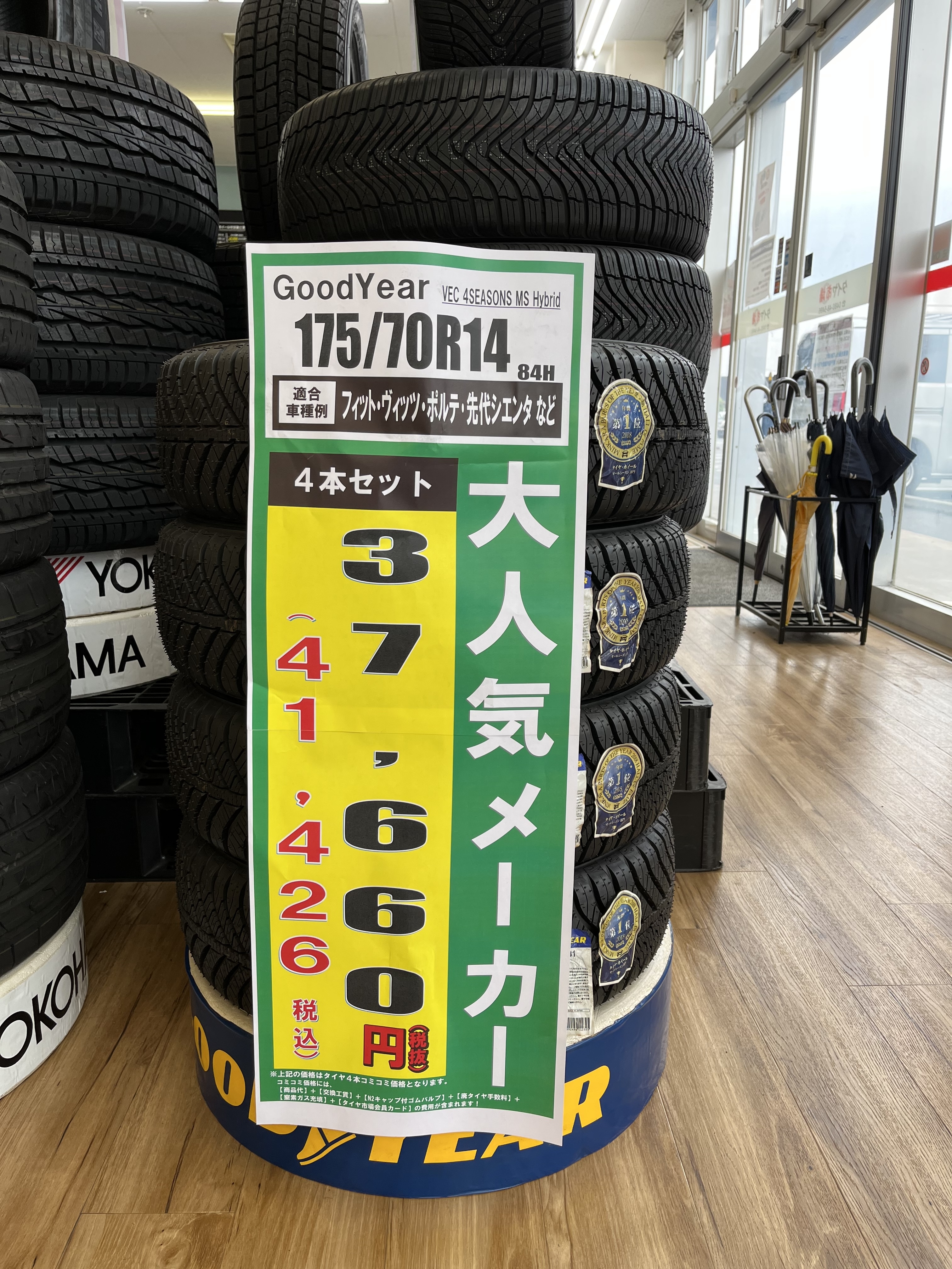 国産のオールシーズンタイヤがアウトレット価格でお買得!!グッドイヤーのベクター4シーズンズ!!フィット・ヴィッツ・ポルテ・デミオ・bBなど【サイズ175/70R14・175/65R14】