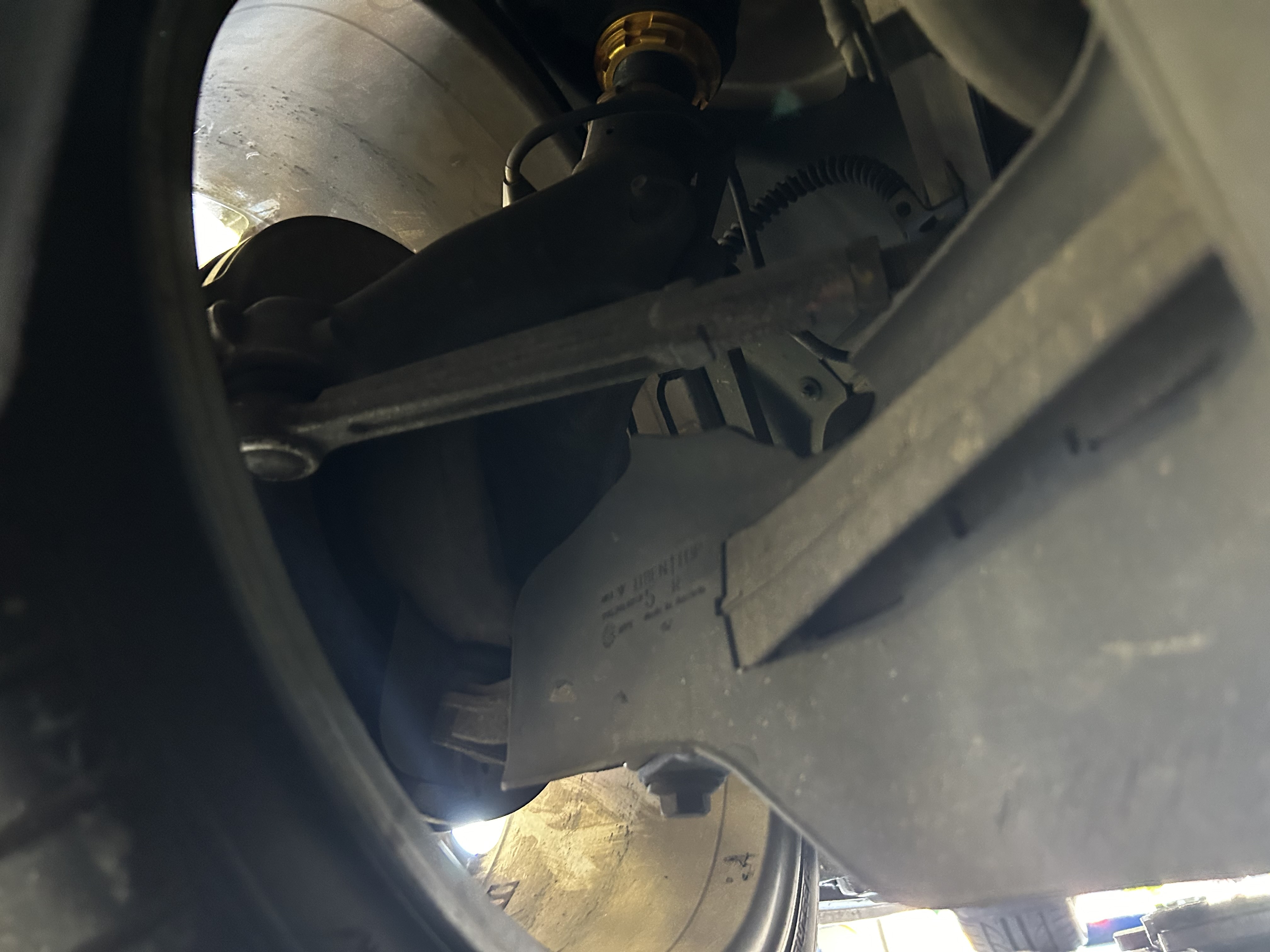 フロントのタイロッドもボディー下部の整流用のプレートが取り外し出来ますが劣化でクリップが割れたりする恐れがありますので、頭を使ってそのまま工具を入れ調整していきます。
