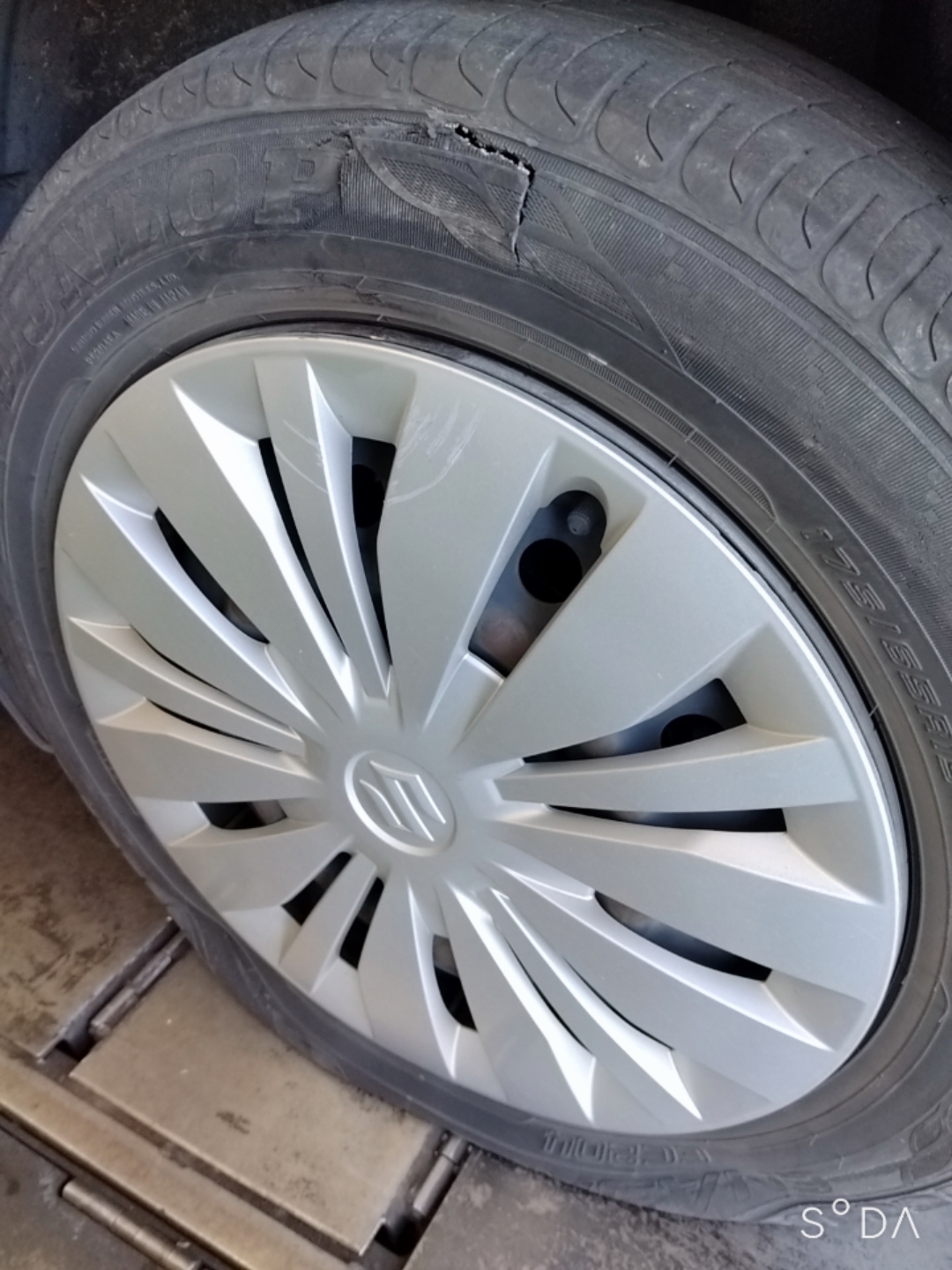 タイヤの側面に穴が開いてしまい完全にぺたんこになっています。