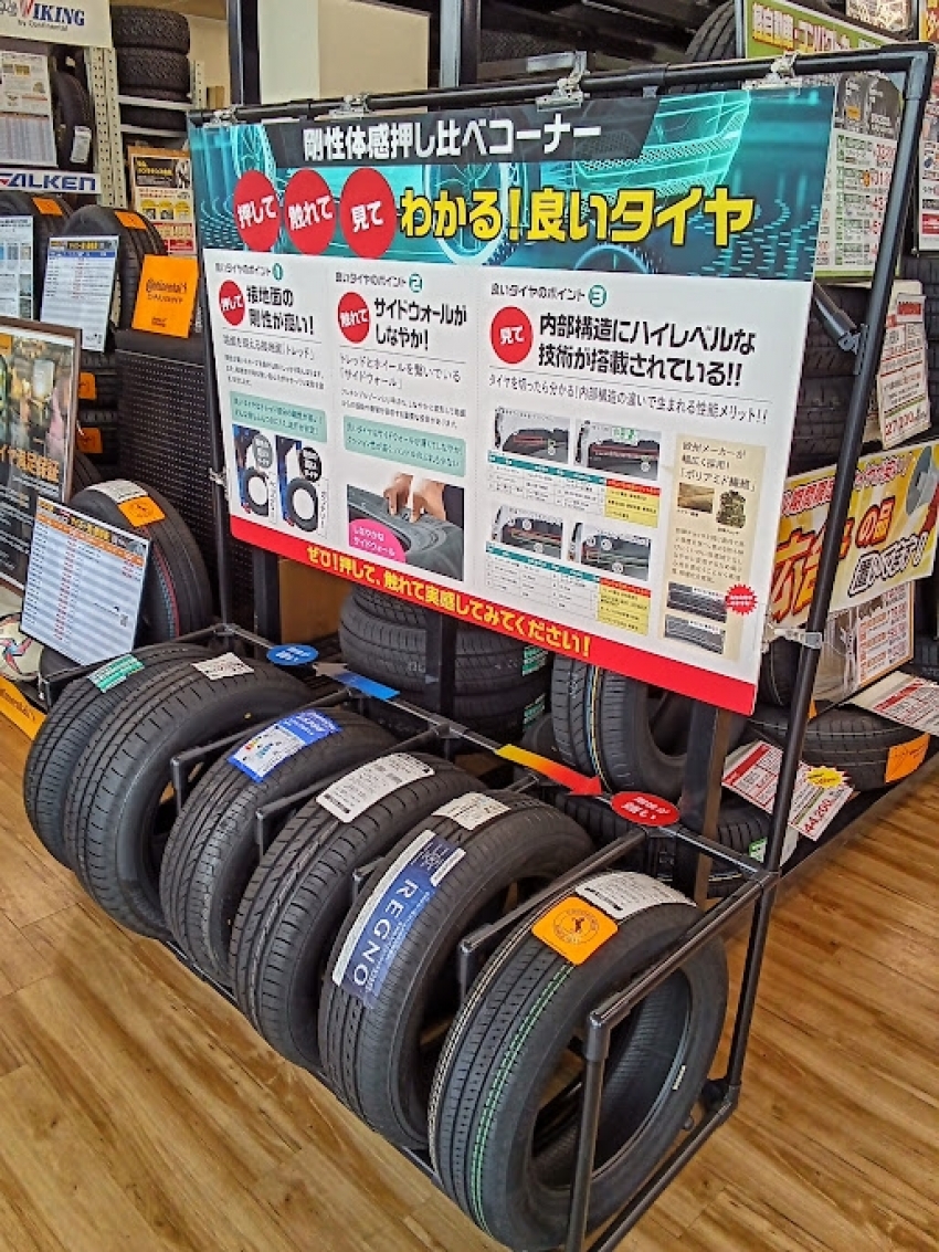 タイヤ市場加須店はタイヤの剛性を体感できる押し比べを体感できるコーナーを作りました。