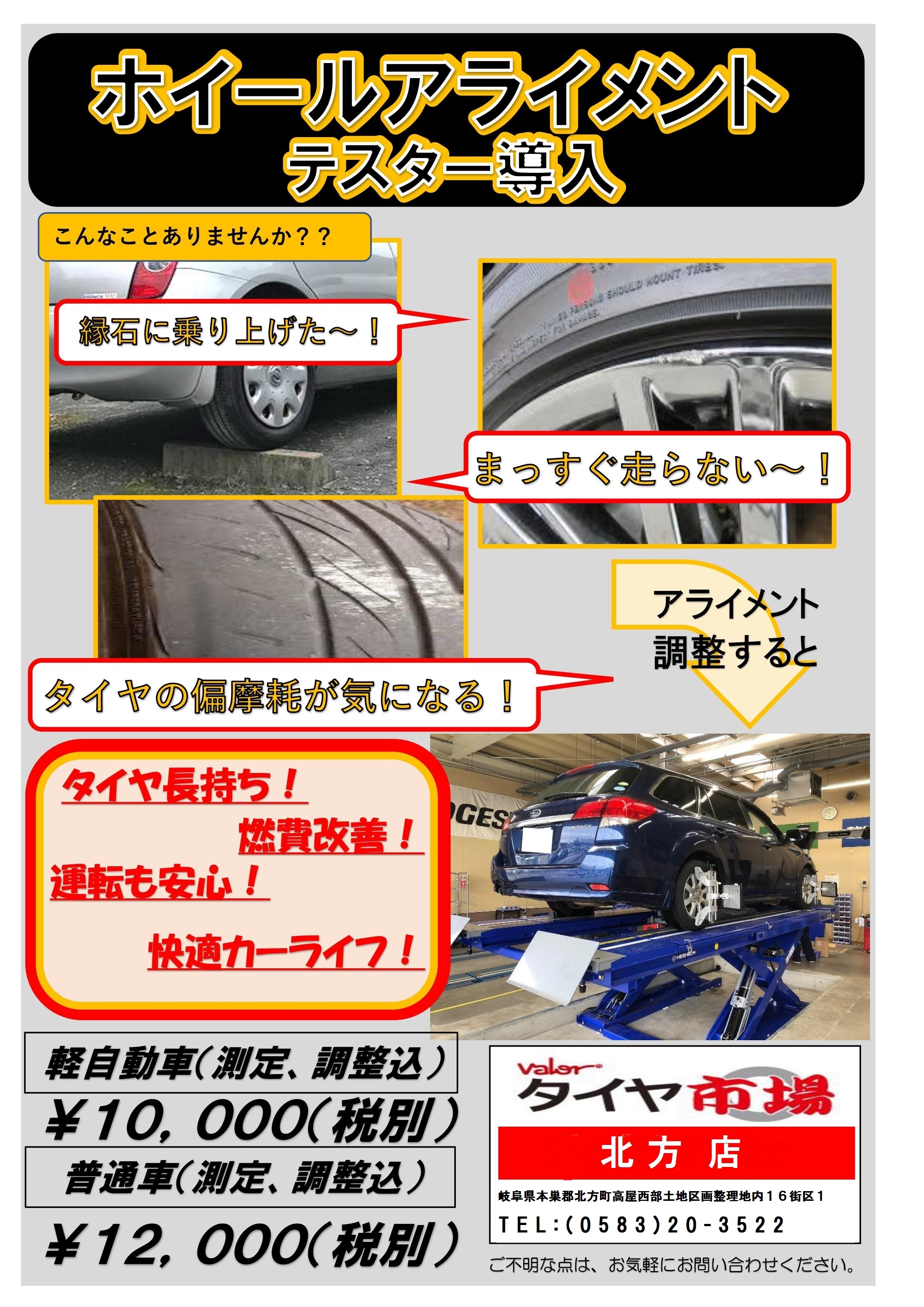 アライメントとはタイヤ(ホイール)が車体対して取付位置が決まっており、ちょっとしたことで、この新車時の設定からアライメントがズレてしまいます。