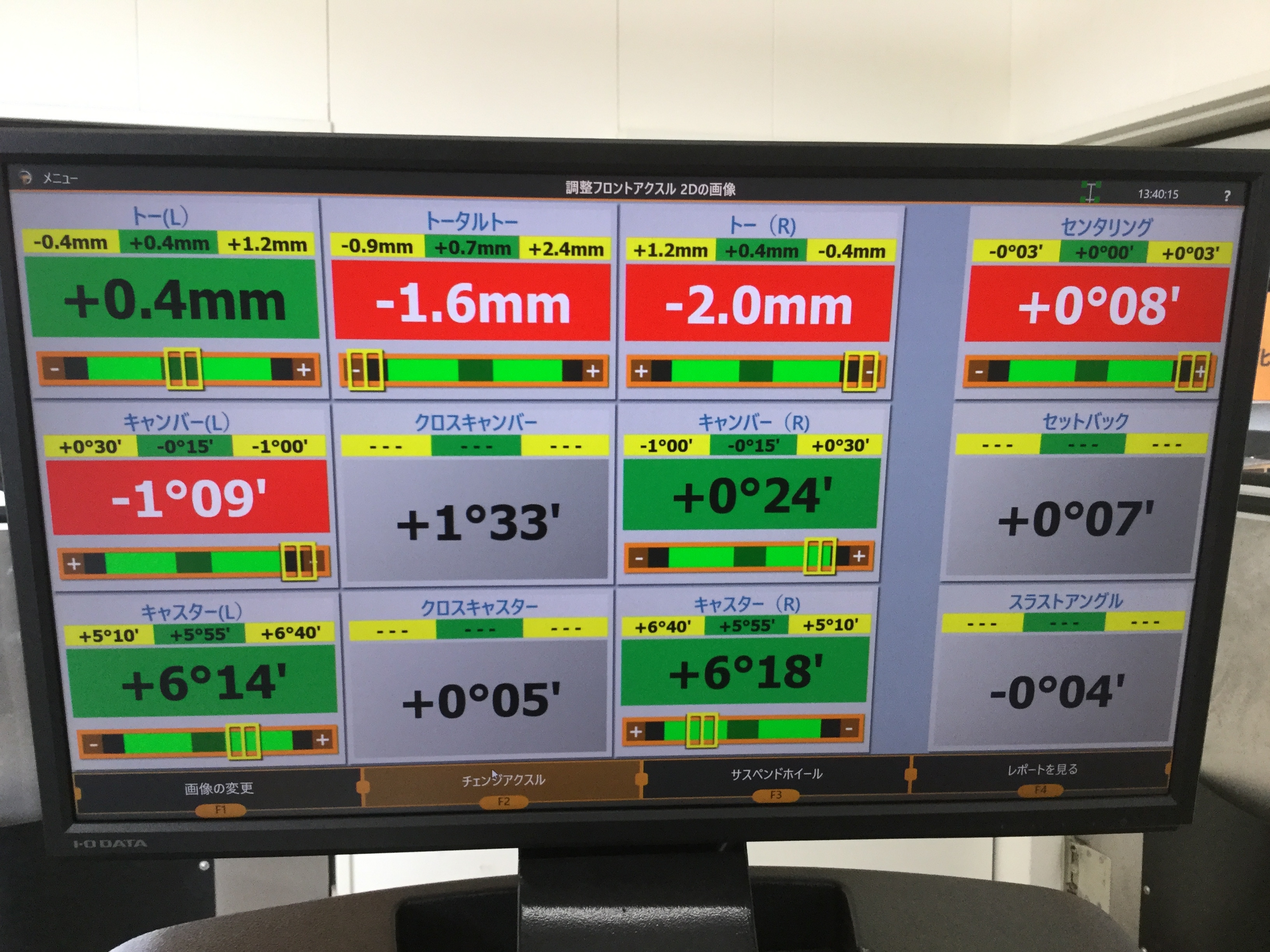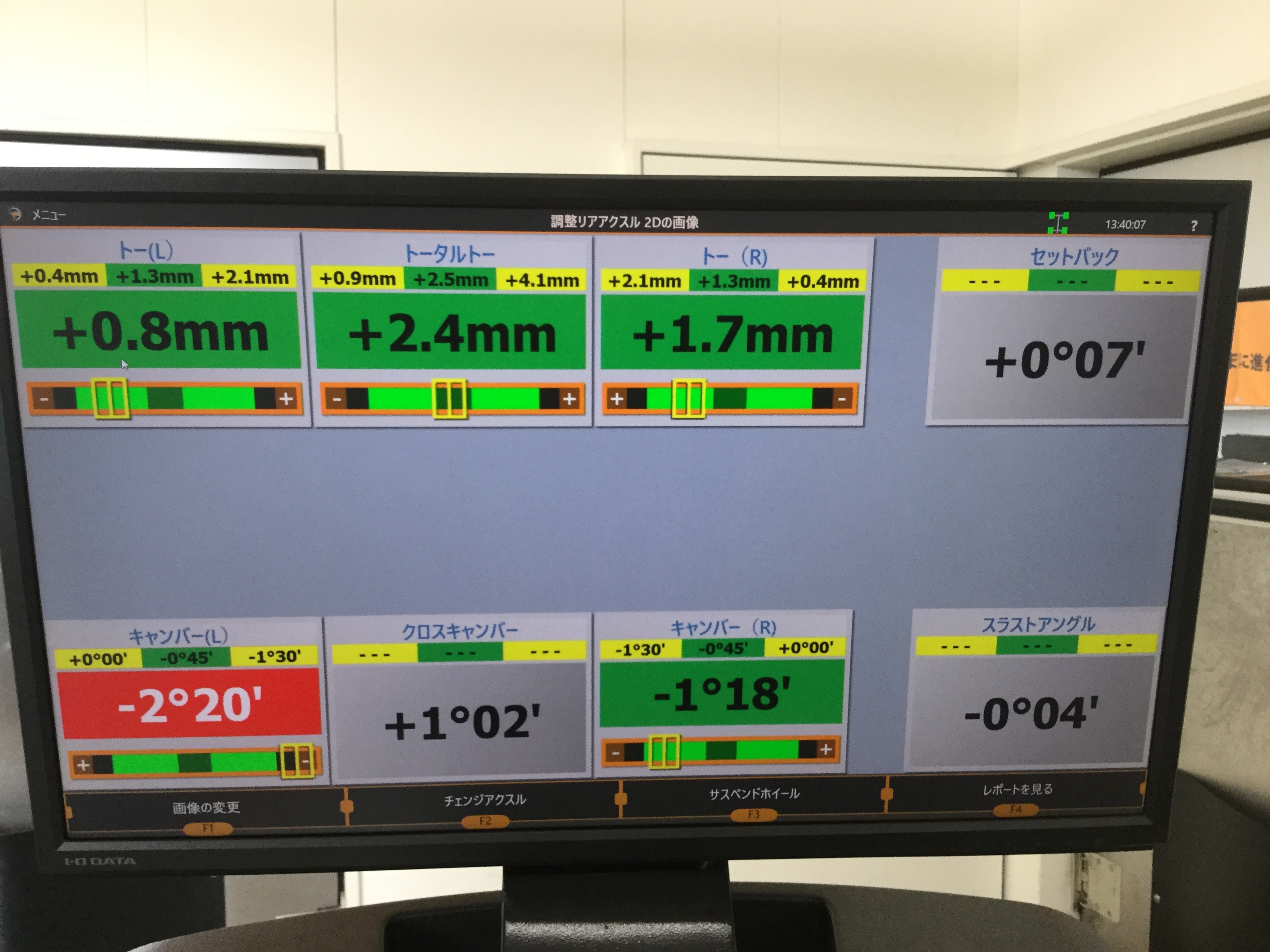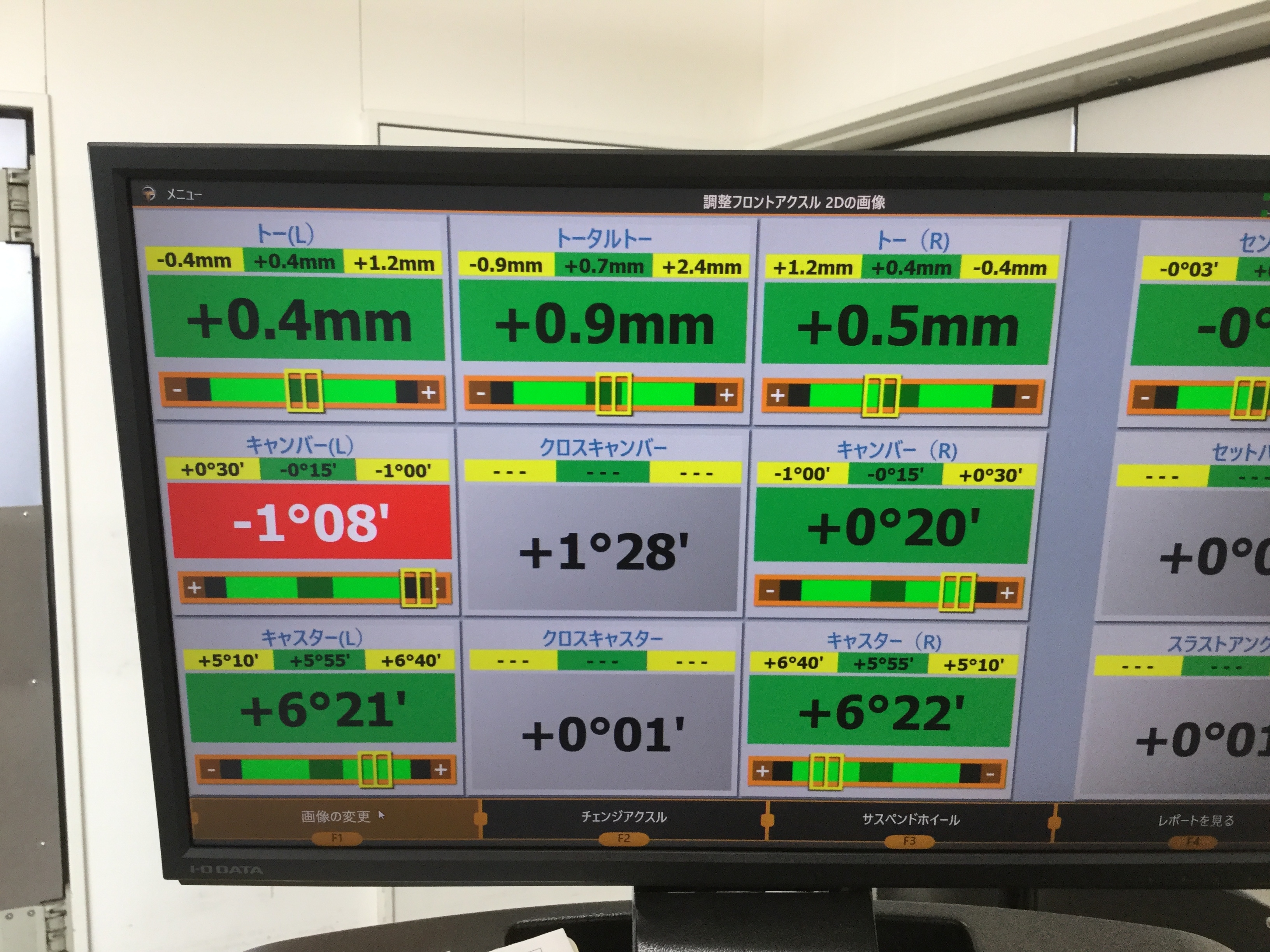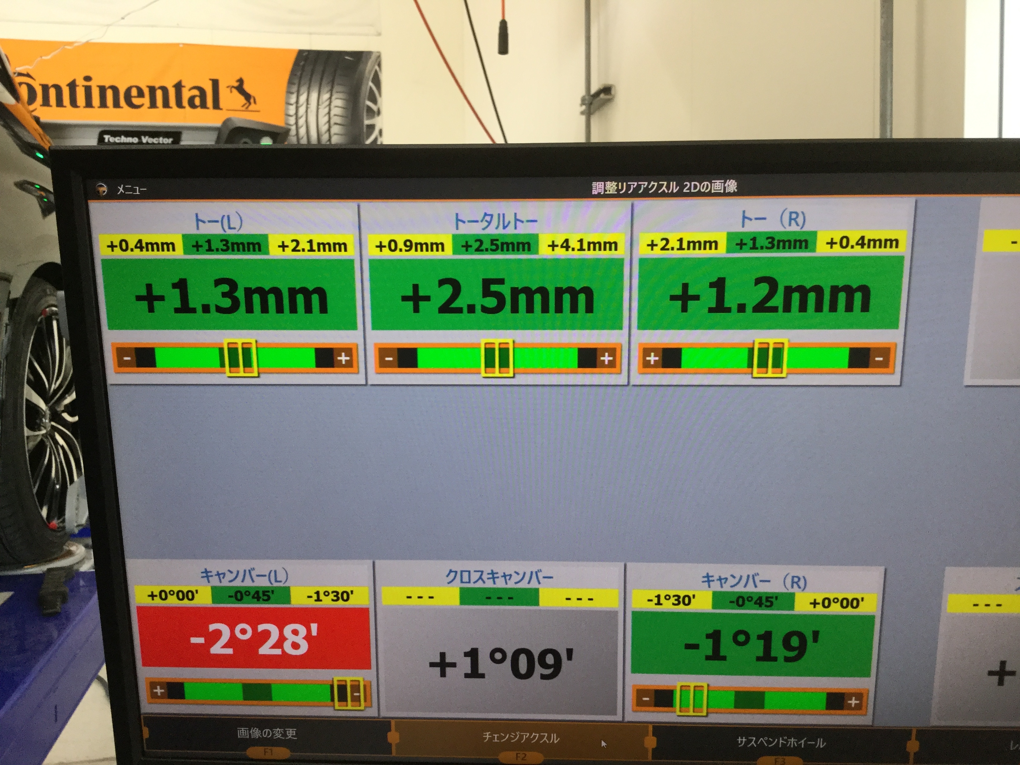 ↑リアは思ったよりトーのズレが少なかったですが、基準値の真ん中でしっかりと調整しました。
