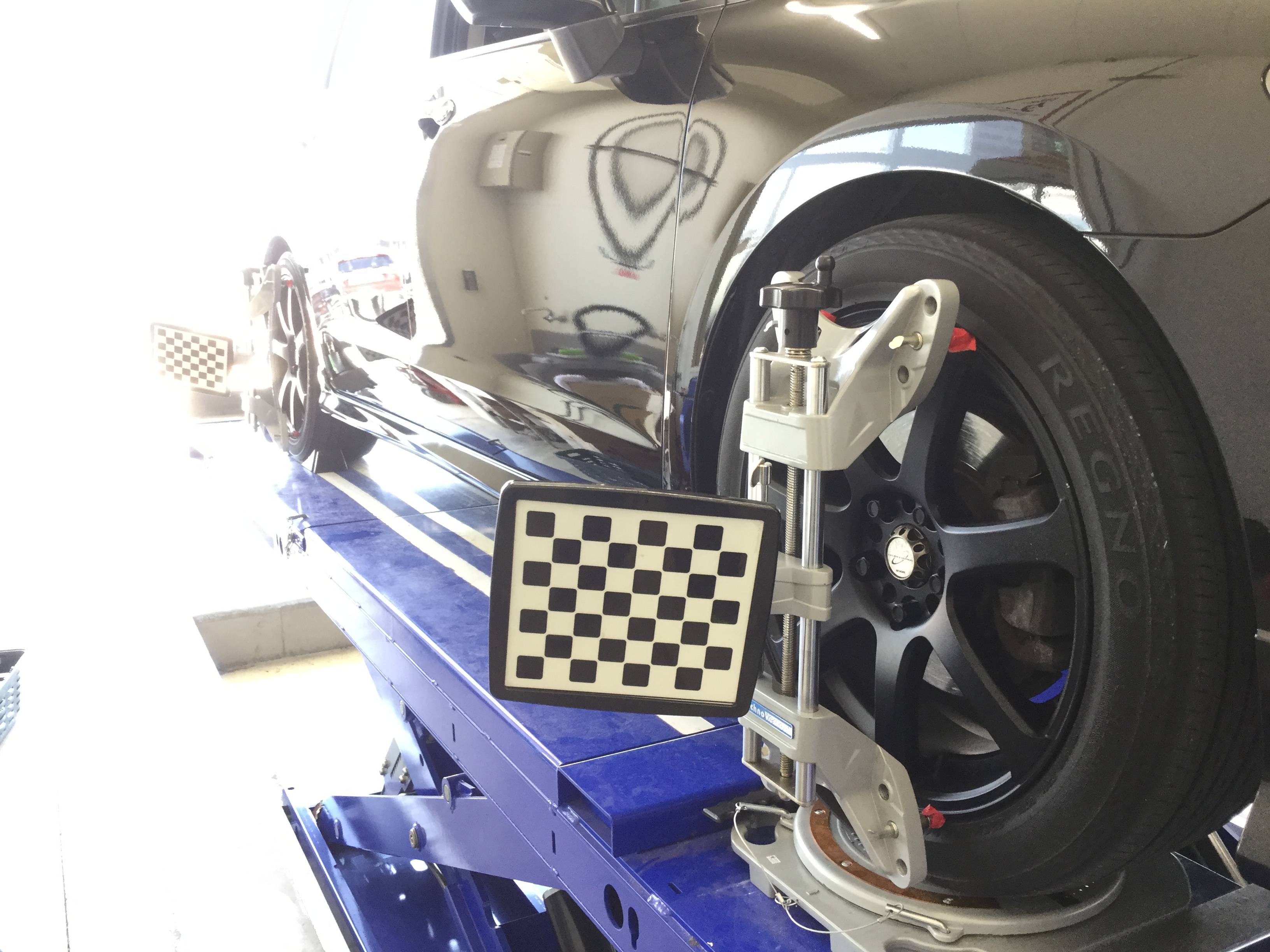 タイヤを点検させて頂くと、REGNOのタイヤを履かれていて、確かに内減りが激しい。しかも、右側が特に。これは、相当、ズレているなと腹をくくって測定してみると・・・・。