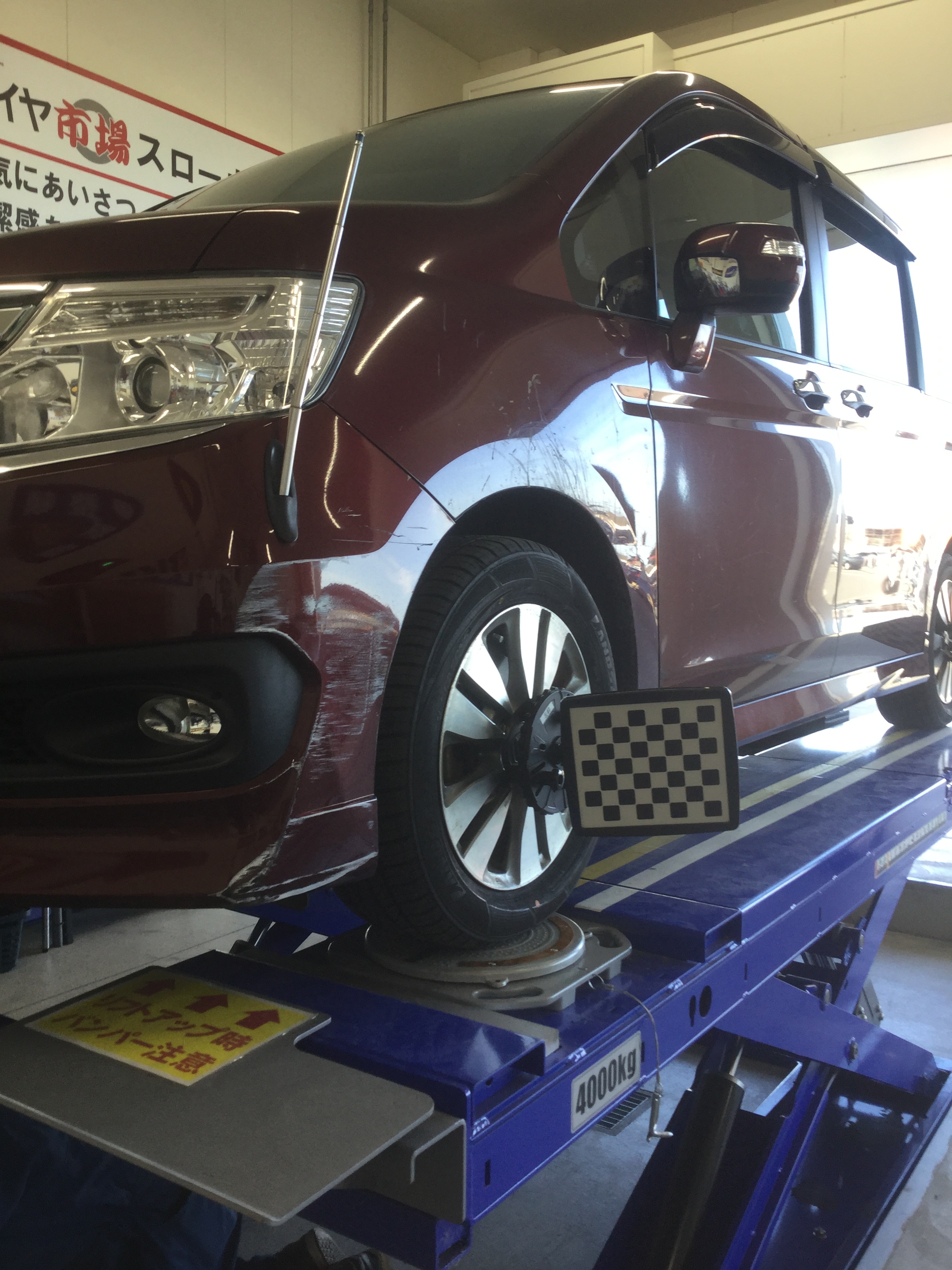 フロントのタイヤのサイドが切れており御来店されましたので、フロントのタイヤを2本交換して、接触の反動でズレている可能性がありましたのでアライメント調整も作業致しました!