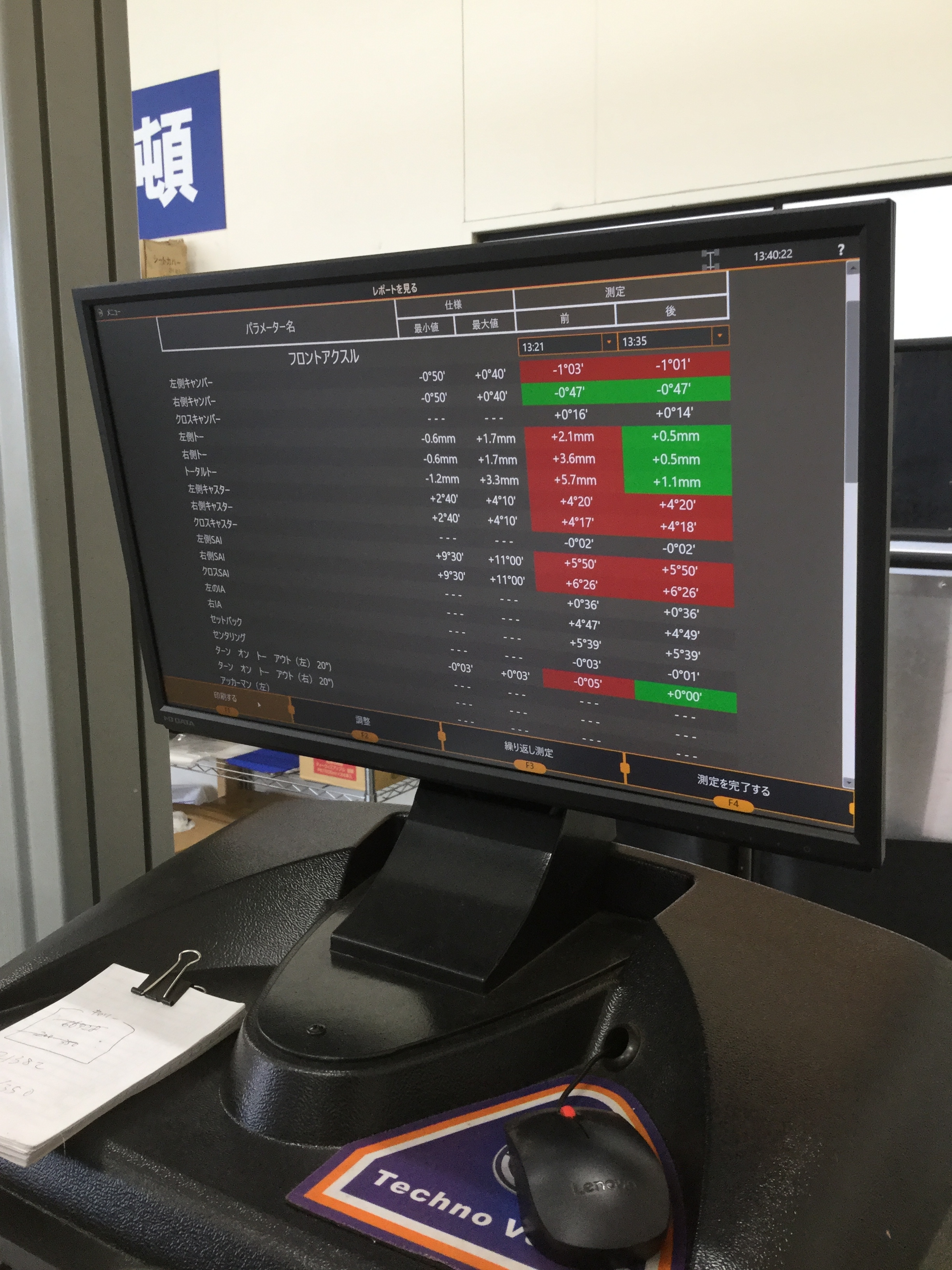 さて、測定をしてみるとフロントのトー角が左右ともに