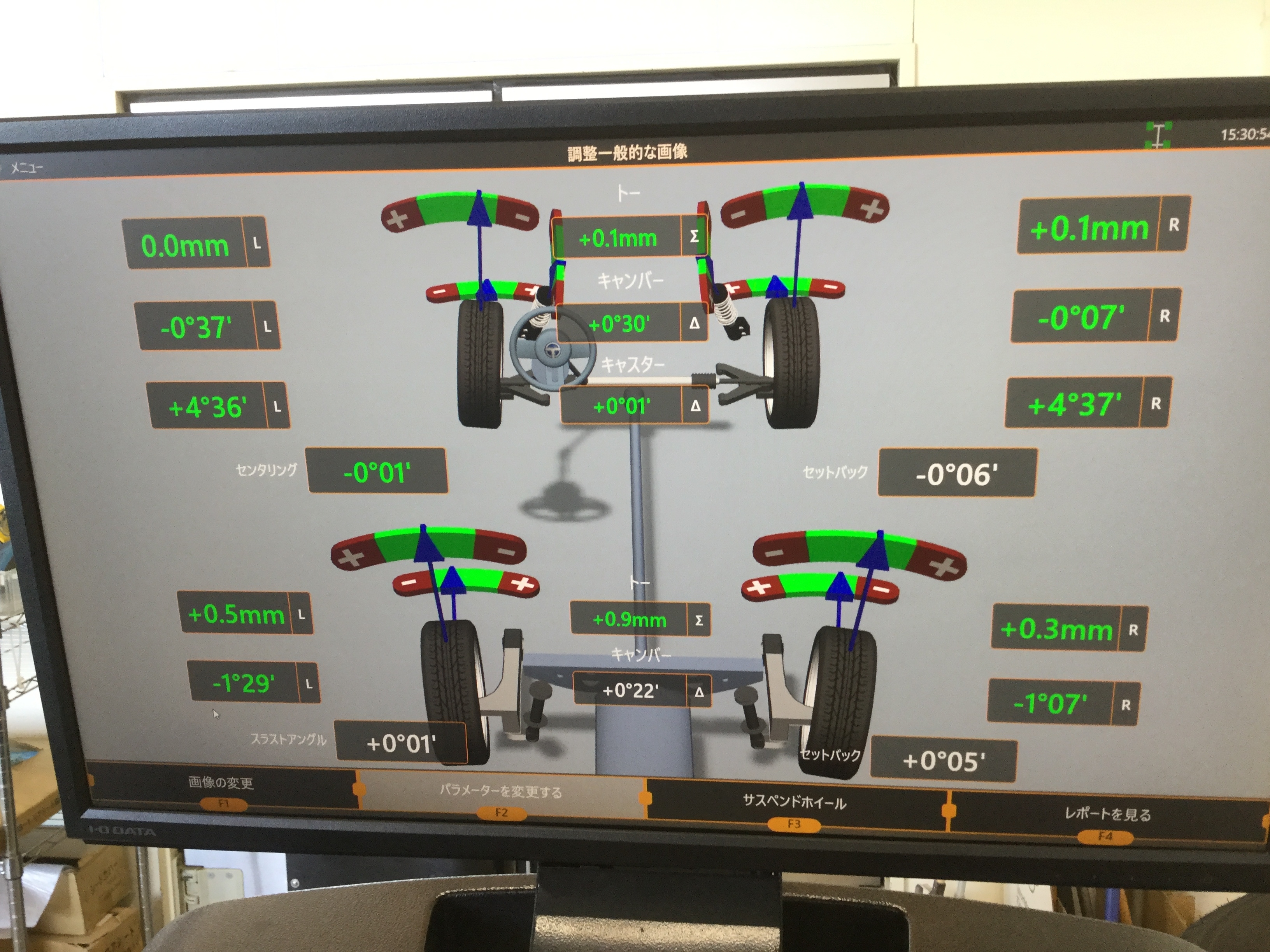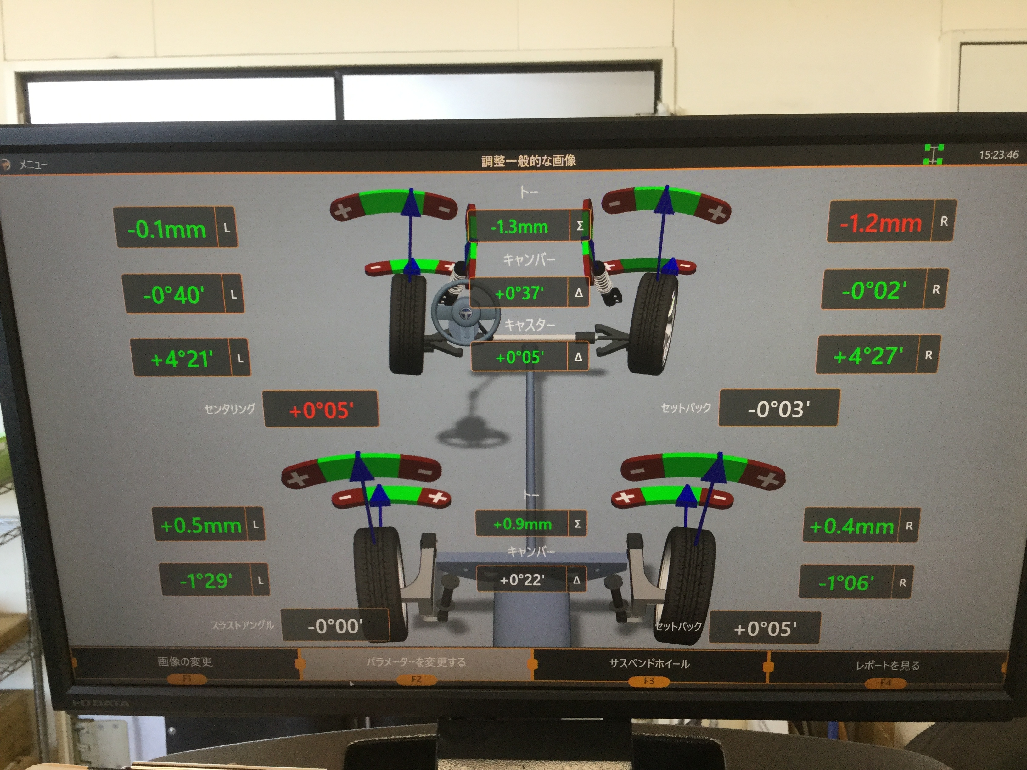 さすがにこの状態では、新品タイヤを装着しても、寿命が短くなると思い、お客様にアライメント調整のご提案をさせて頂きました。