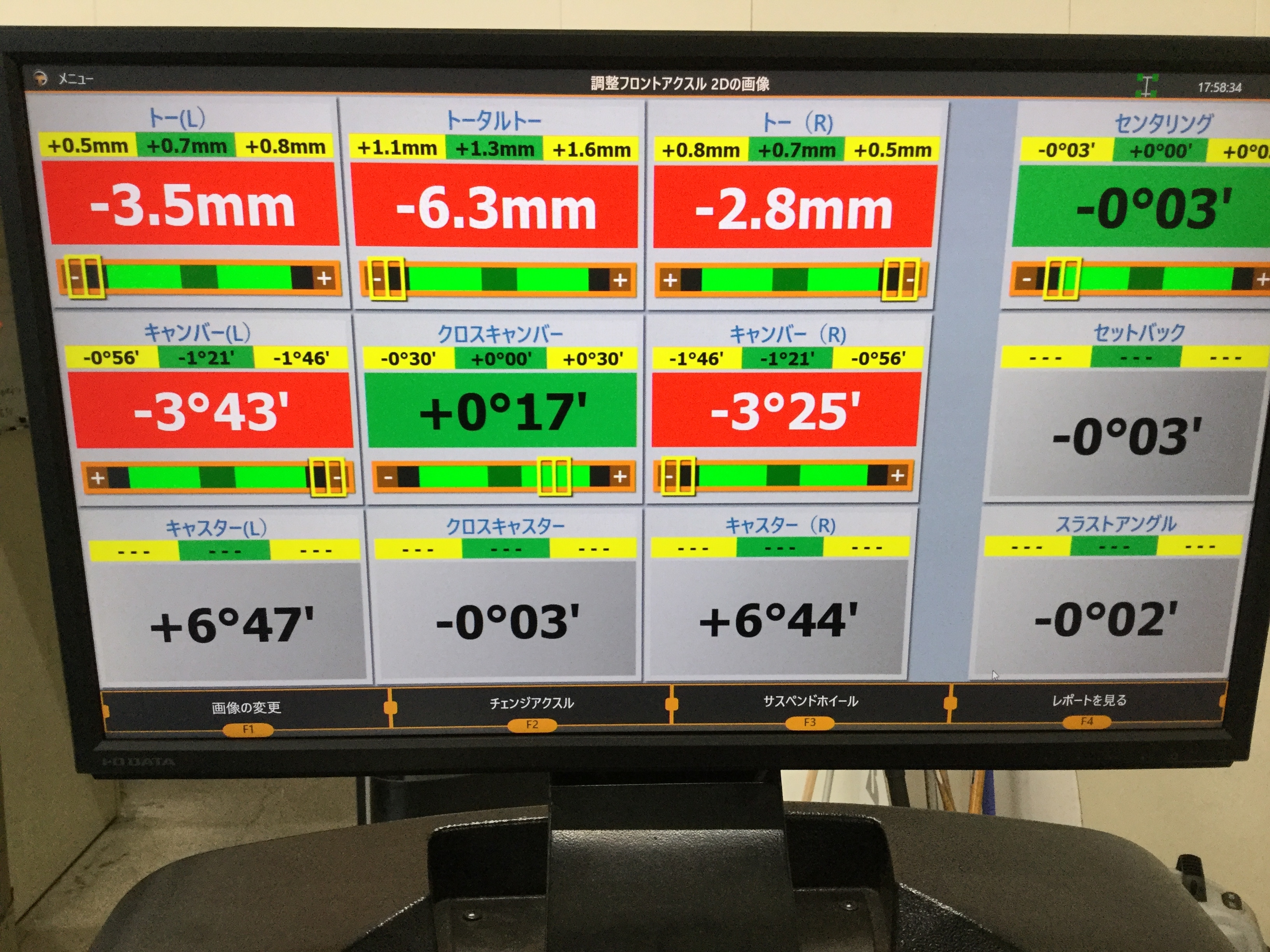 前後ともトー角、キャンバー角に大幅なズレがありました。