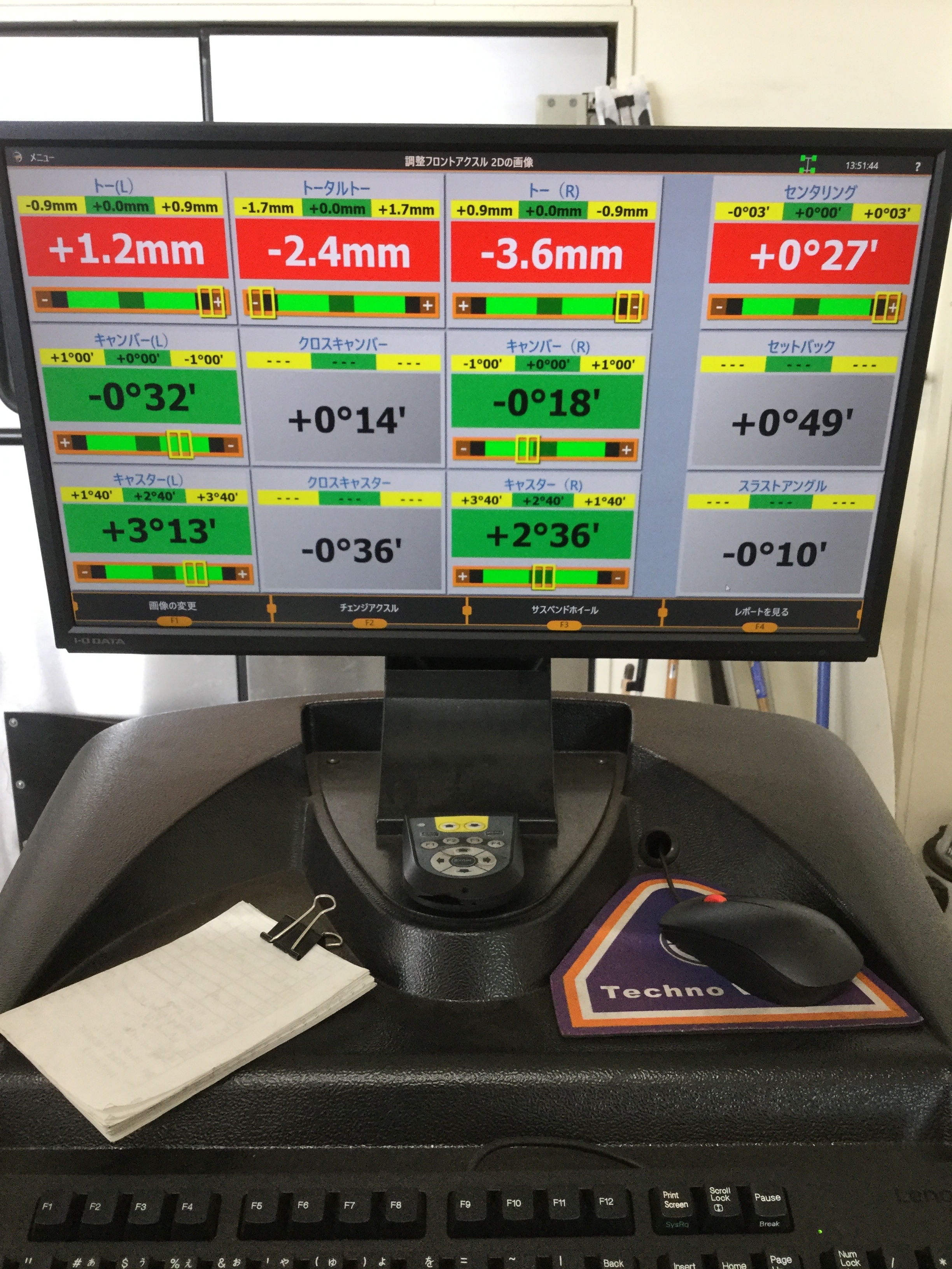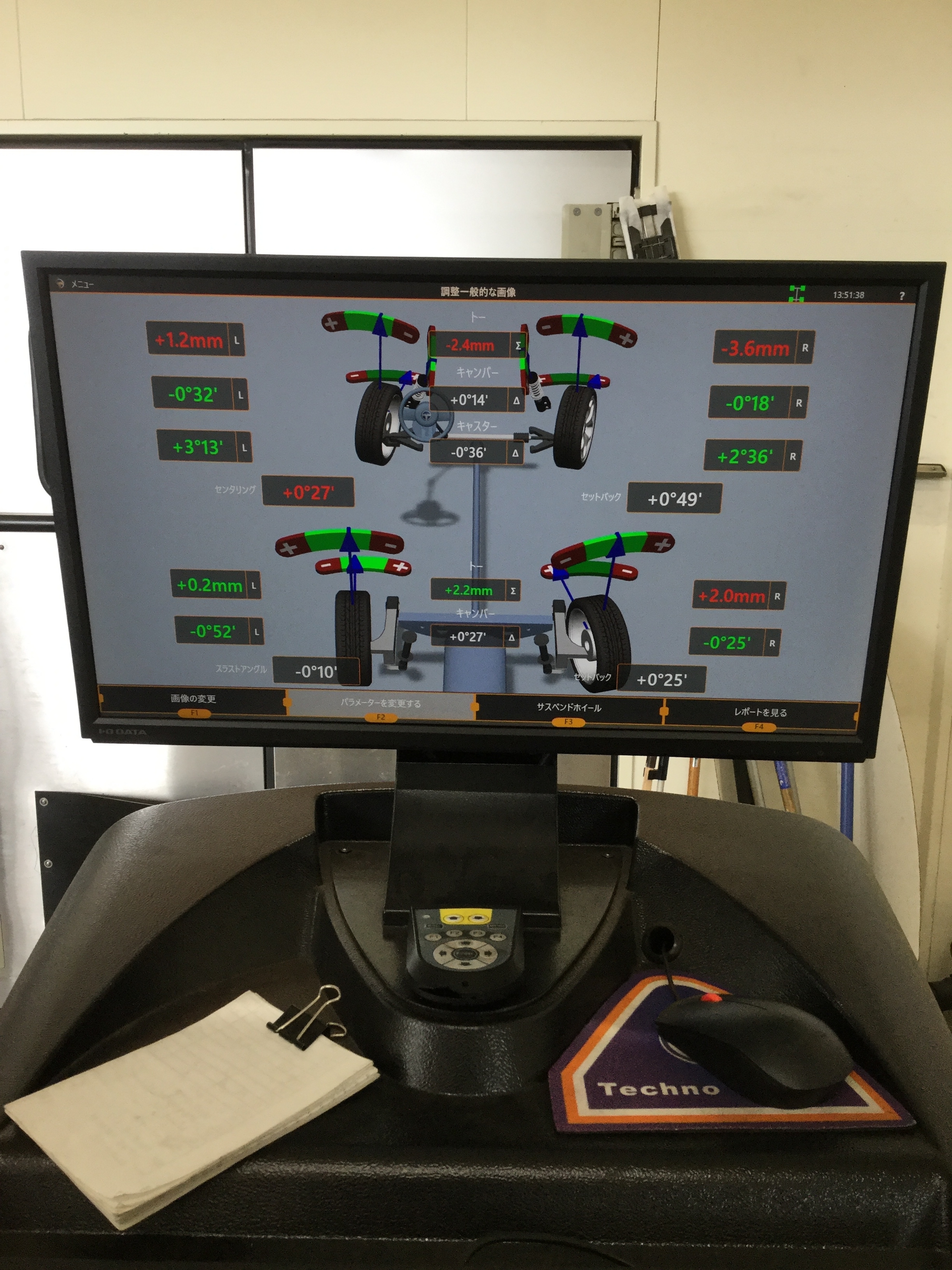 装着タイヤに偏摩耗が見受けられたので、お客様にご提案しアライメント作業をさせて頂きました!