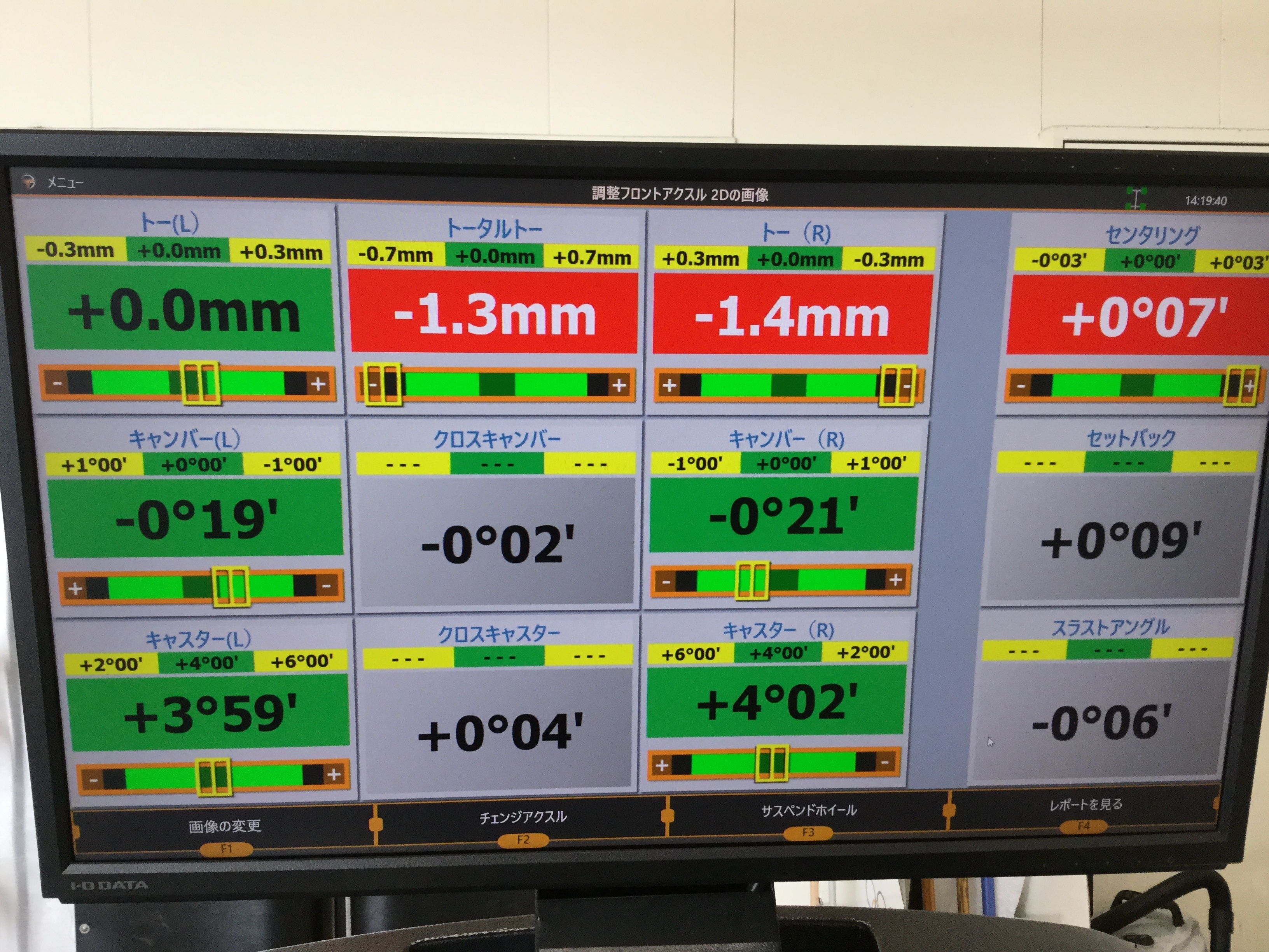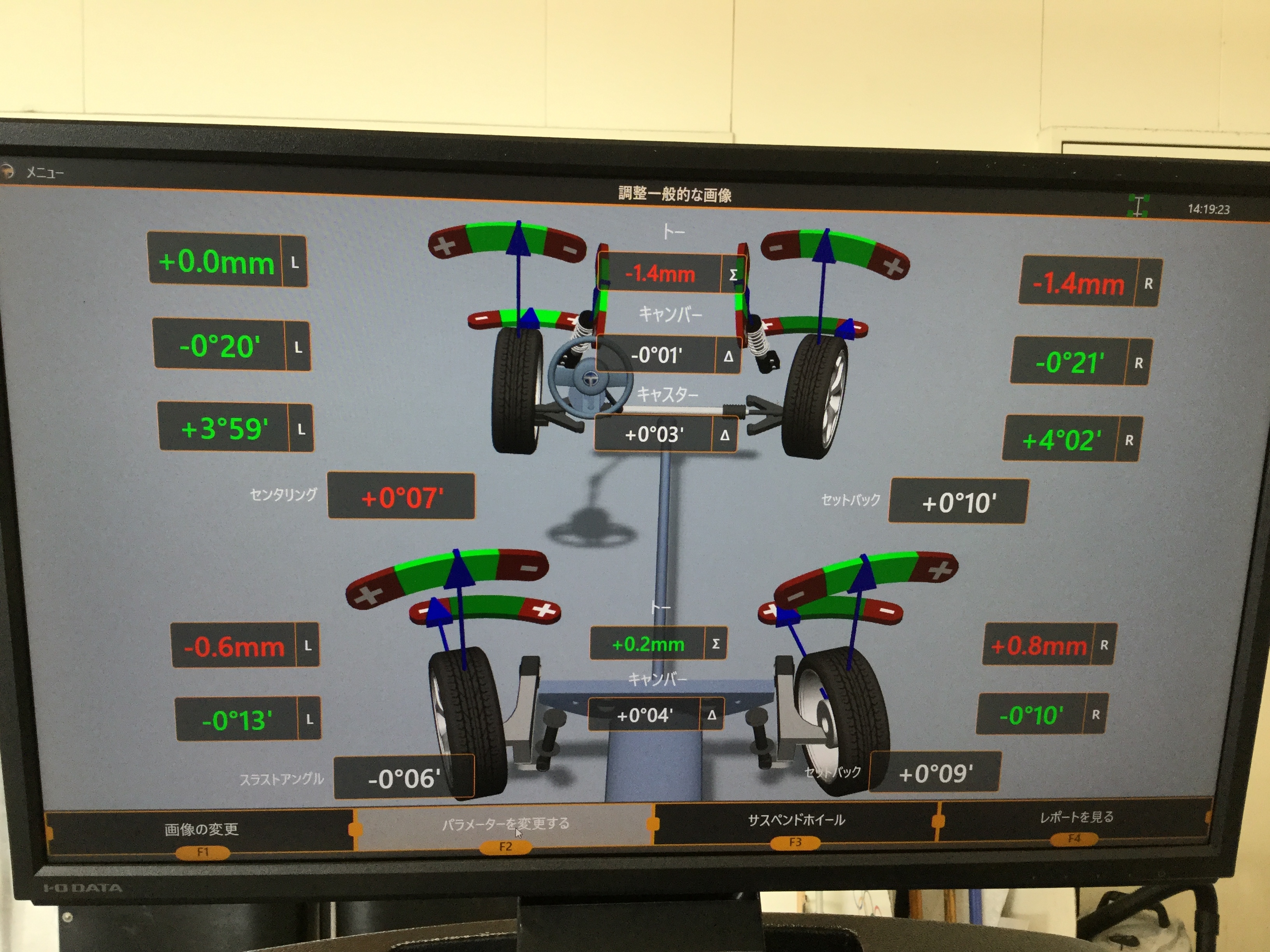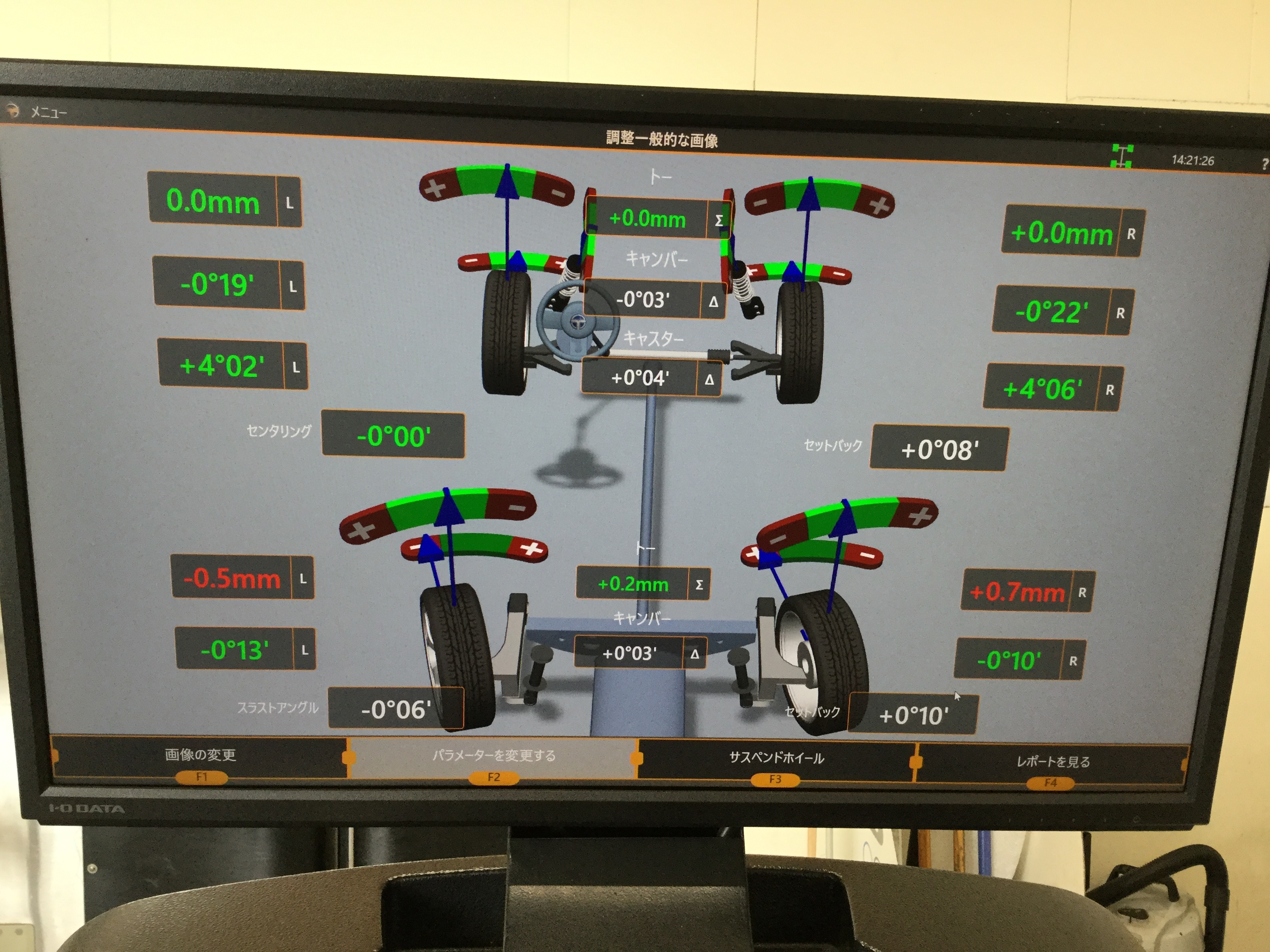 右前のタイヤの偏摩耗が激しかったので、このズレが原因かと思われます。