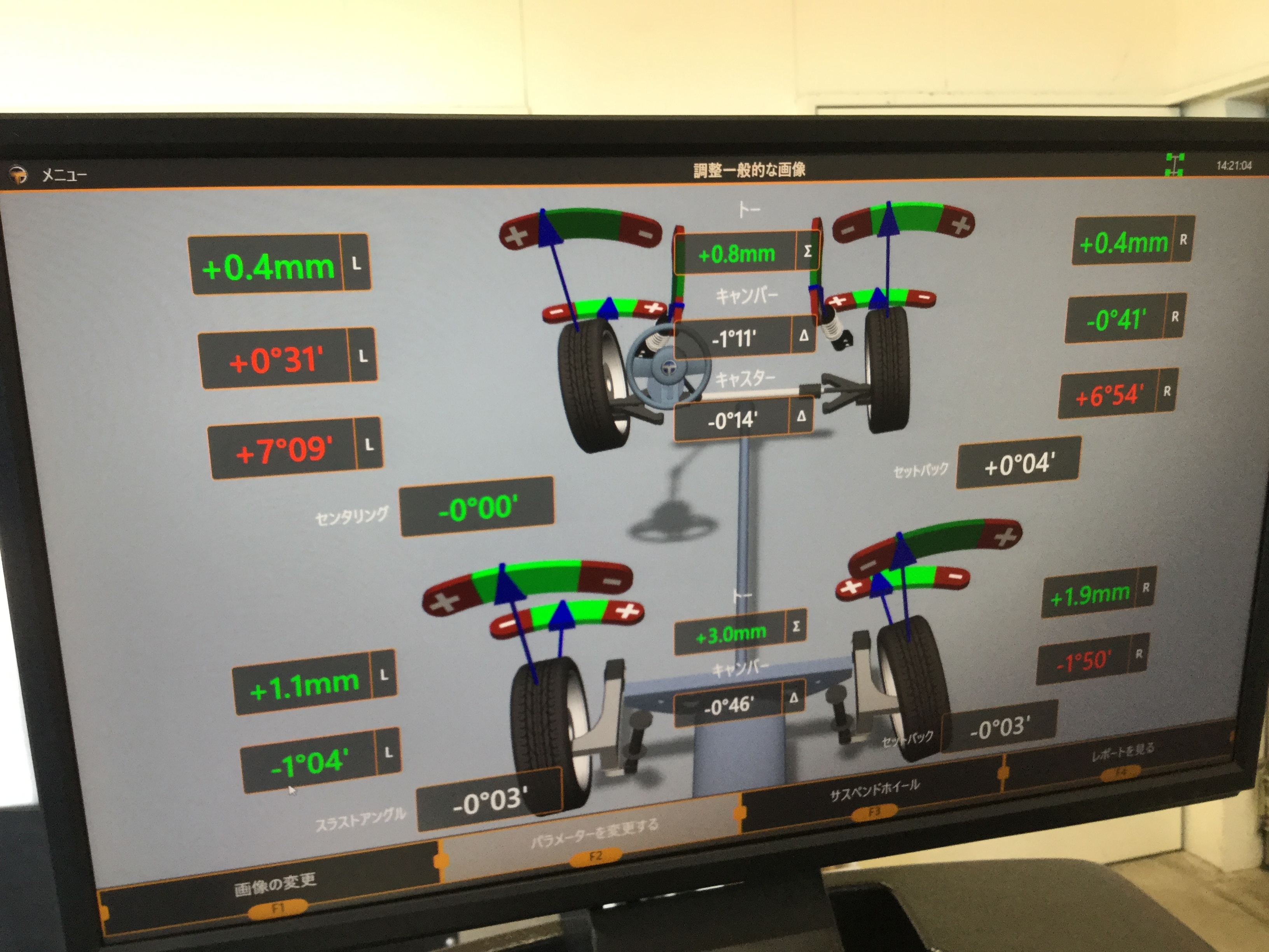 片方だけ極端に減ってワイヤーまで摩耗が進み、バーストしてしまうという危険性がありますが、アライメントを正常値に調整することで改善されます!
