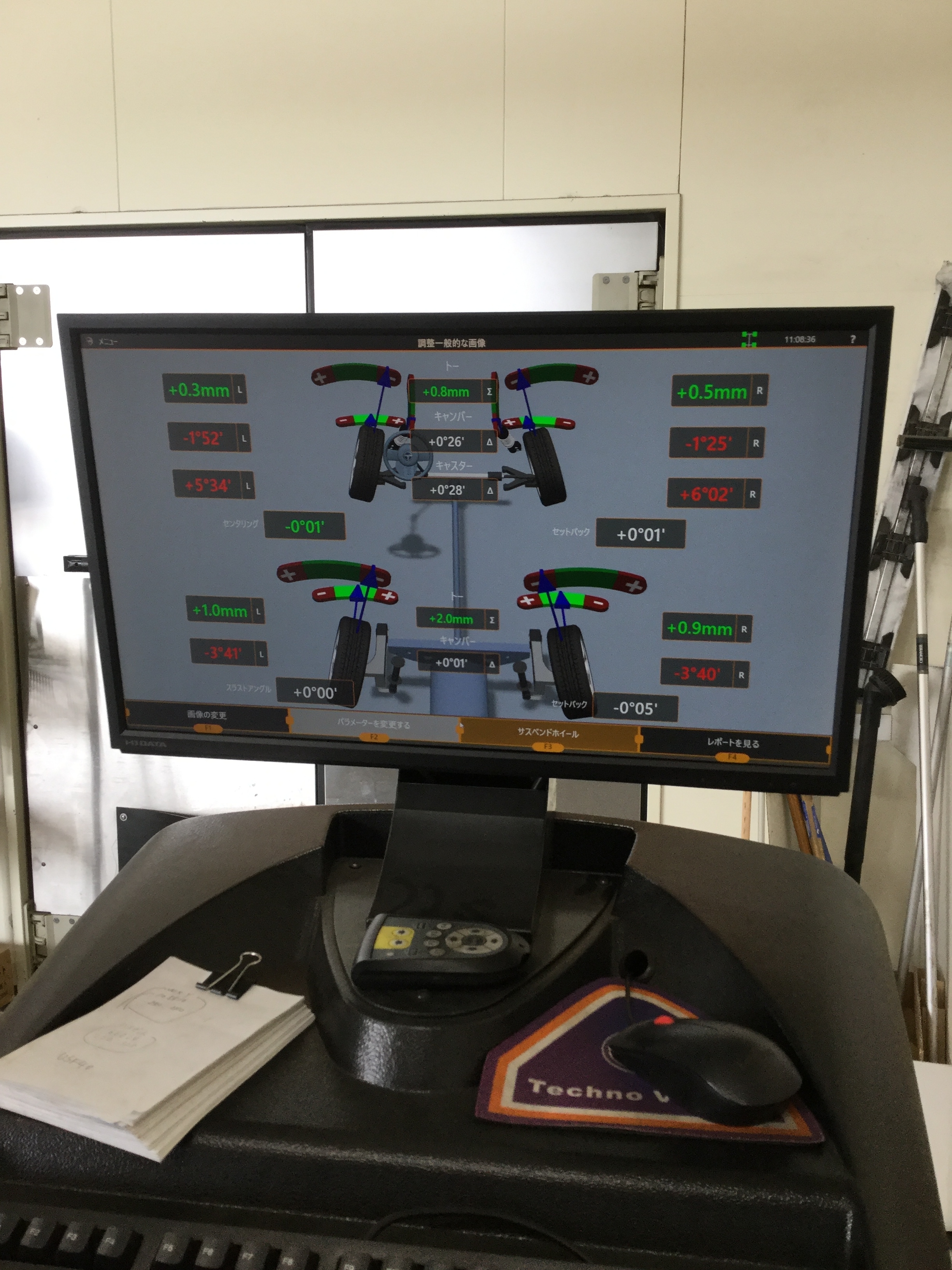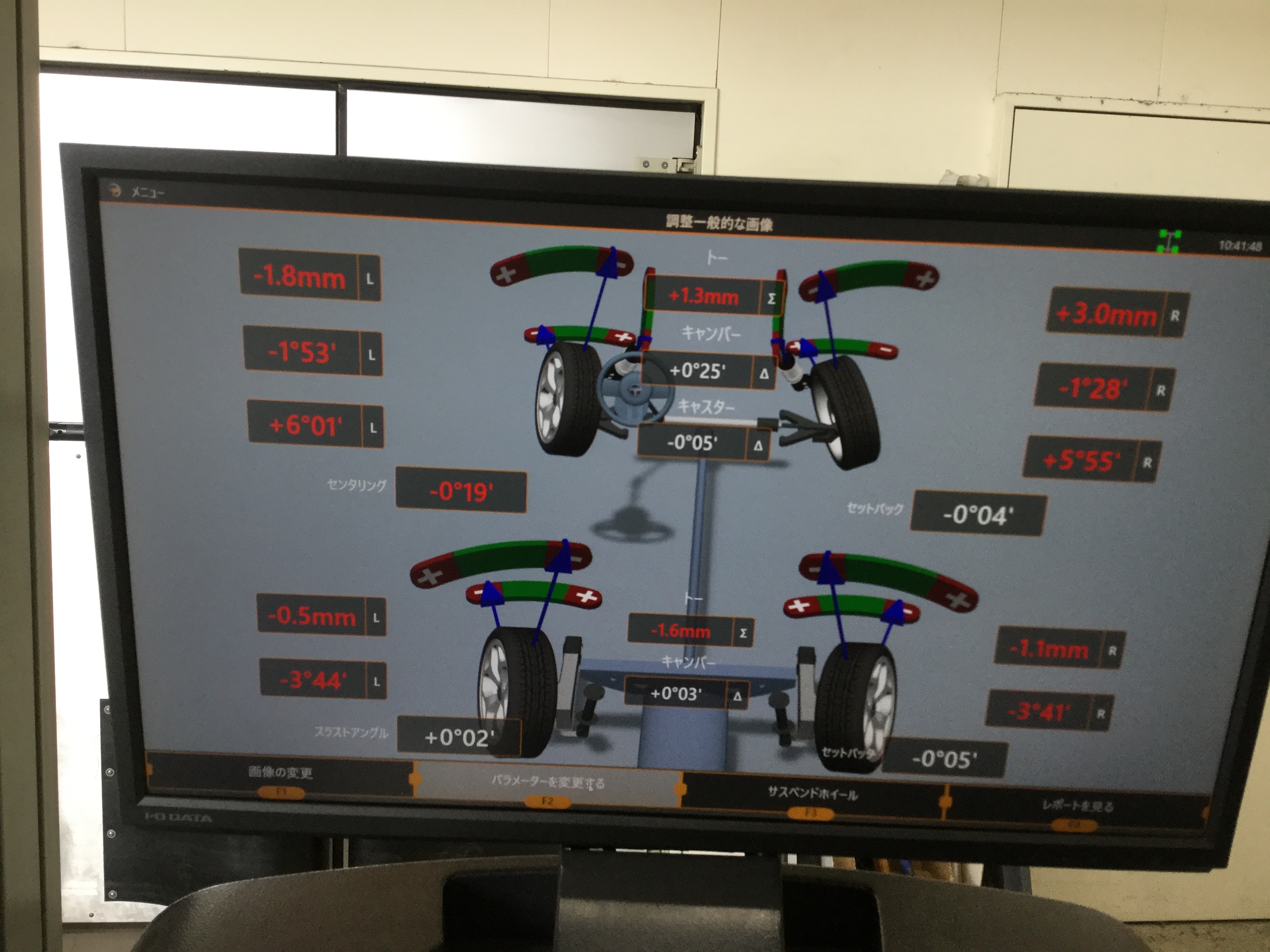 こちらのお車は、フロント、リア共にトー調整出来る車種だった為、多少の誤差があるものの、しっかりとトーを標準値まで合わさせて頂きました。