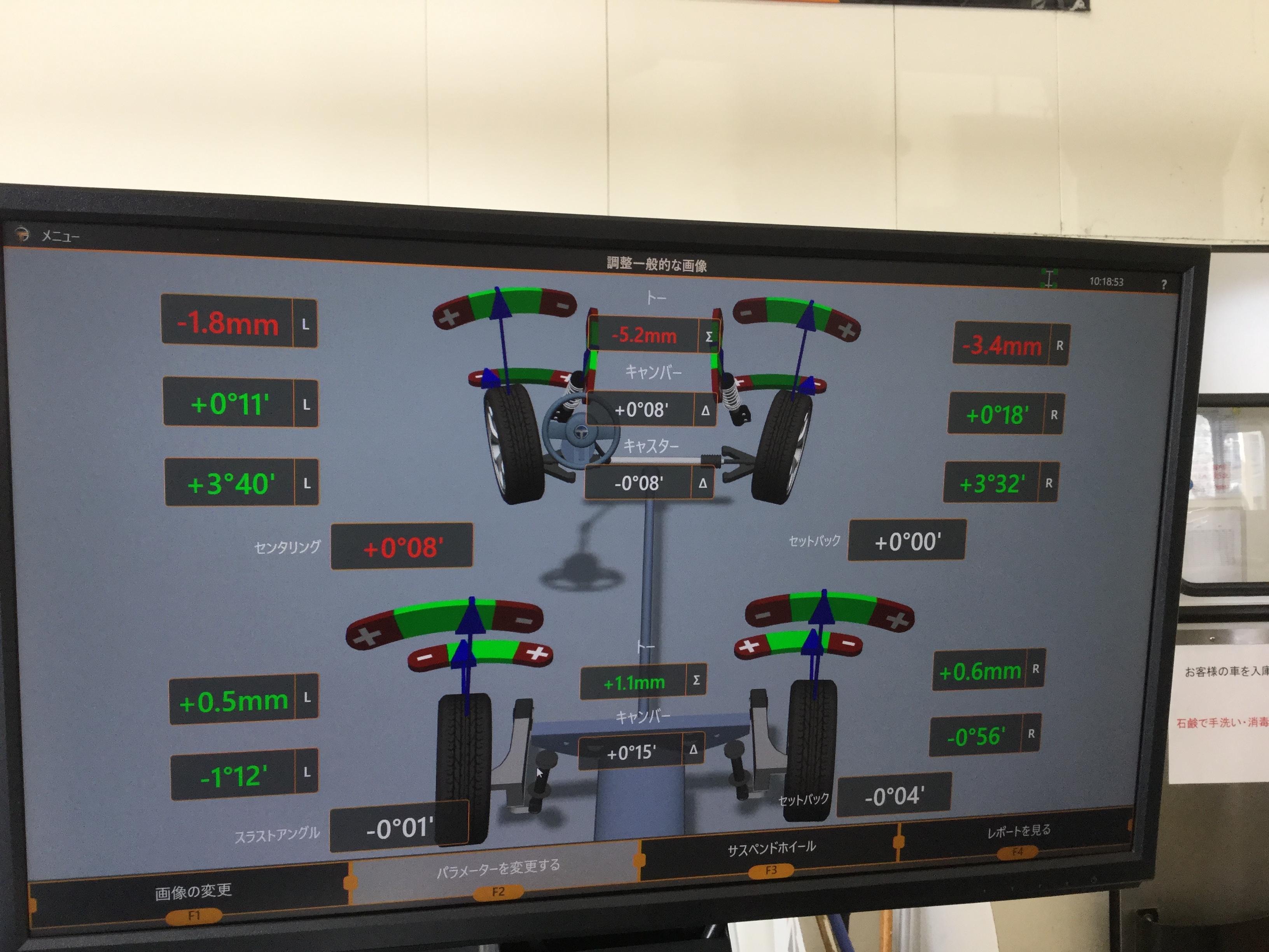 こちらのお車ですが、走行距離が3万km距離ちょっとで、走行距離が少なかったのですが、Frの片減りが強めで、左右差がかなり有りました。特に右前トー角が大きくズレていましたので、基準値に調整させて頂きました!!