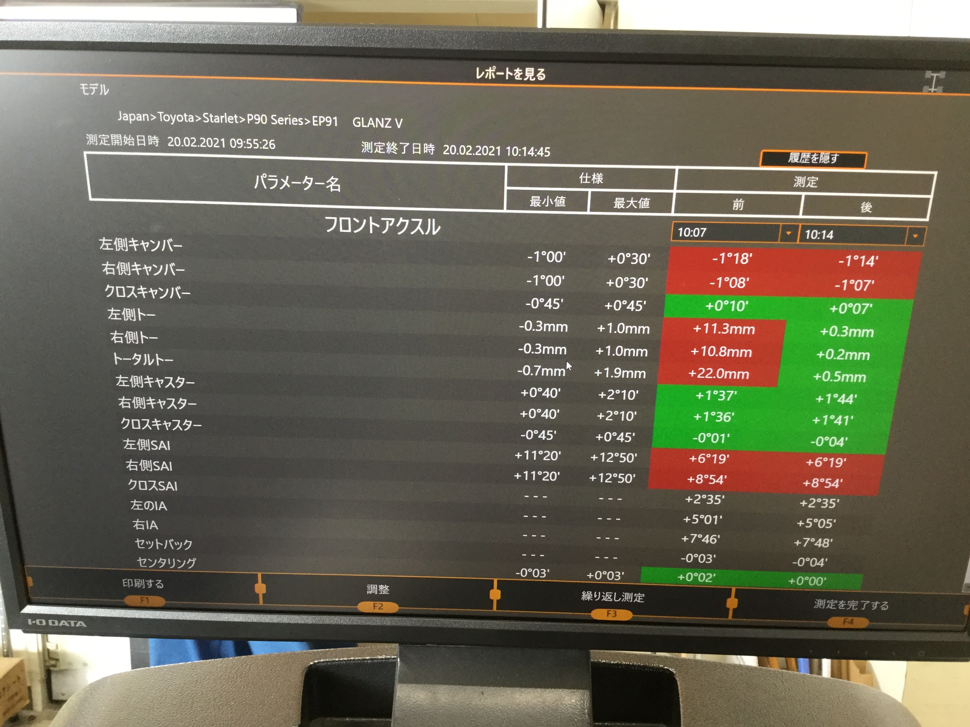 測定した結果、フロントがかなりトーインになっていたので基準値に調整・・・