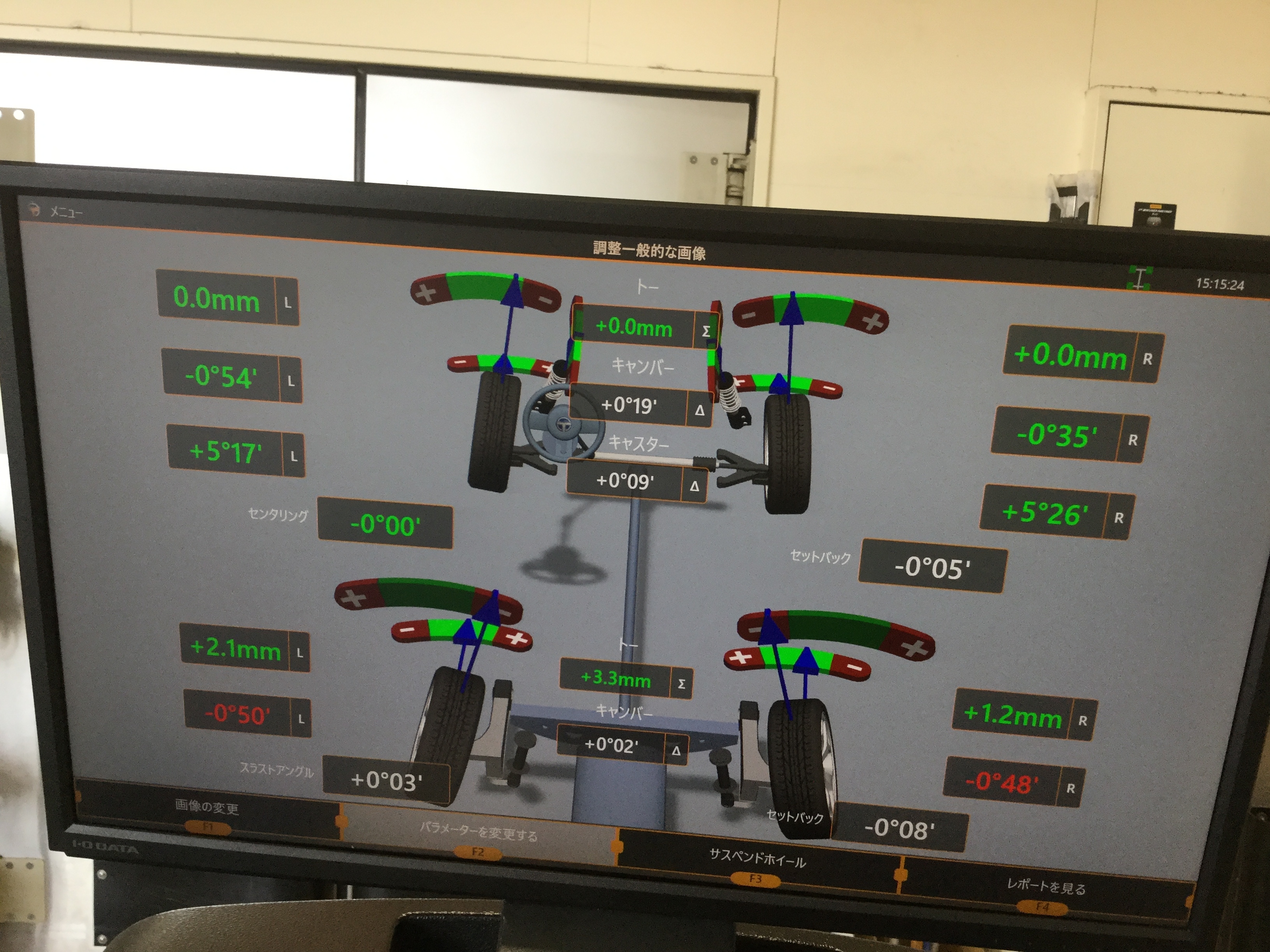 走行距離1000km台とまだまだ納車ホヤホヤですが、車高調を取付されたとのことで、ご依頼頂きました。ハンドルセンターが若干ズレているとのことでした。それでは測定結果をどうぞ!!