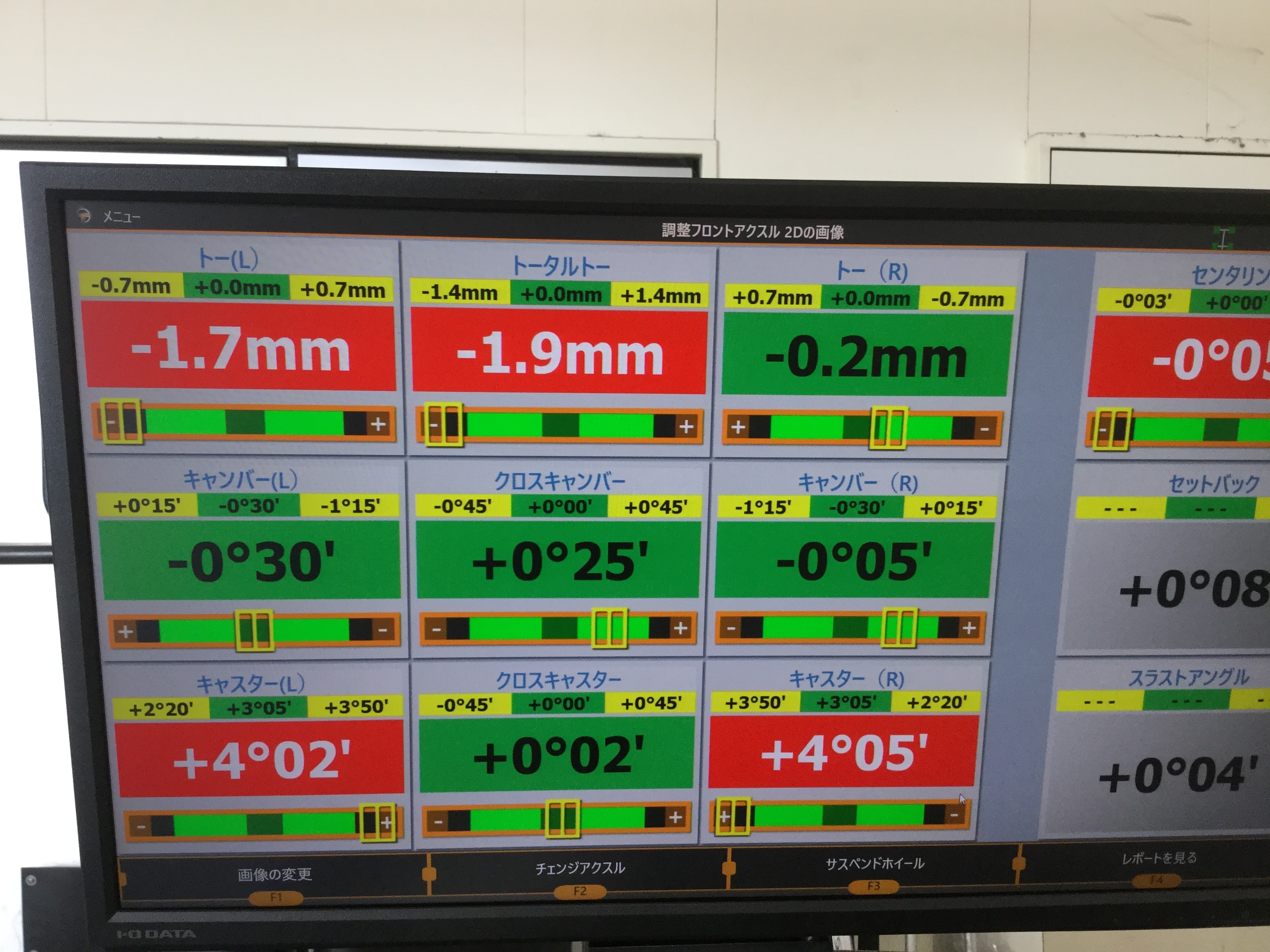特に左フロントトー角が‐1.7mmと大きくズレてしました!!