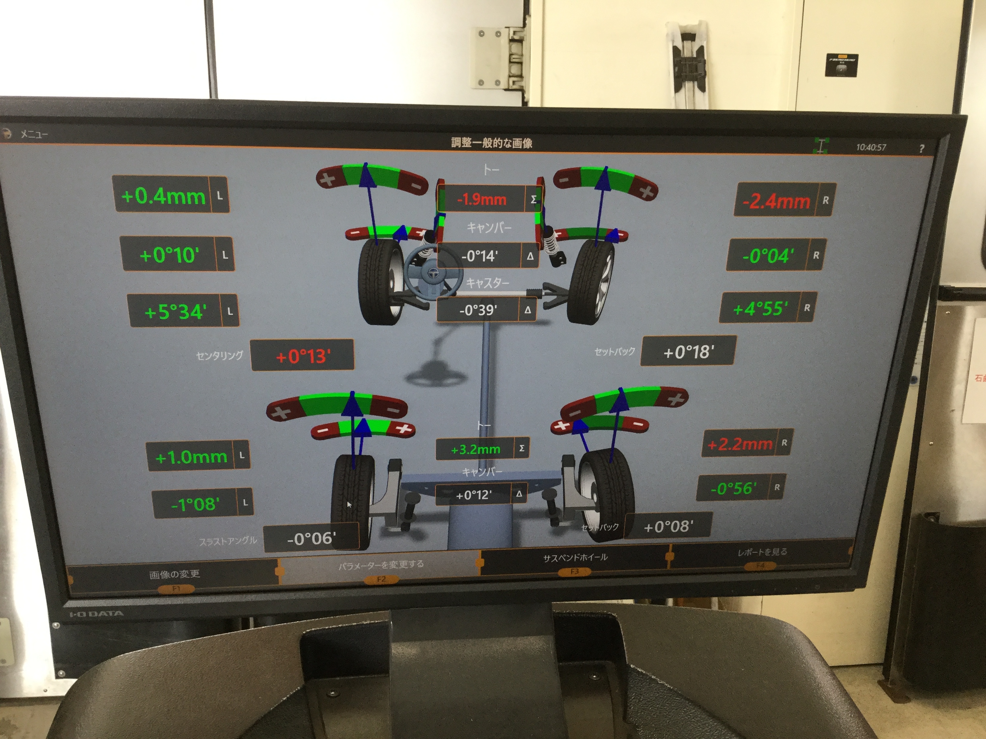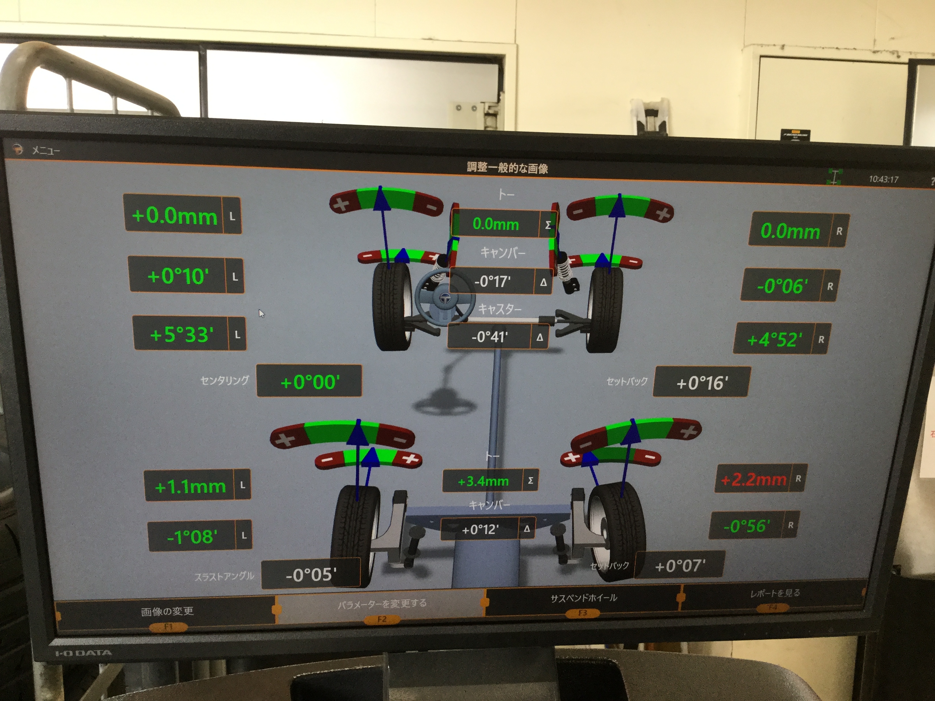 コチラのお車はフロントトー角のみ調整が可能ですので、左右共に基準値 0に調整いたしました↓↓↓↓↓