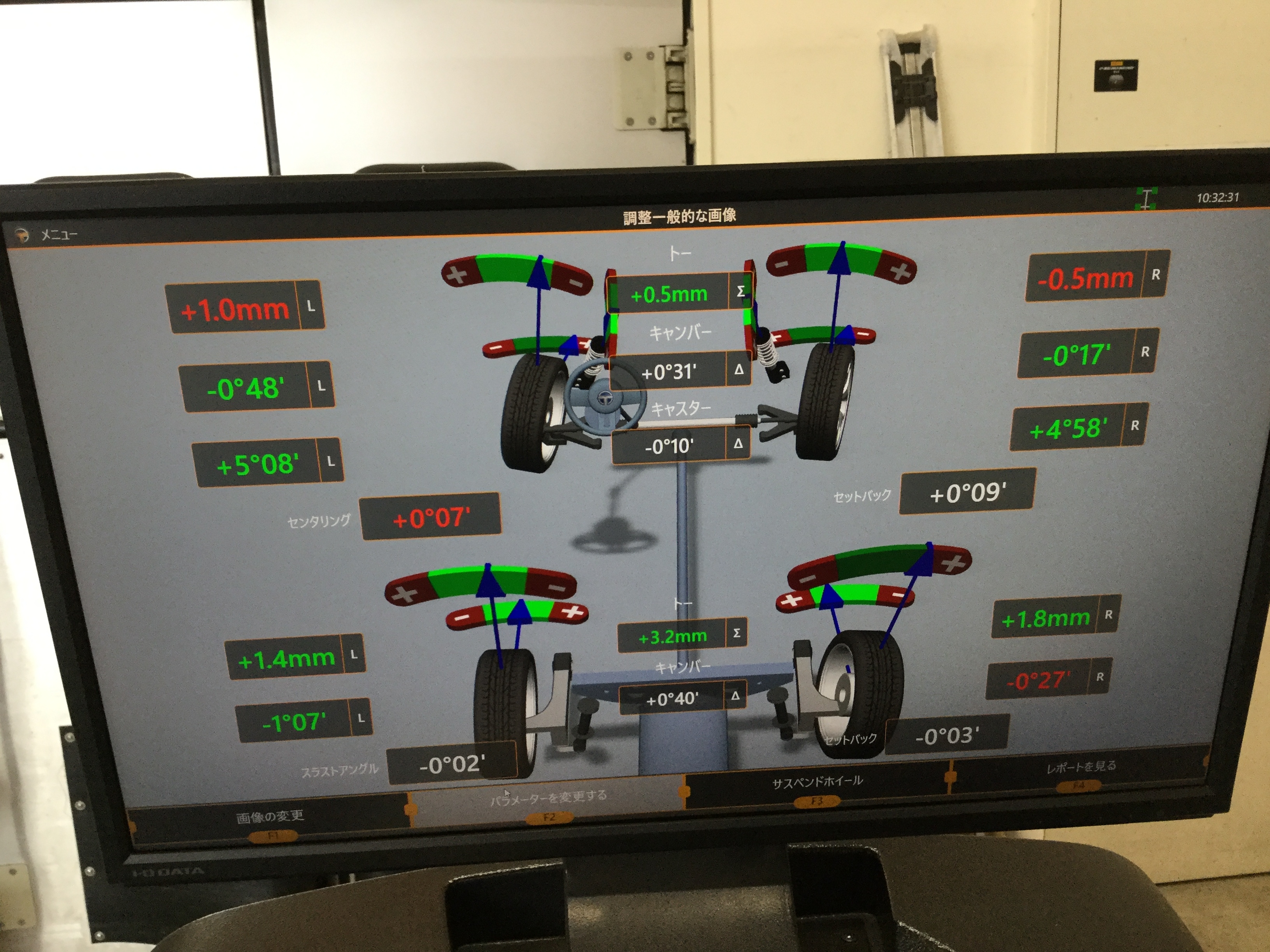 トー角において、左前は+1.0mm、右前は-0.5mmとなっており、ハンドルセンターのズレが見受けられました!!