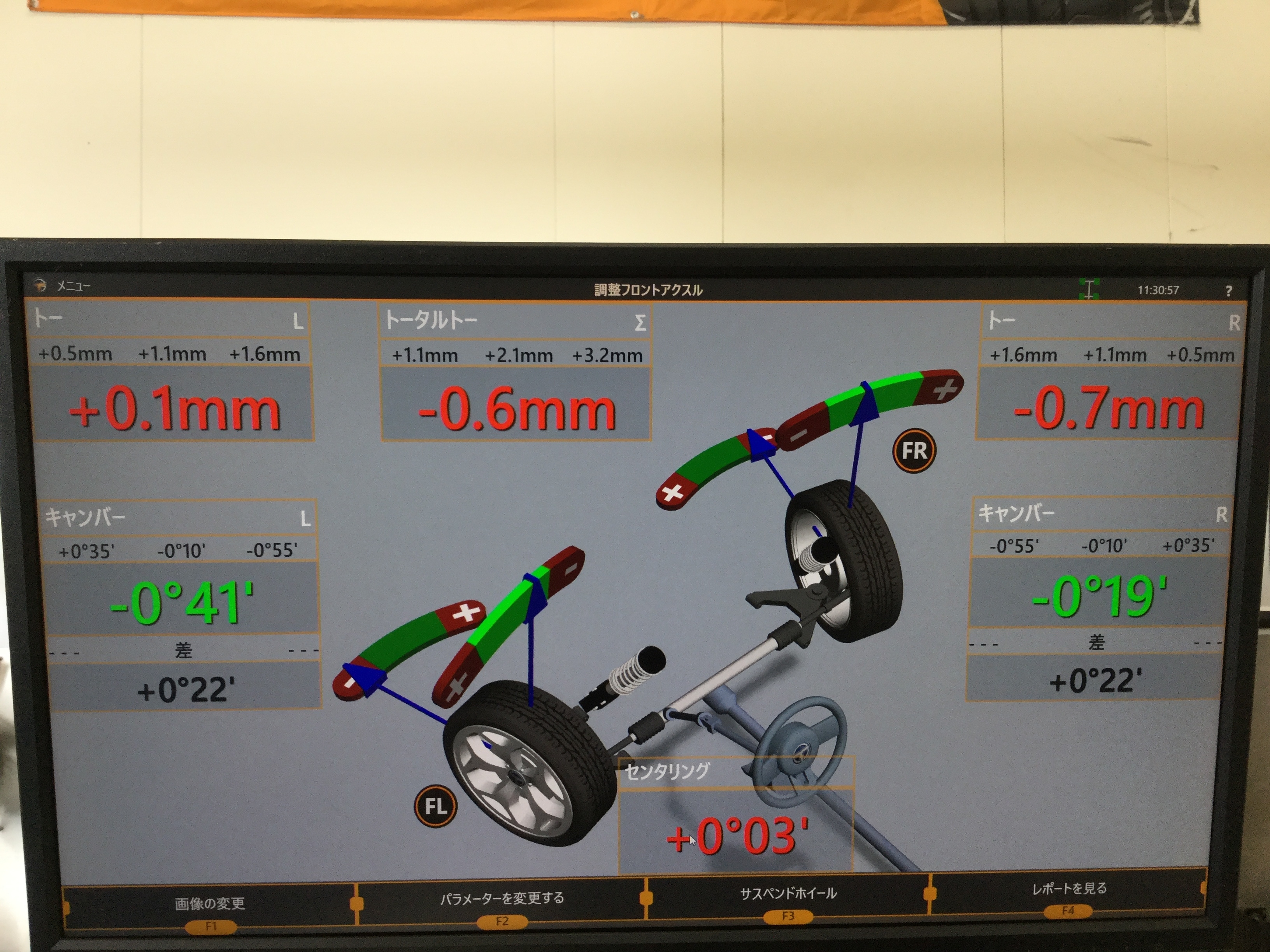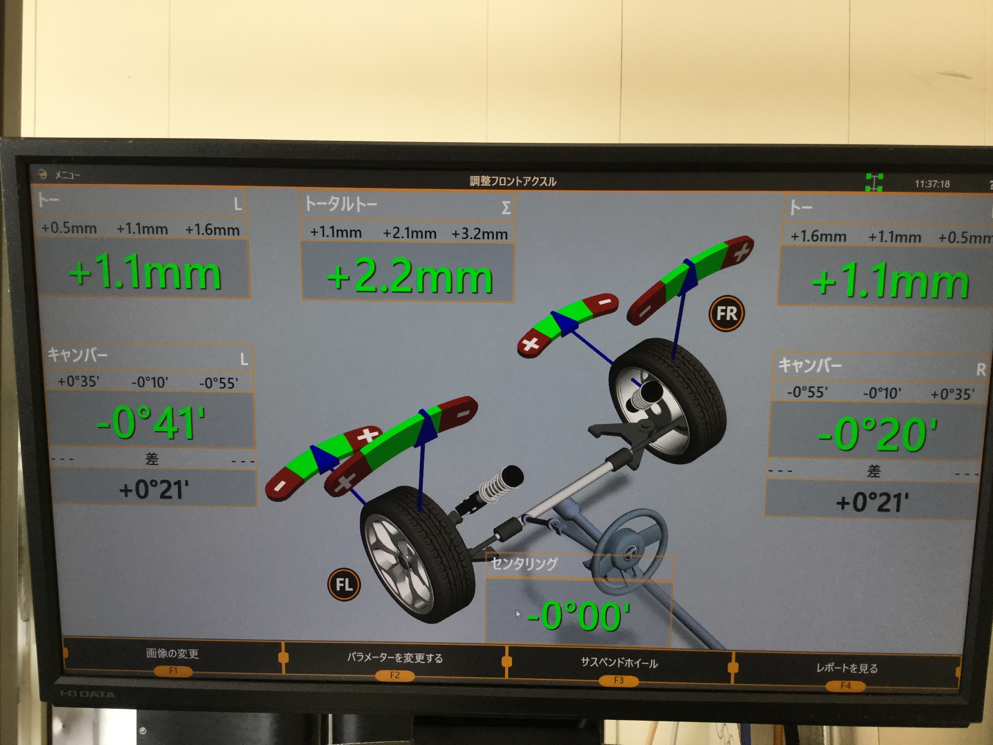 ↓↓↓↓コチラのお車はフロントトー角の調整のみ可能ですので、基準値+1.1mmに左右共に調整いたしました↓↓↓↓