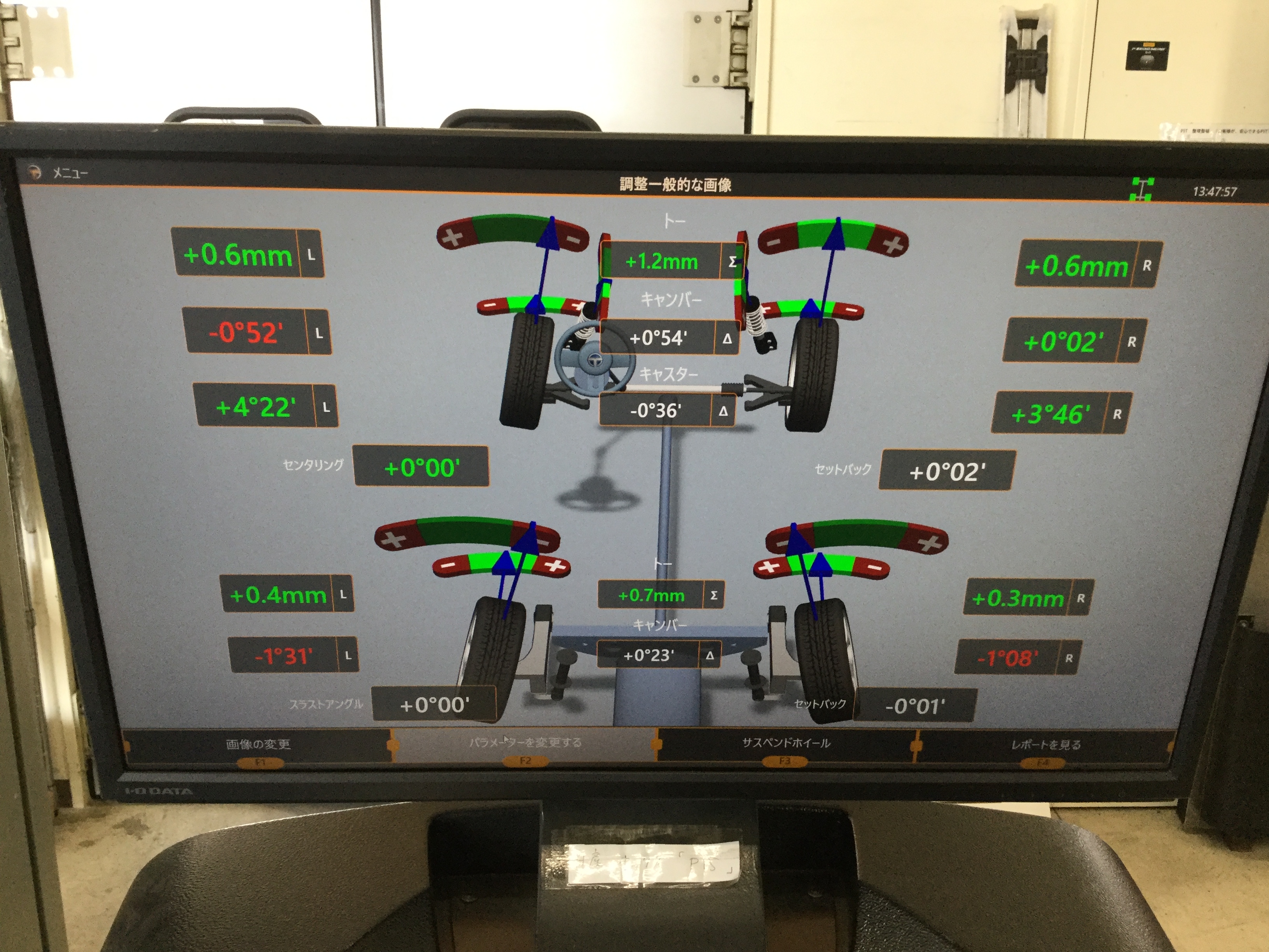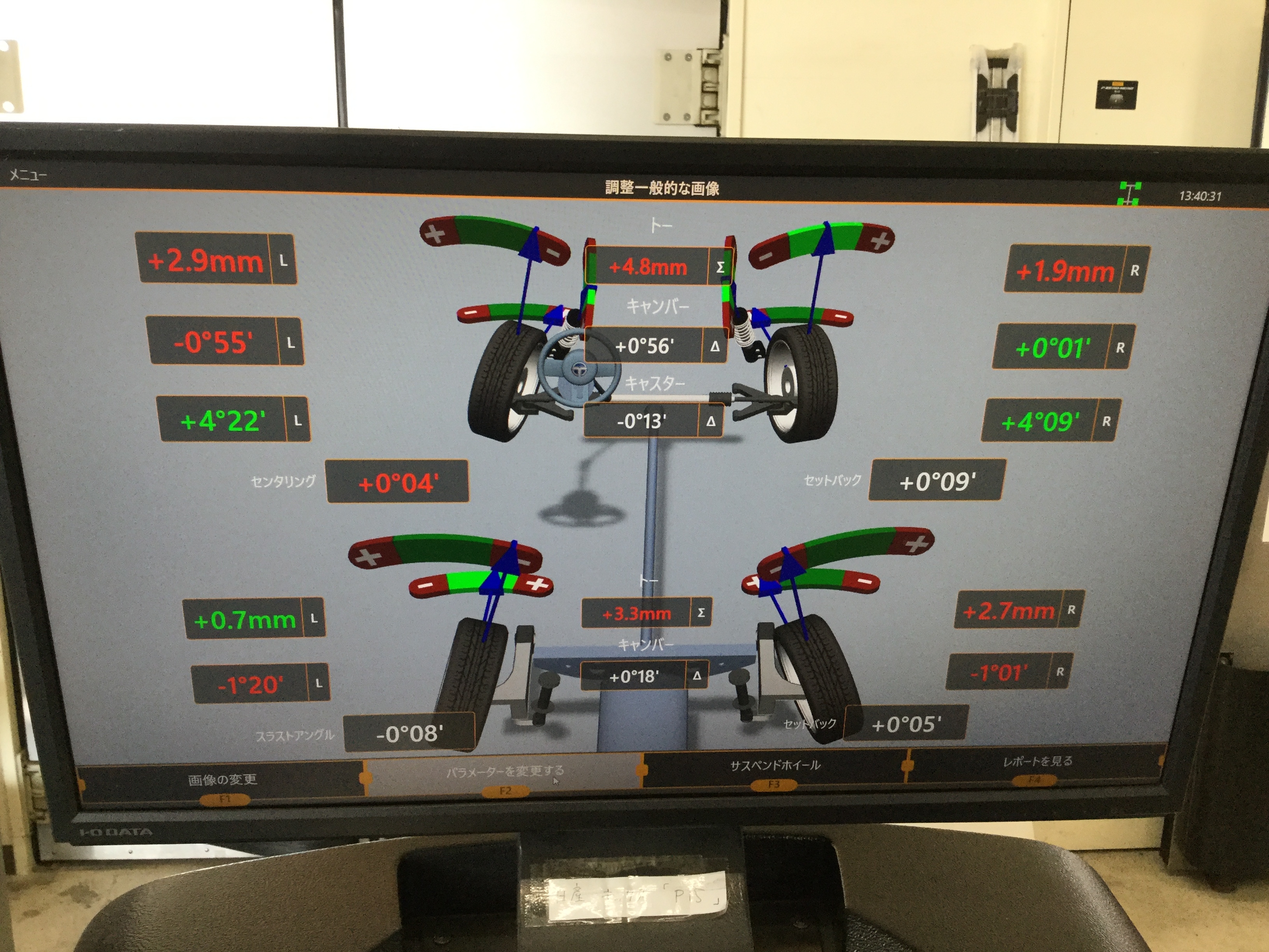 ↓↓↓↓コチラのお車は前後トー角の調整が可能ですので、フロントトー角は基準値+0.6mm、リアトー角は基準値+0.3mmに調整いたしました↓↓↓↓