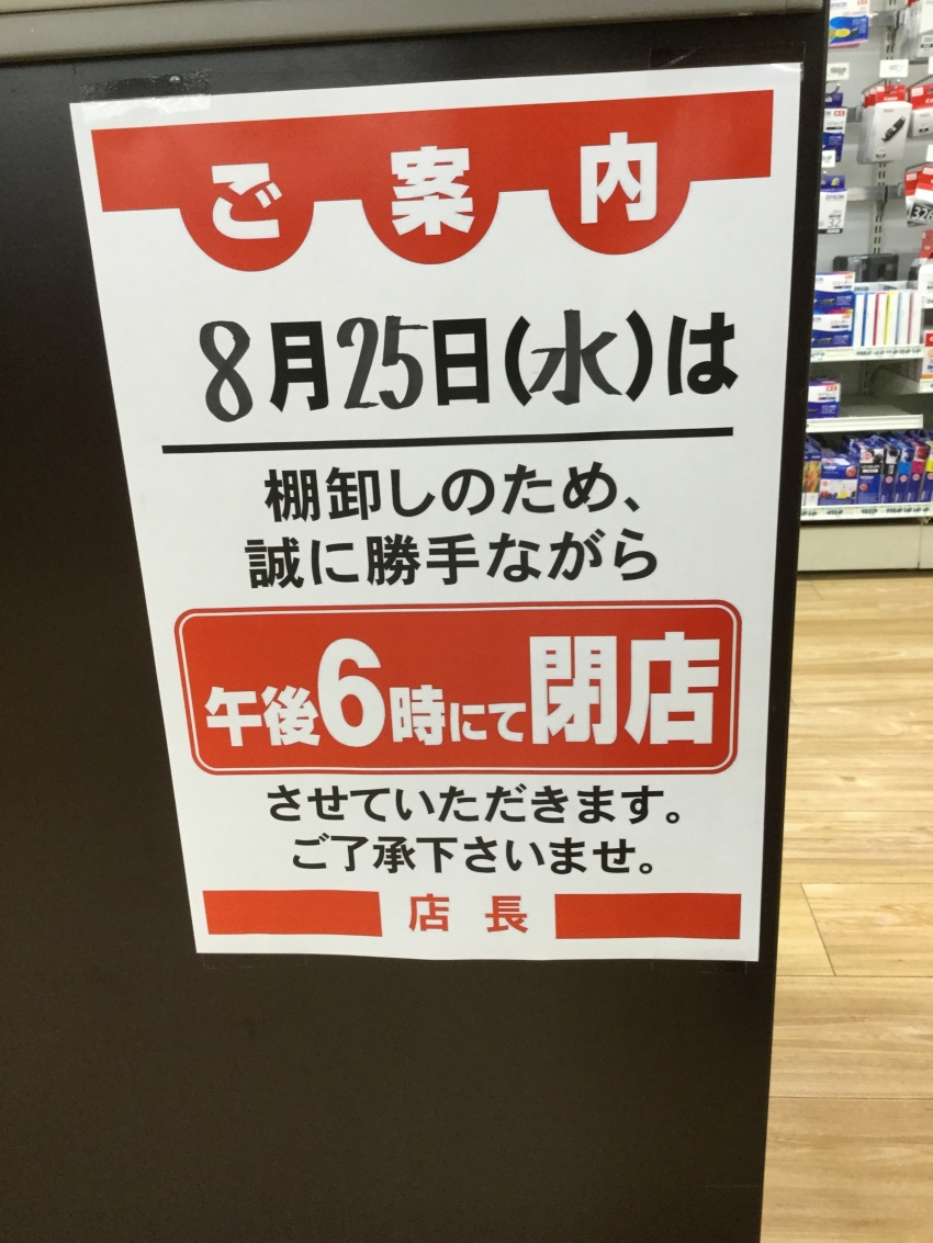 8月 25日(水)は棚卸しのため、誠に勝手ながら午後6時までの営業となっております。