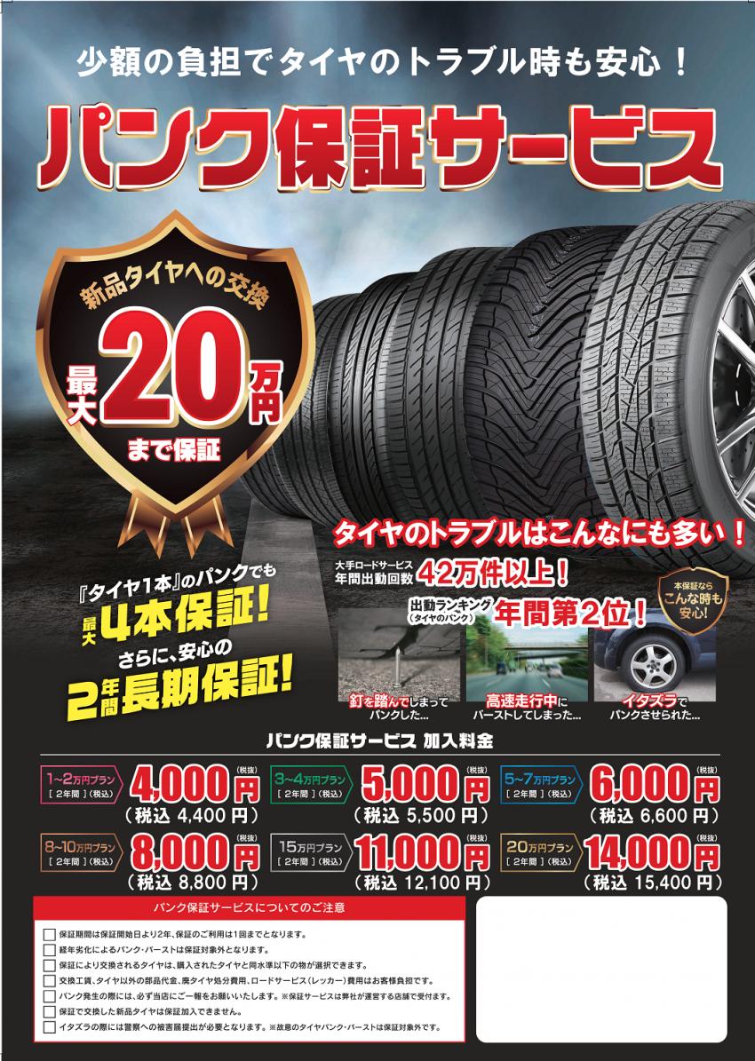 パンクした時は新品4本が保証され非常にお得になります。
