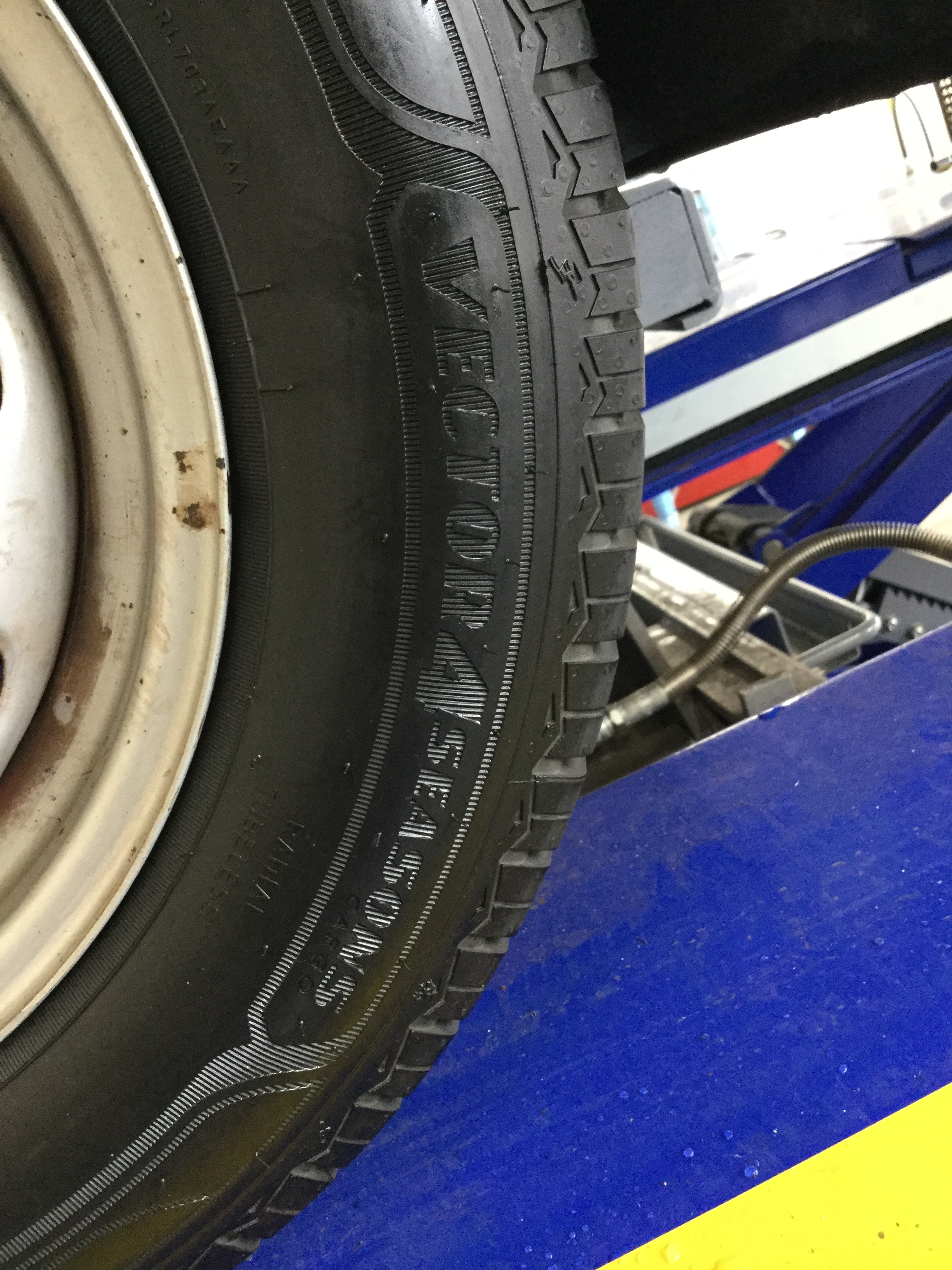 お話をお伺いすると、ほとんど使用していないスタッドレスもお持ちだということでそちらも確認させていただくと、確かに溝はありましたが・・・、なんと製造が2001年・・・