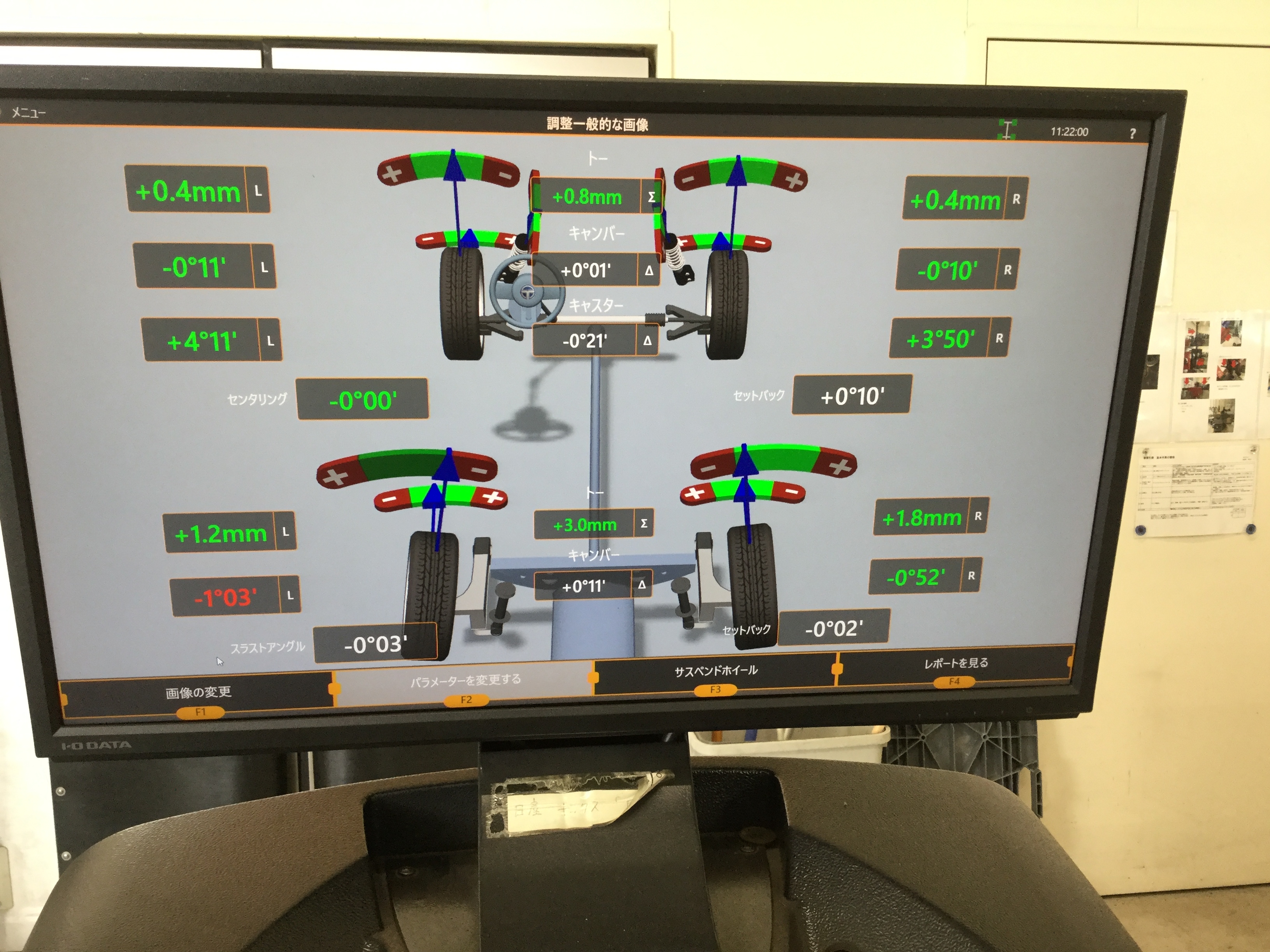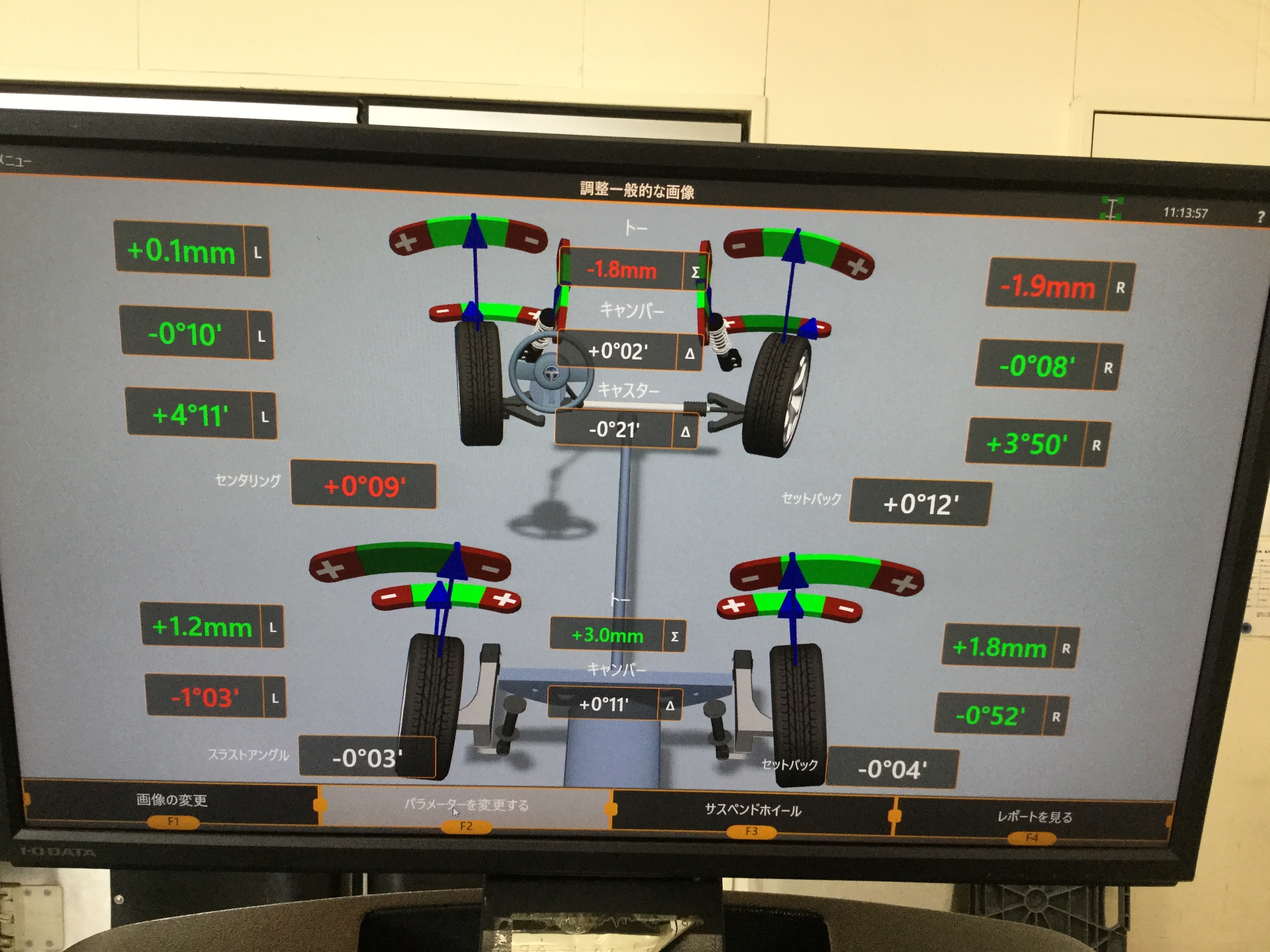 コチラのお車はフロントトー角の調整のみ可能ですので、基準値の中央値+0.4mmに左右共に調整させて頂きました!!