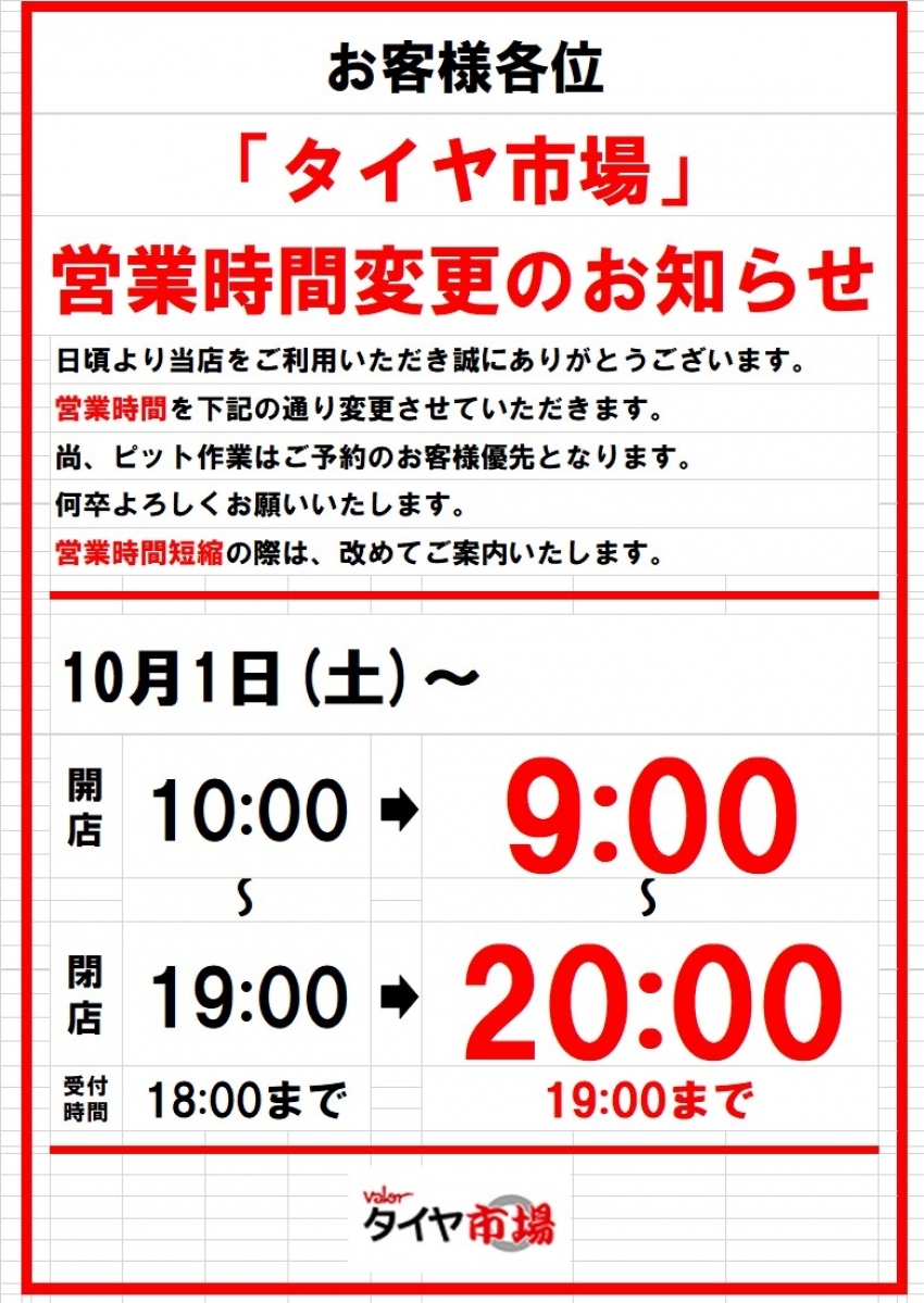 10月1日より「タイヤ市場」の営業時間を延長してご対応させていただきます。